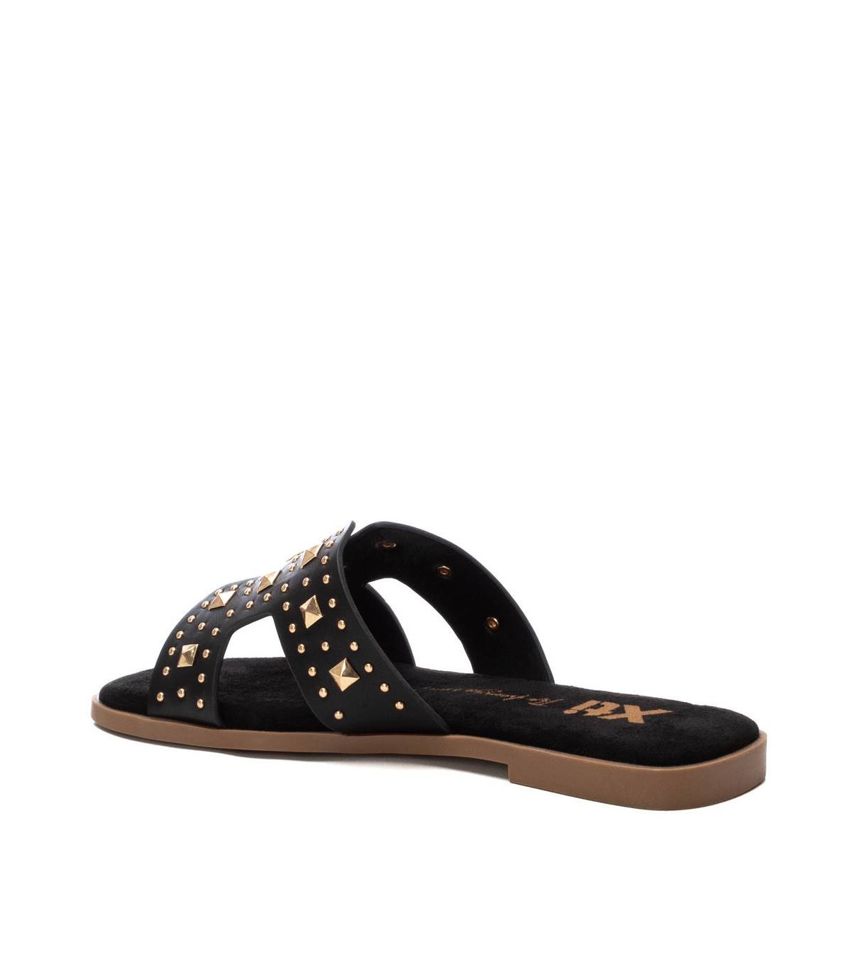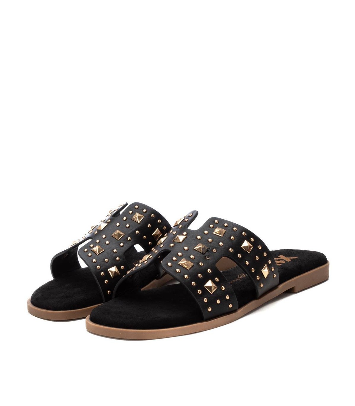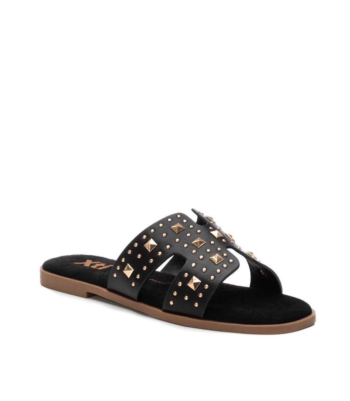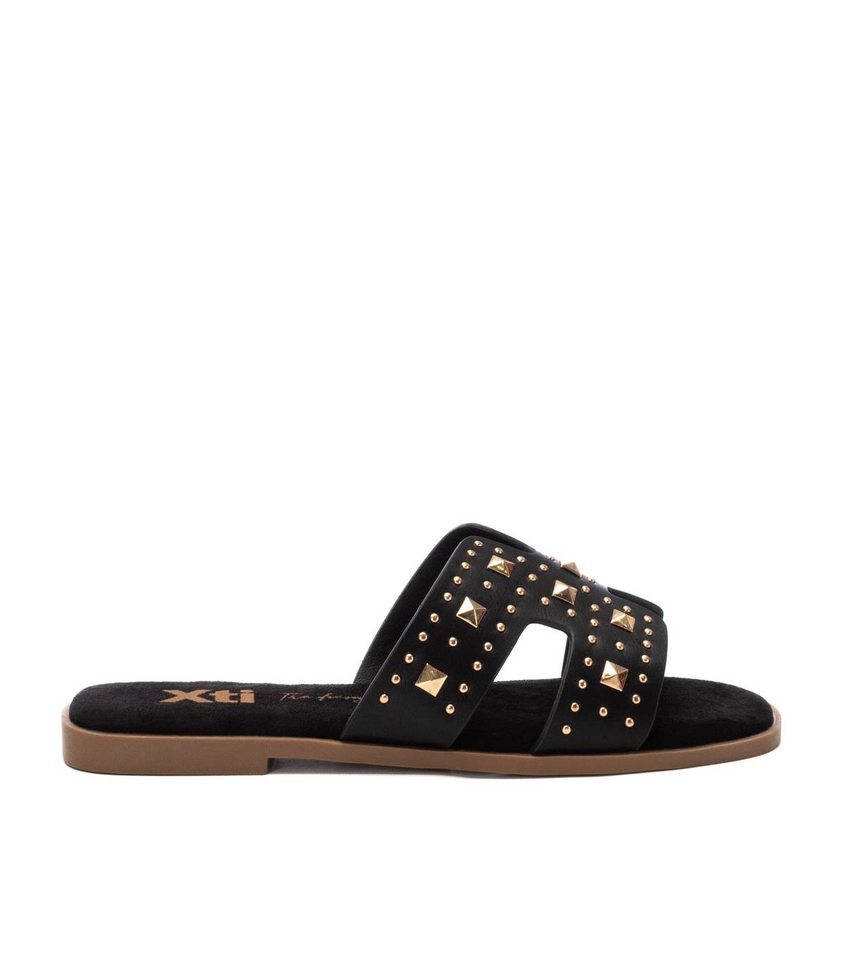 Sandalia de mujer de la marca Xti. Fabricada en material que imita a la piel. Bonito diseño de pala decorada con tachas doradas. Ideales para cualquier día o evento. Suela plana y antideslizante. Este modelo ha obtenido el certificado vegano por la organización mundial PETA (Organización de los derechos de los animales).