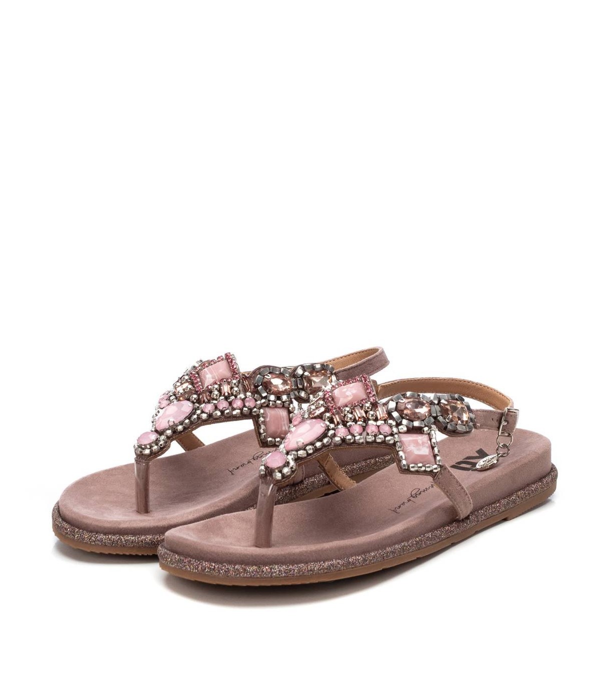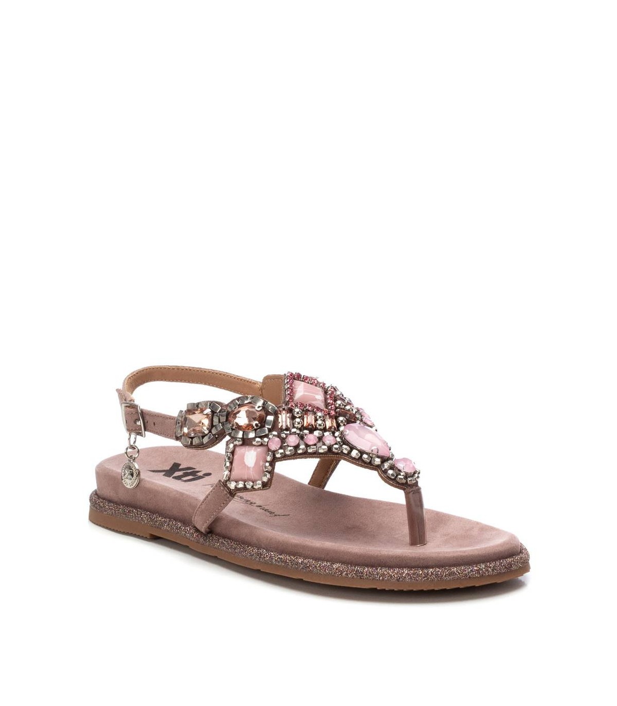 Sandalia de mujer, de la marca Xti. Fabricada en material de antelina decorada con piedras brillantes preciosas al tono. Ideales tanto para salir como para ir a trabajar. Cómodas para llevarlas durante todo el día y suela antideslizante. Este modelo ha obtenido el certificado vegano por la organización mundial PETA (Organización de los derechos de los animales).