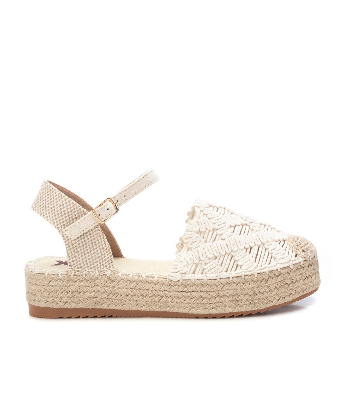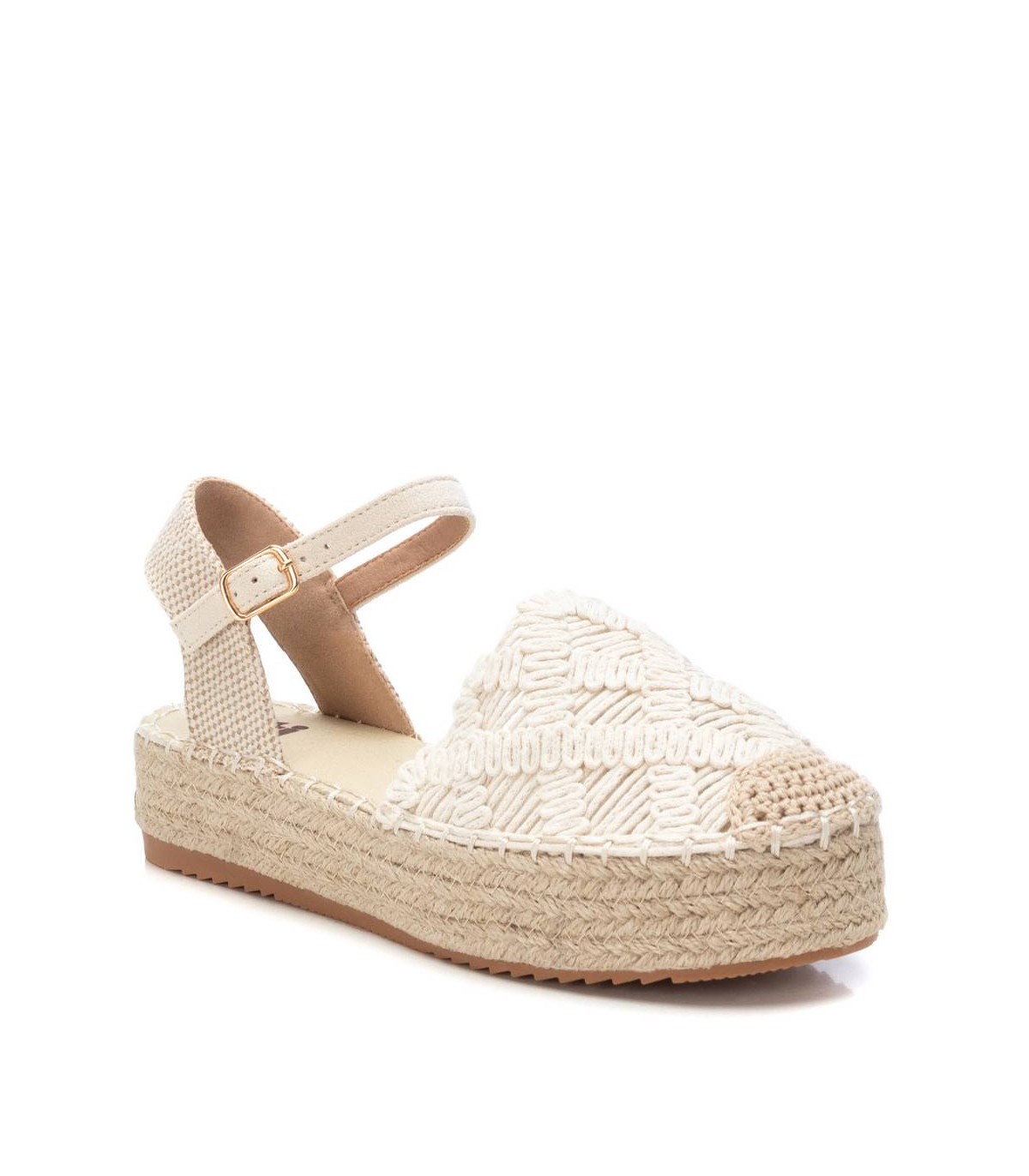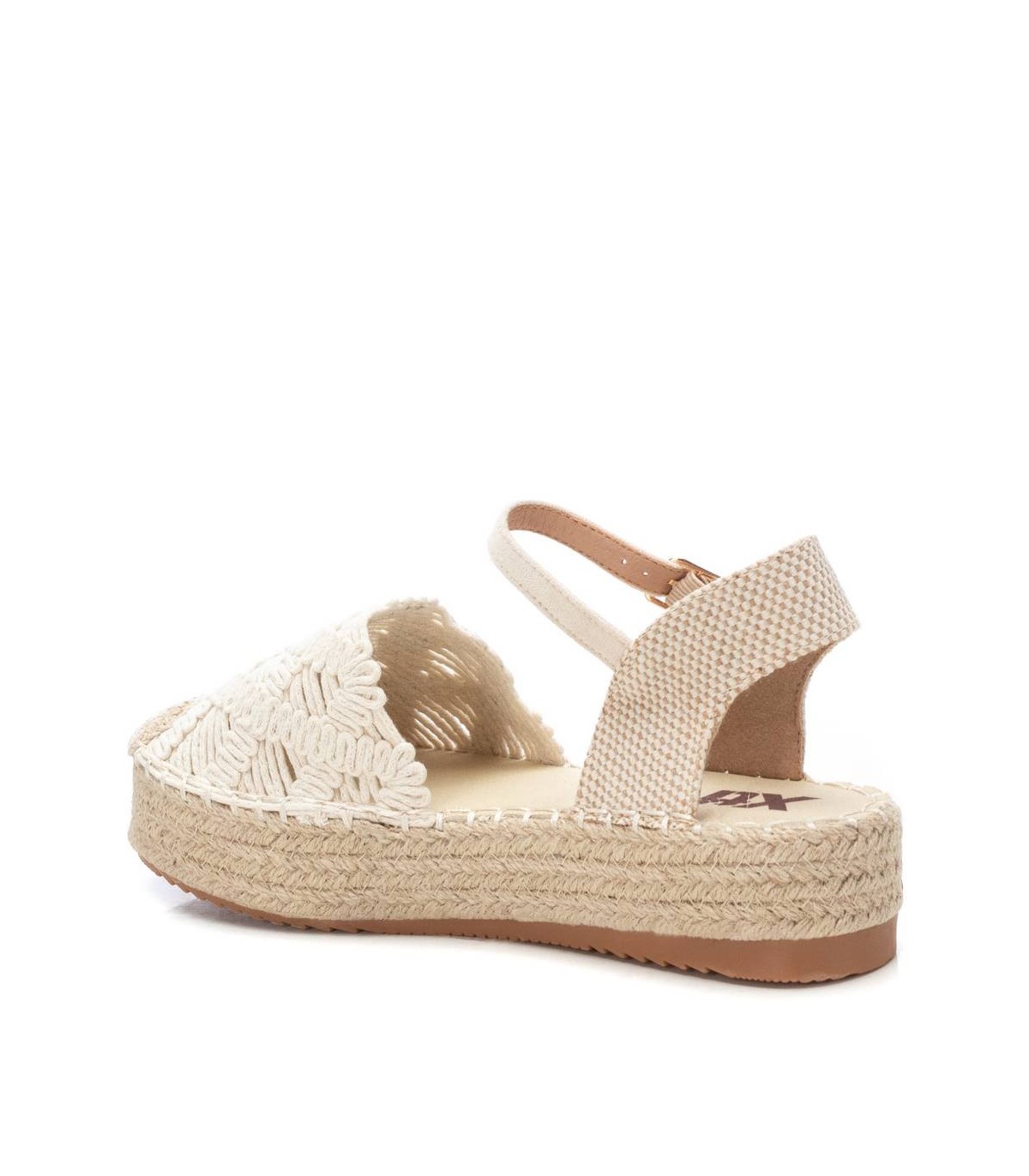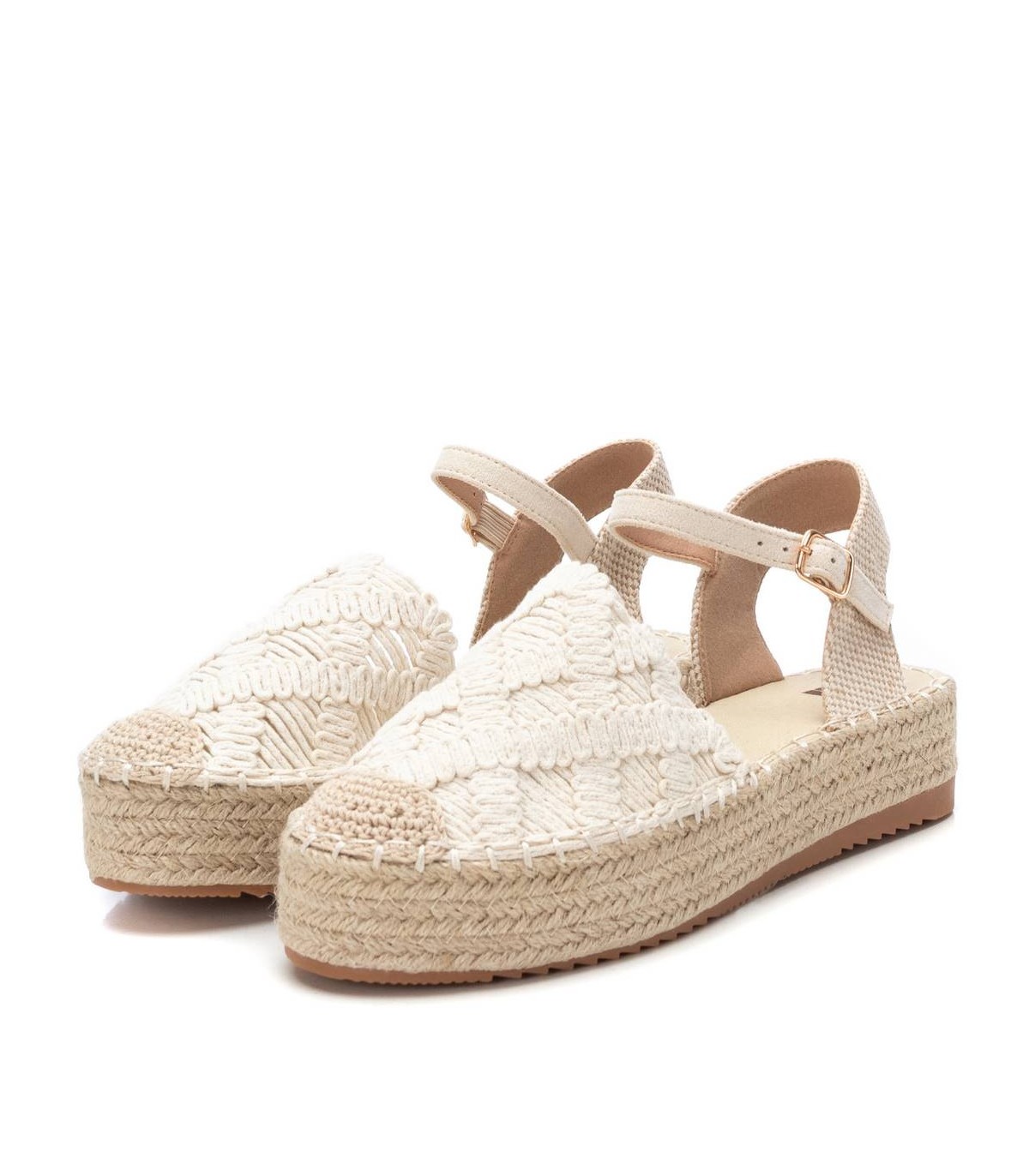 Alpargata de mujer, de la marca Xti. Fabricada en material textil crochet. Modelo plano de yute con suela antideslizante. Ideal para tus mejores conjuntos del verano. Este modelo ha obtenido el certificado vegano por la organización mundial PETA (Organización de los derechos de los animales).