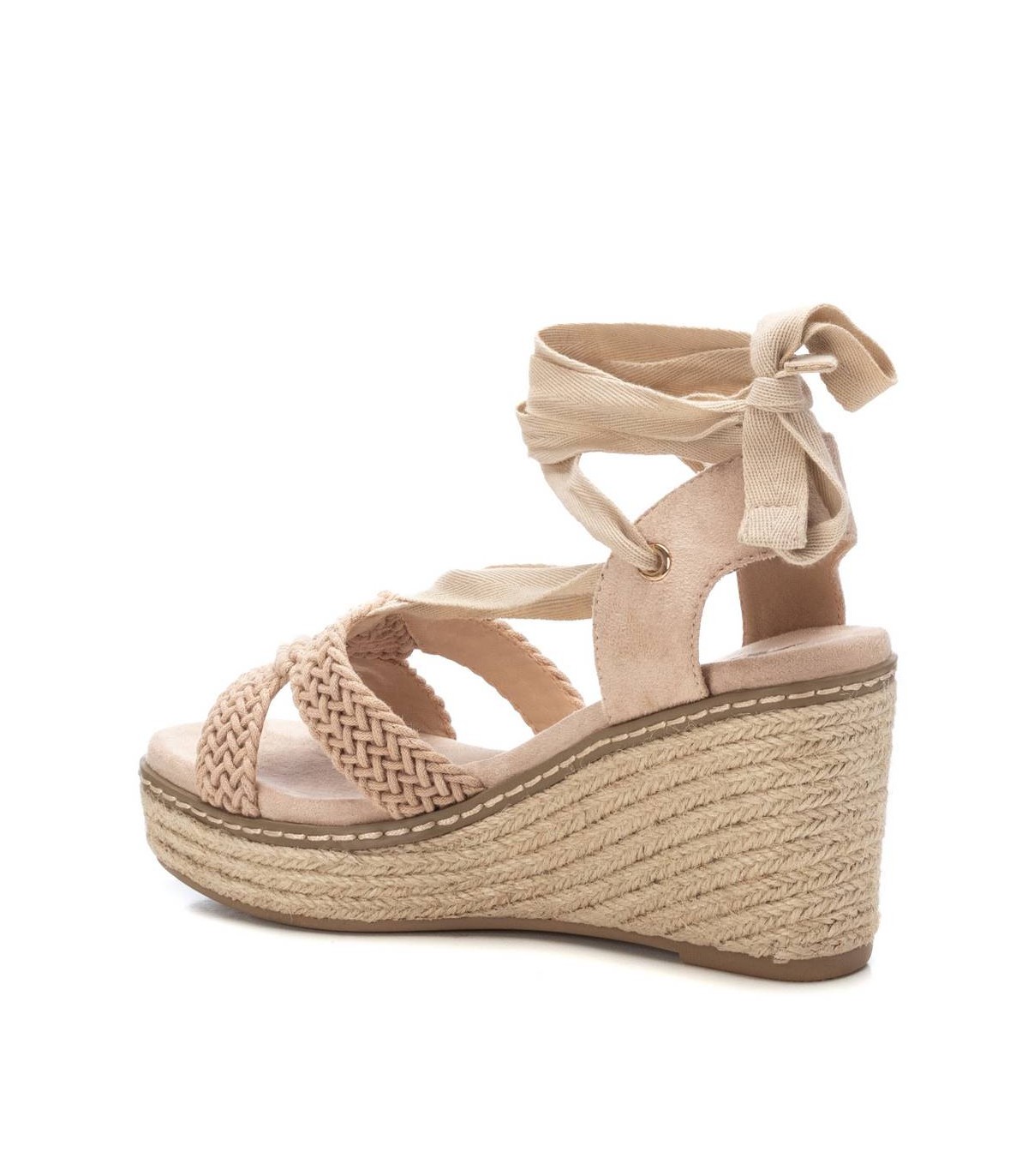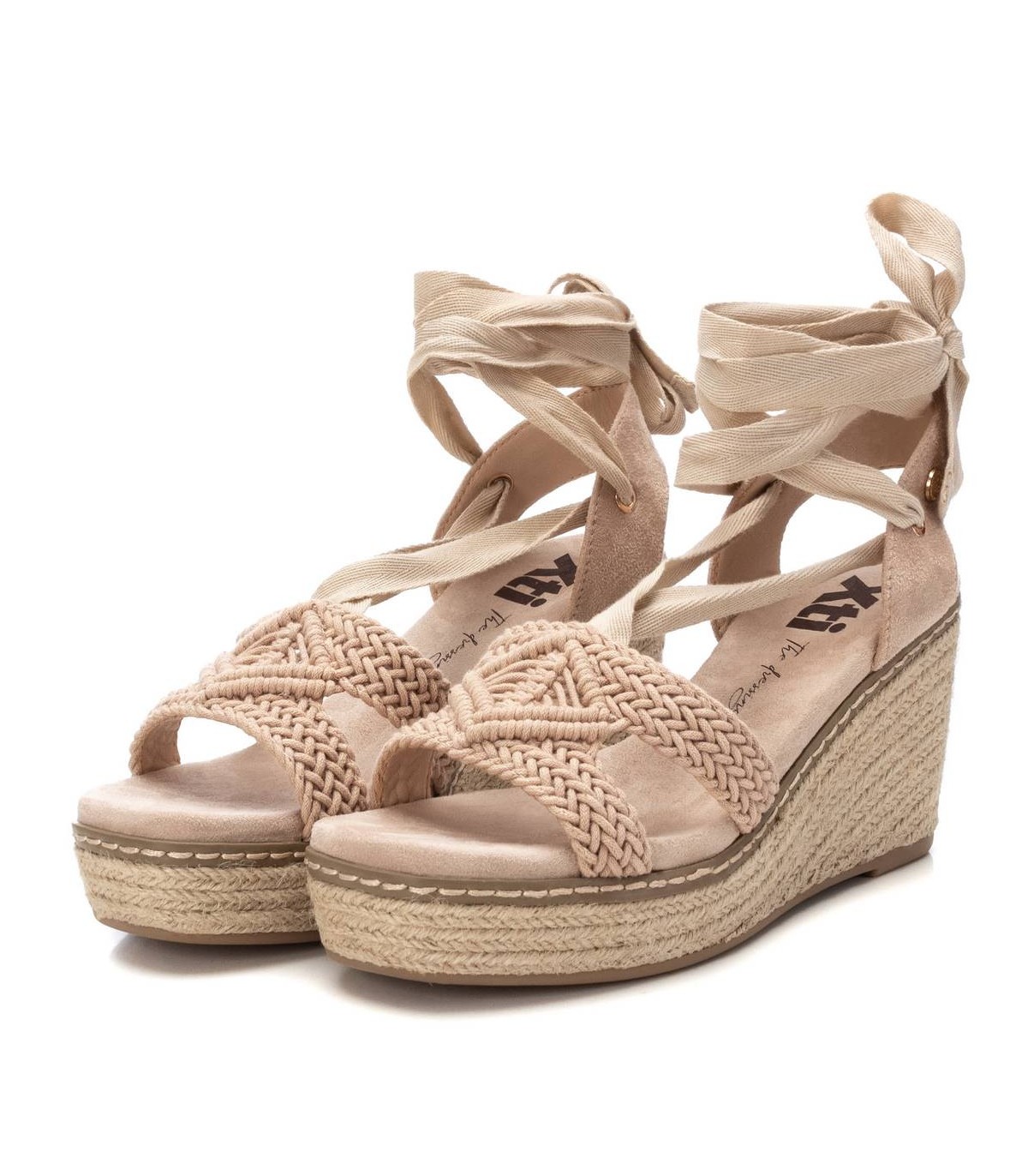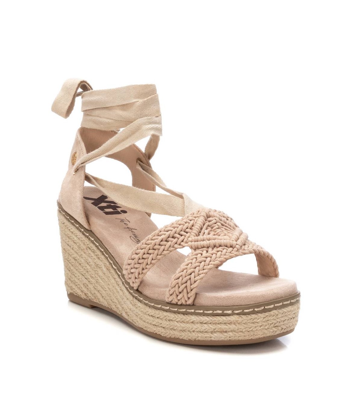 Sandalia de mujer con cuña, de la marca Xti. Diseño con material que textil tipo crochet. Con cintas que proporcionan una excelente sujeción. Cuña de yute con plataforma delantera y suela de goma antideslizante. Este modelo ha obtenido el certificado vegano por la organización mundial PETA (Organización de los derechos de los animales).