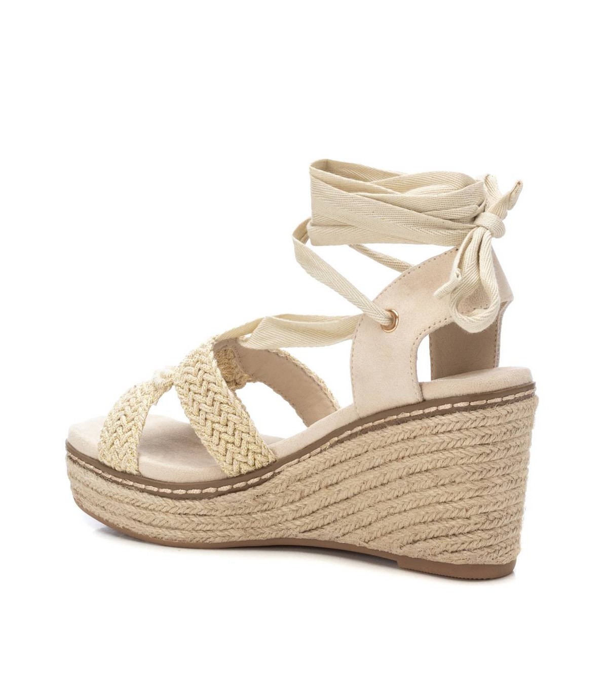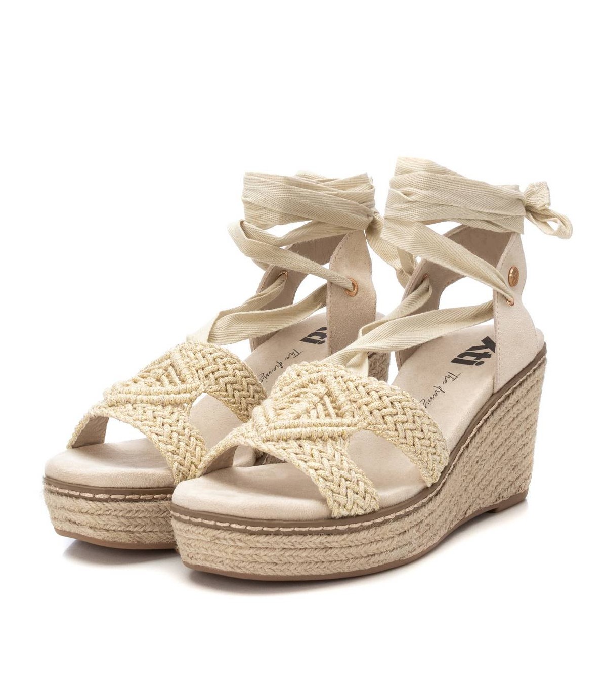 Sandalia de mujer con cuña, de la marca Xti. Diseño con material que textil tipo crochet. Con cintas que proporcionan una excelente sujeción. Cuña de yute con plataforma delantera y suela de goma antideslizante. Este modelo ha obtenido el certificado vegano por la organización mundial PETA (Organización de los derechos de los animales).