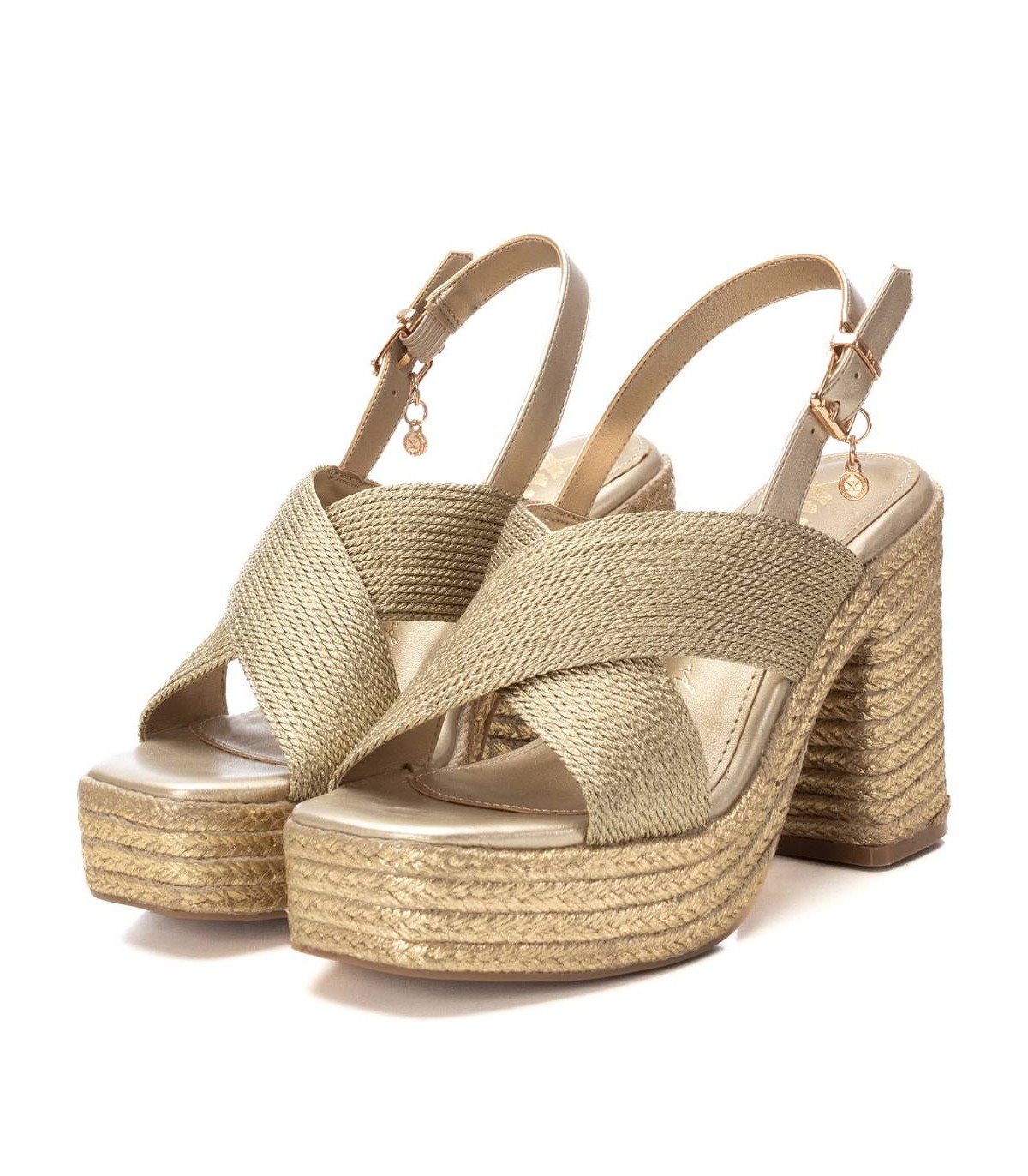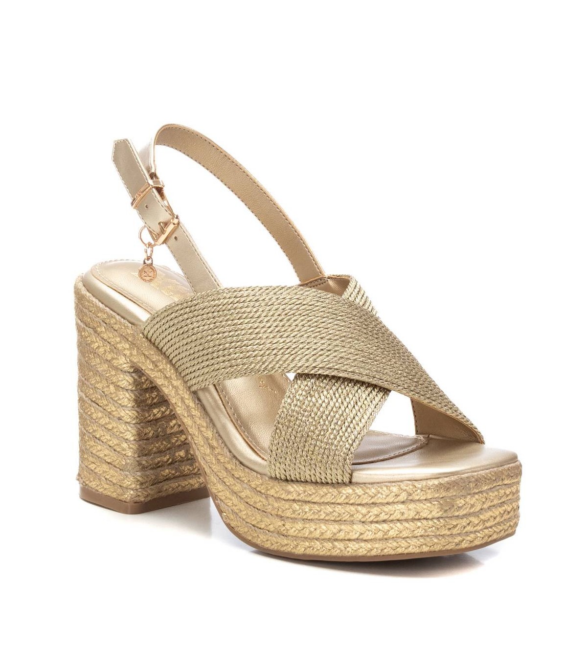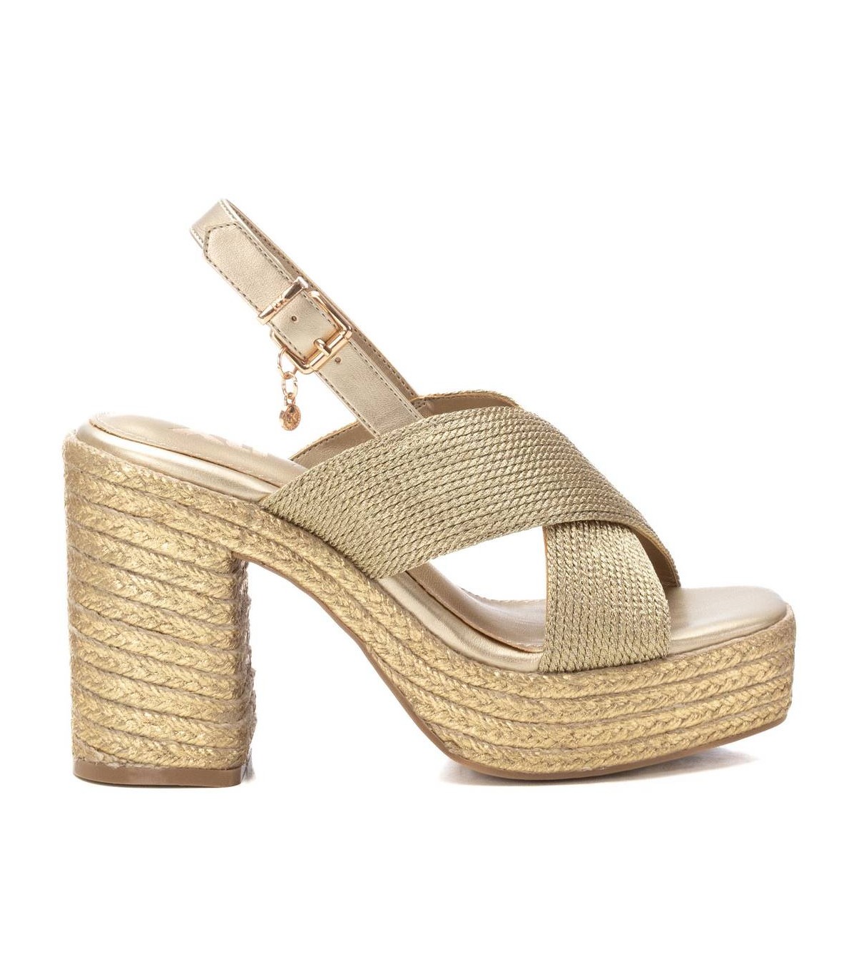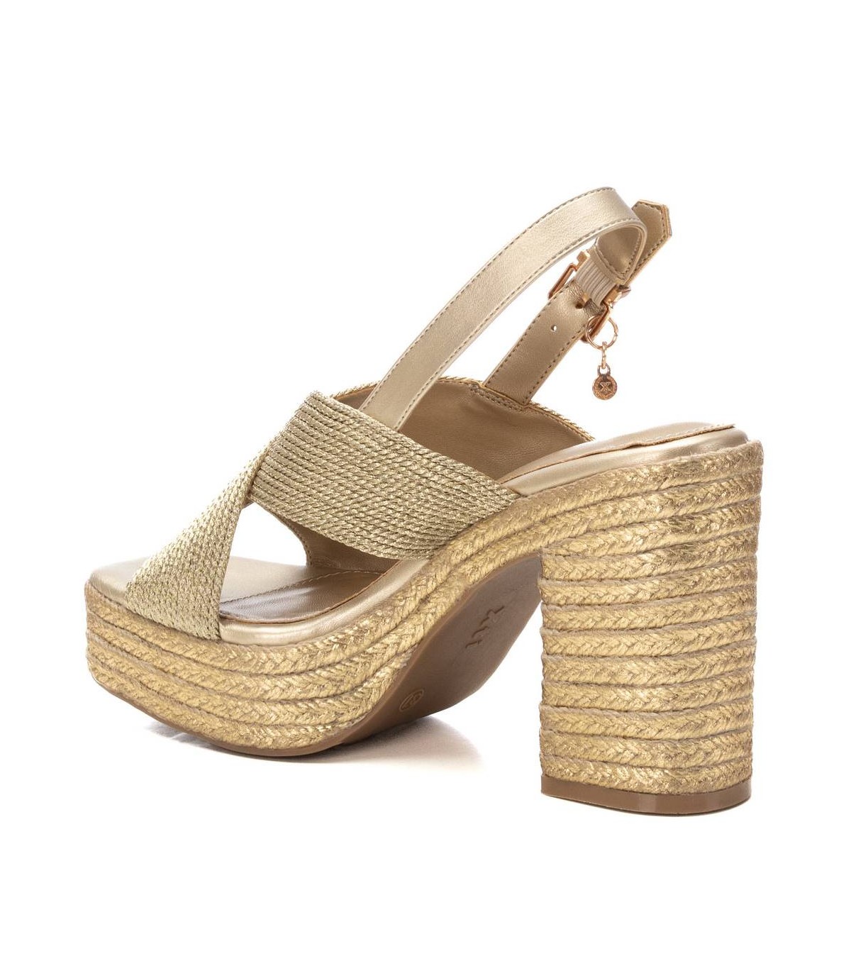 Sandalia de mujer con cuña, de la marca Xti. Fabricado en material textil metalizado. Cierre con hebilla metálica para facilitar el ajuste. Tacón forrado en yute metalizado con plataforma delantera y suela de goma antideslizante. Este modelo ha obtenido el certificado vegano por la organización mundial PETA (Organización de los derechos de los animales).