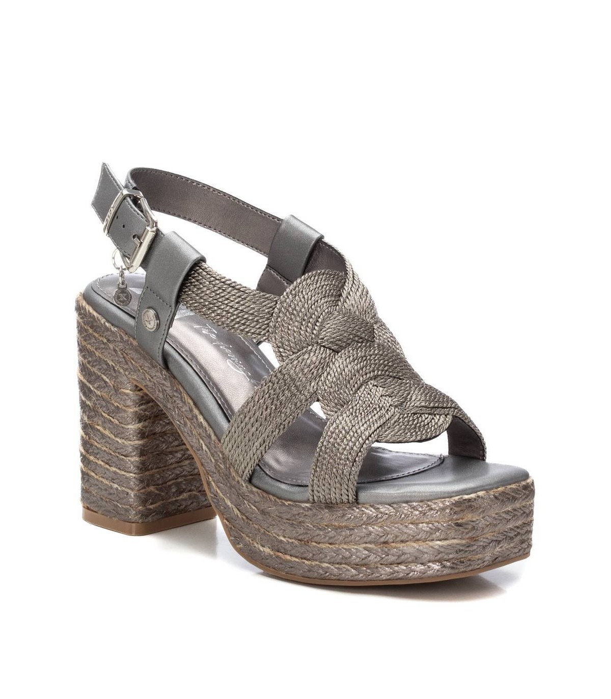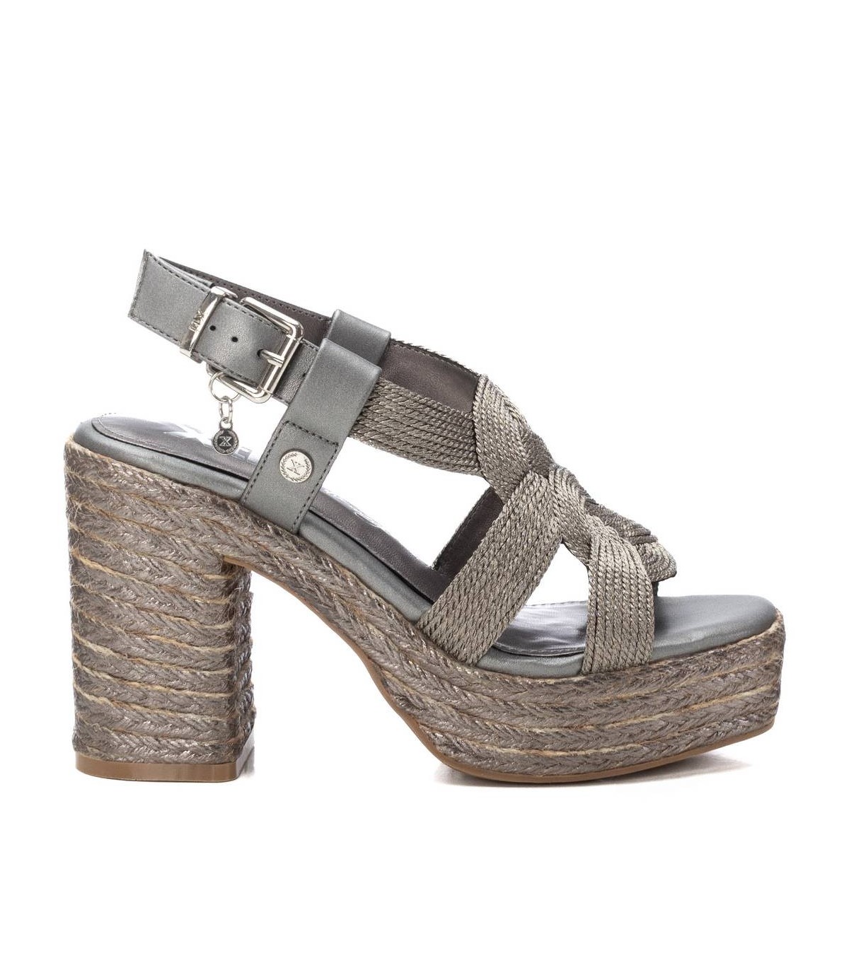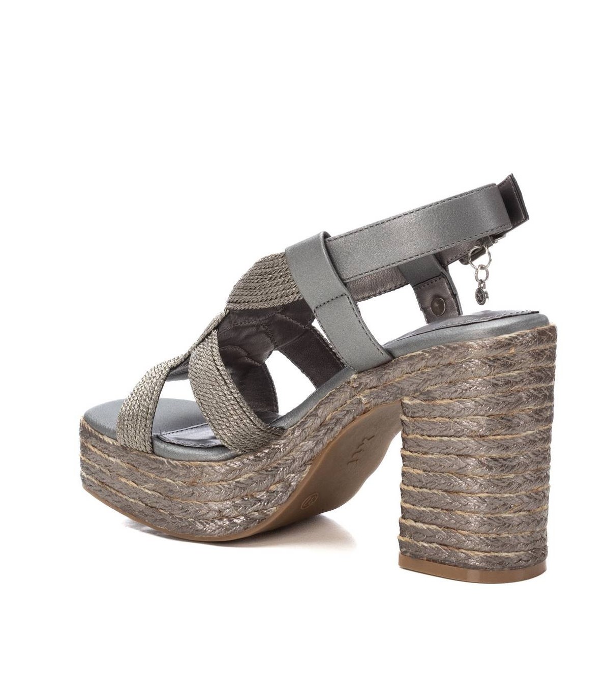 Sandalia de mujer con cuña, de la marca Xti. Fabricado en material textil metalizado. Cierre con hebilla metálica para facilitar el ajuste. Tacón forrado en yute metalizado con plataforma delantera y suela de goma antideslizante. Este modelo ha obtenido el certificado vegano por la organización mundial PETA (Organización de los derechos de los animales).