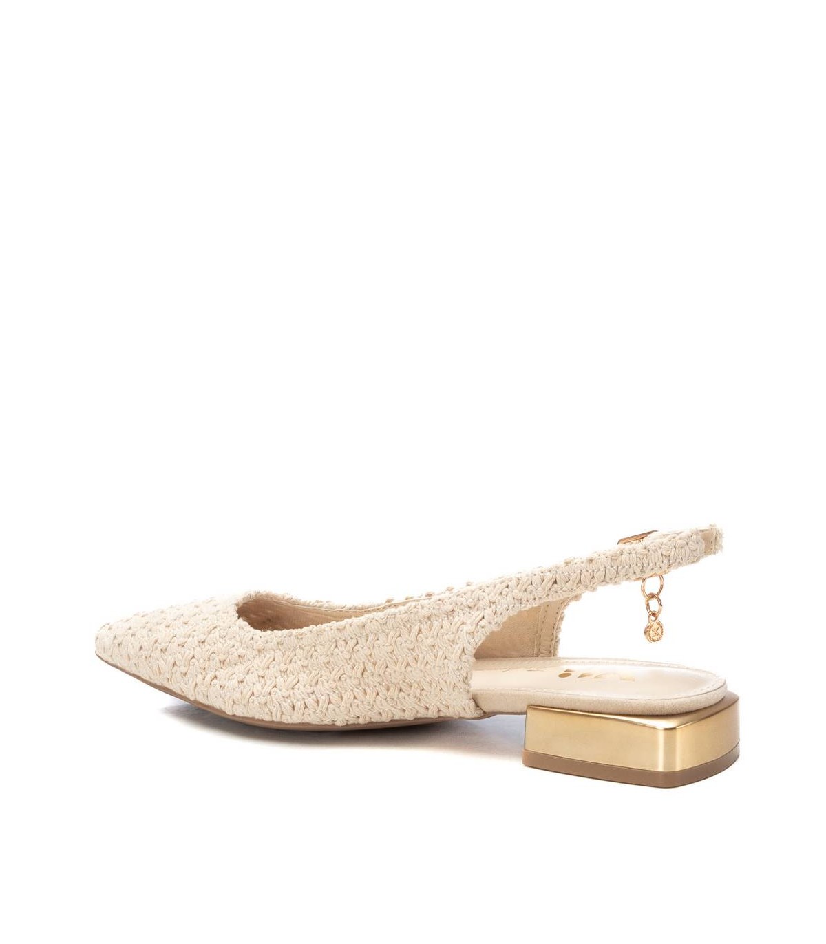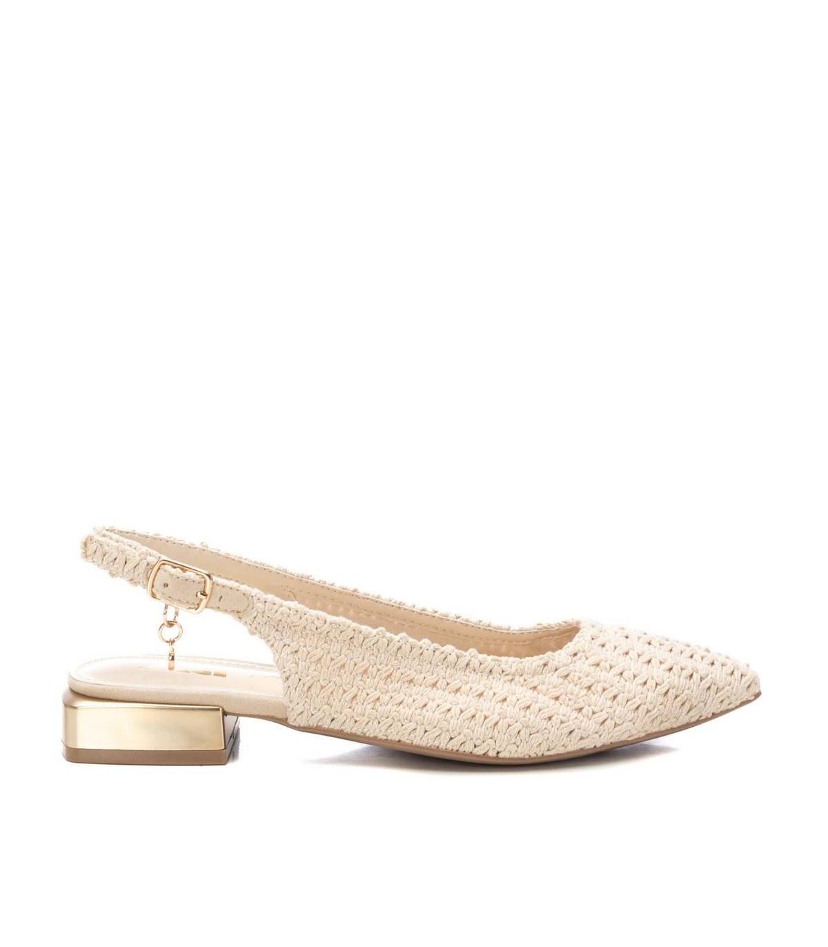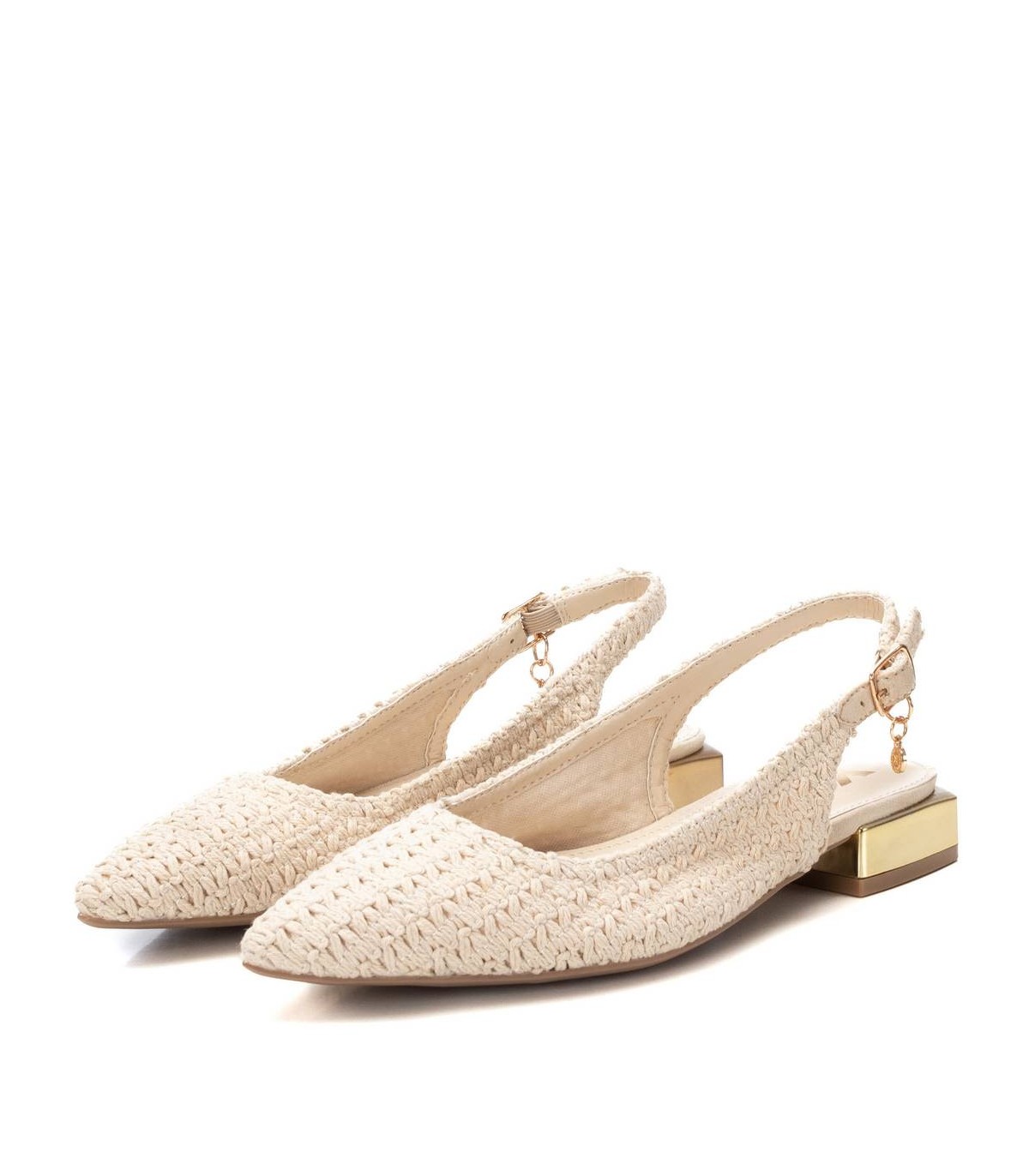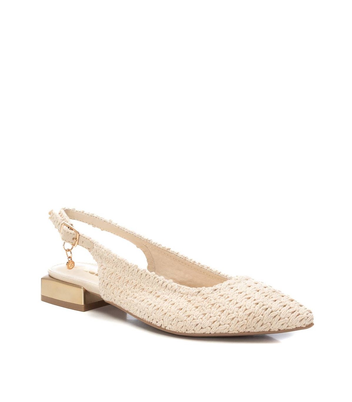 Bailarina de mujer, de la marca Xti. Fabricada en material textil crochet. Modelo de punta destalonado con tacón bajo destalonado. Suela plana de goma antideslizante. Este modelo ha obtenido el certificado vegano por la organización mundial PETA (Organización de los derechos de los animales).