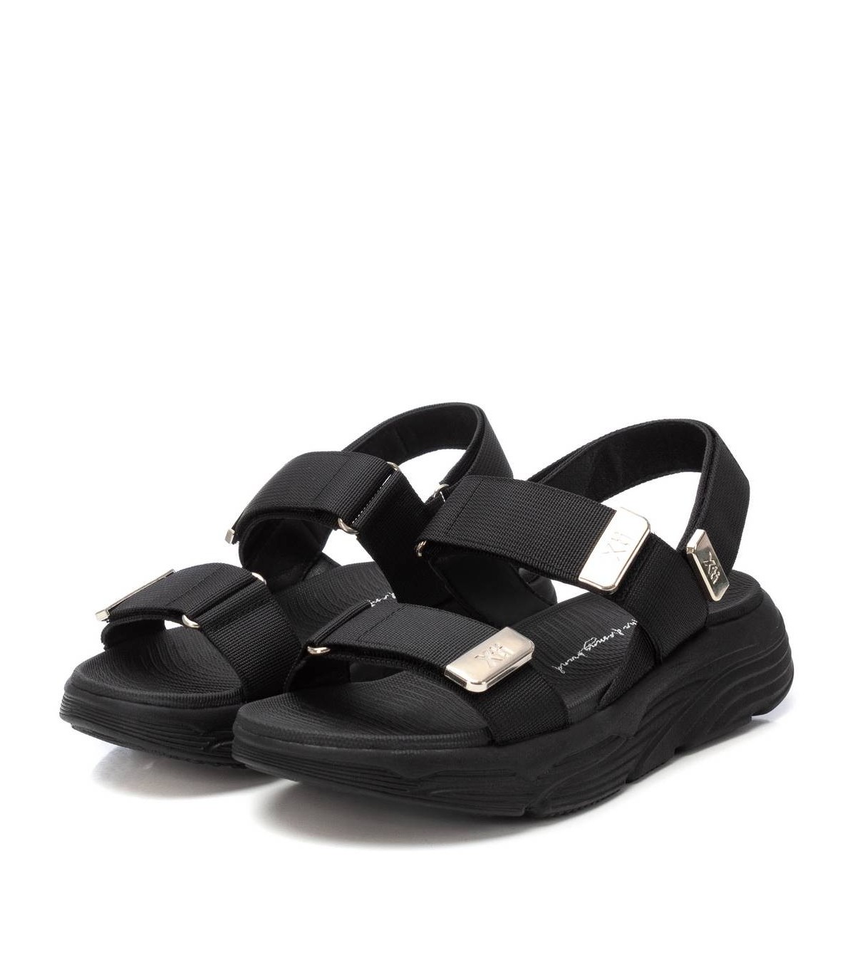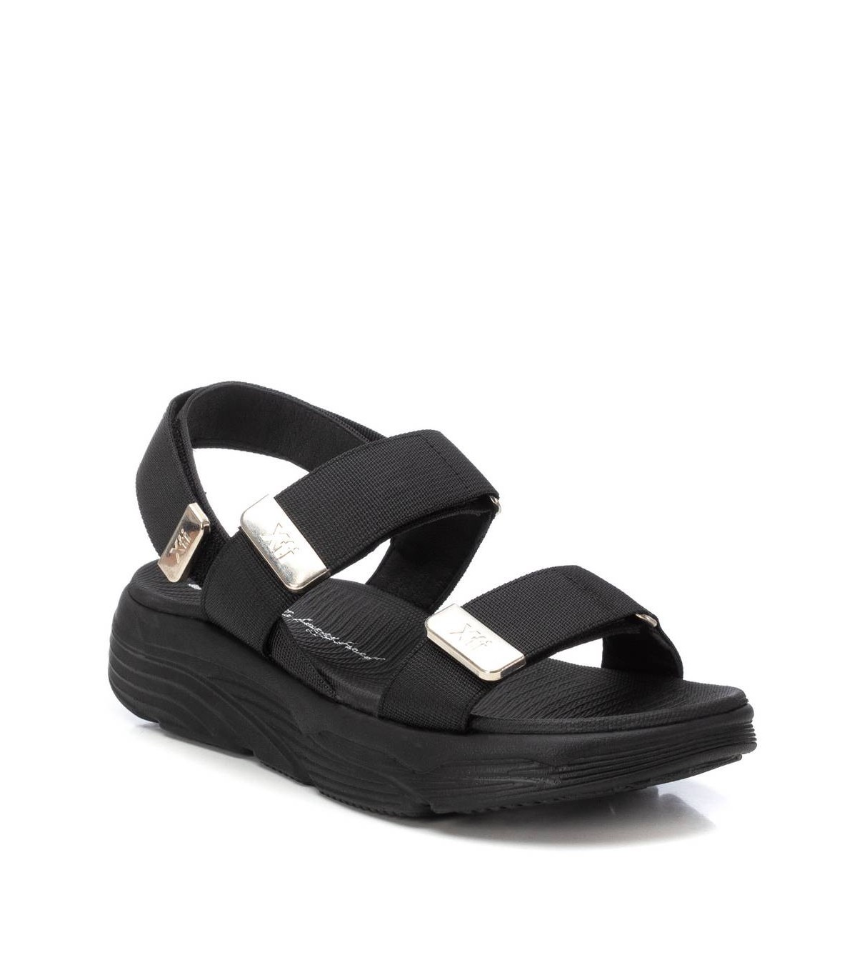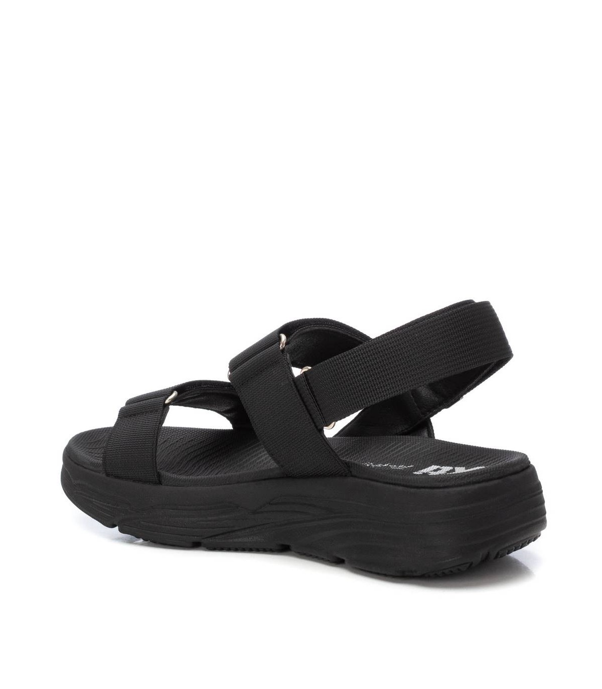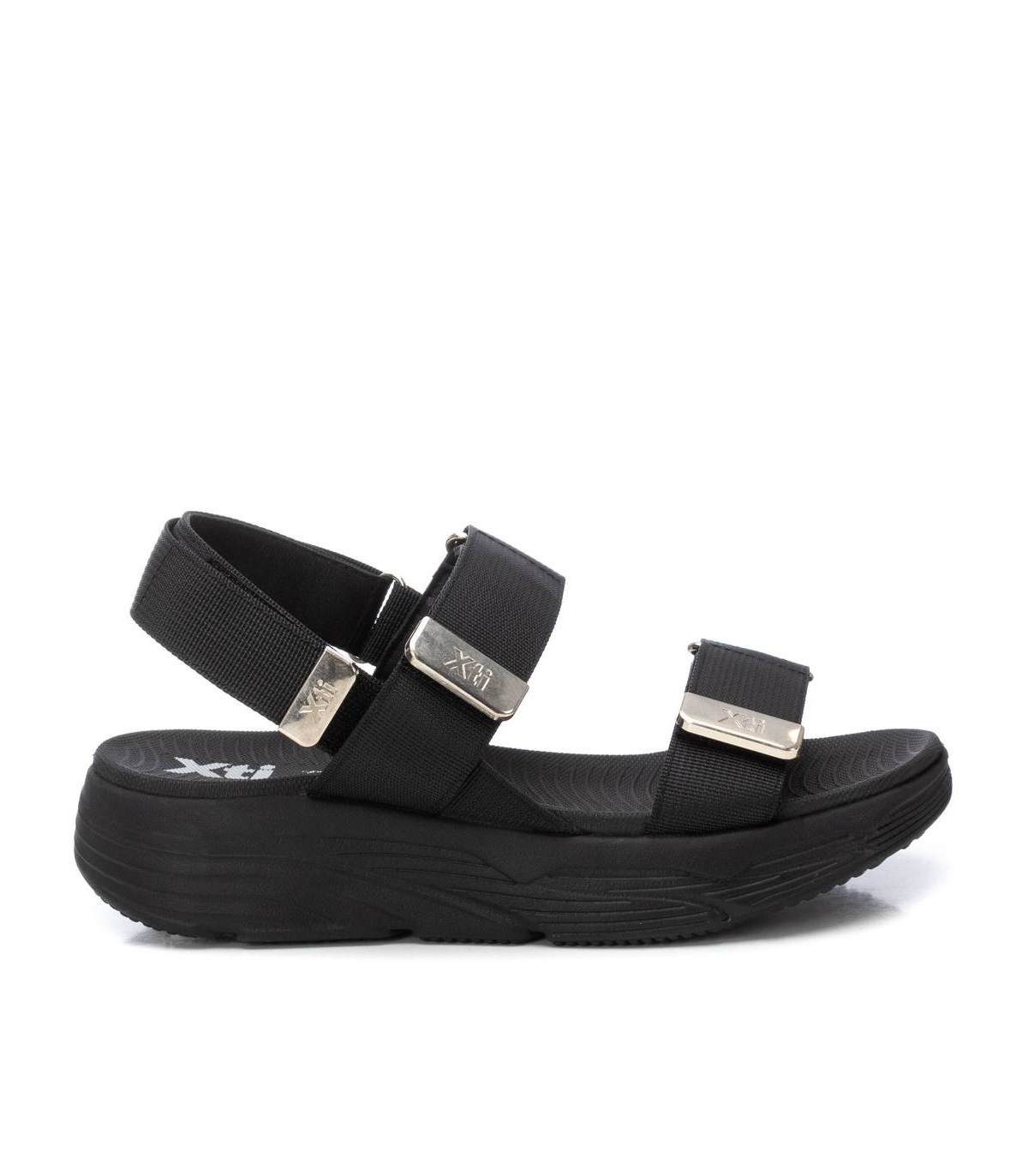 Sandalia de mujer, de la marca Xti. Fabricada en material textil. Modelo de doble pala con cierre adhesivos y detalle metálico. Suela deportiva y antideslizante. Este modelo ha obtenido el certificado vegano por la organización mundial PETA (Organización de los derechos de los animales).