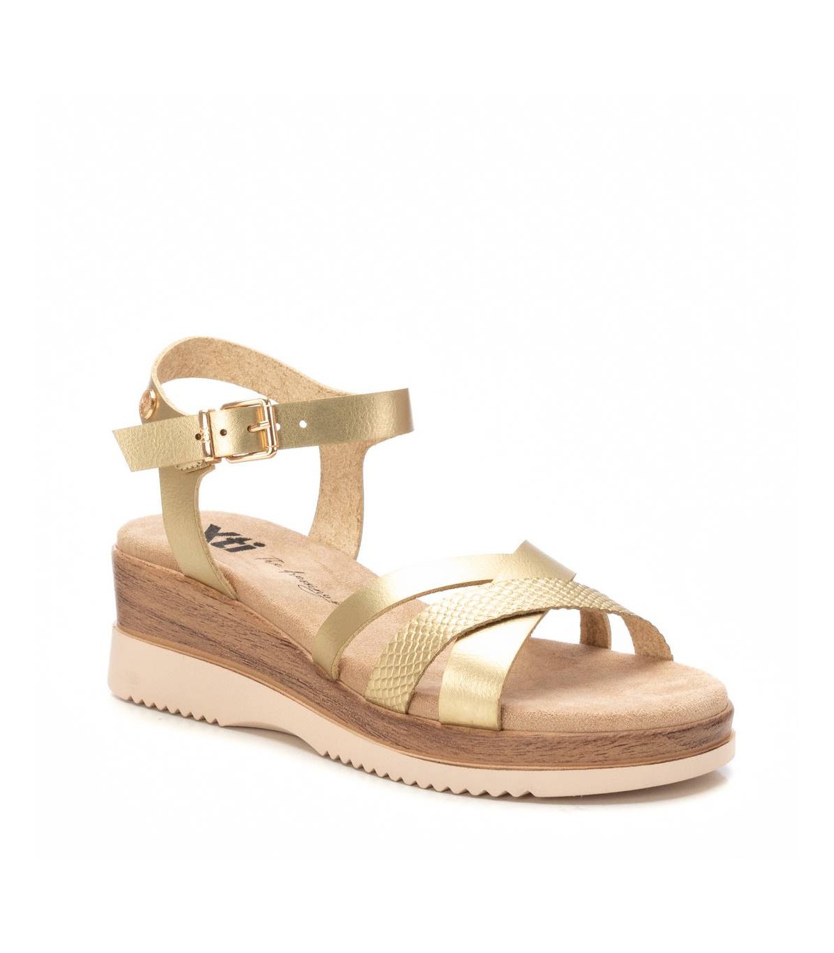 Sandalia de mujer, de la marca Xti. Fabricada en material que imita la piel con efecto metalizado, de alta calidad. Diseño con tiras cruzadas. Cierre mediante hebilla metálica para facilitar el ajuste. Suela de goma antideslizante.