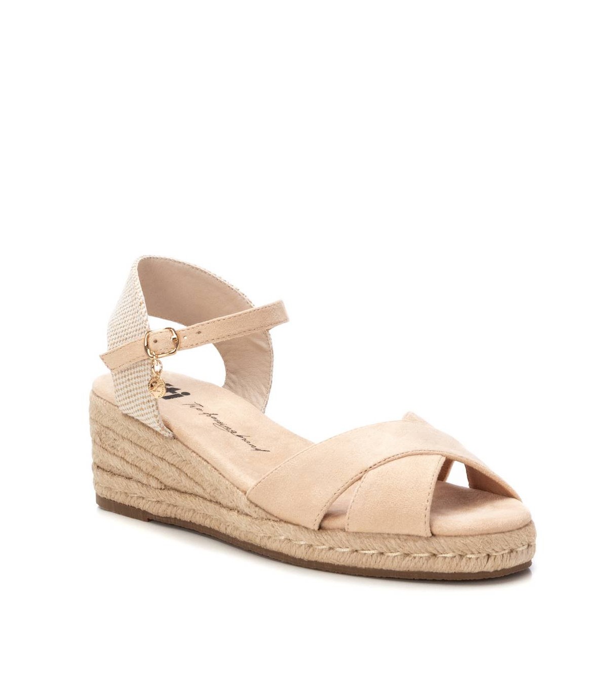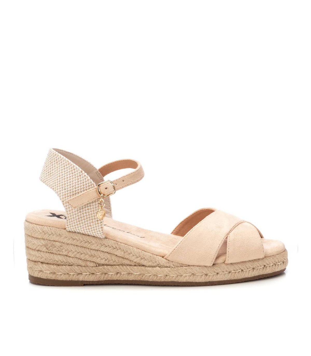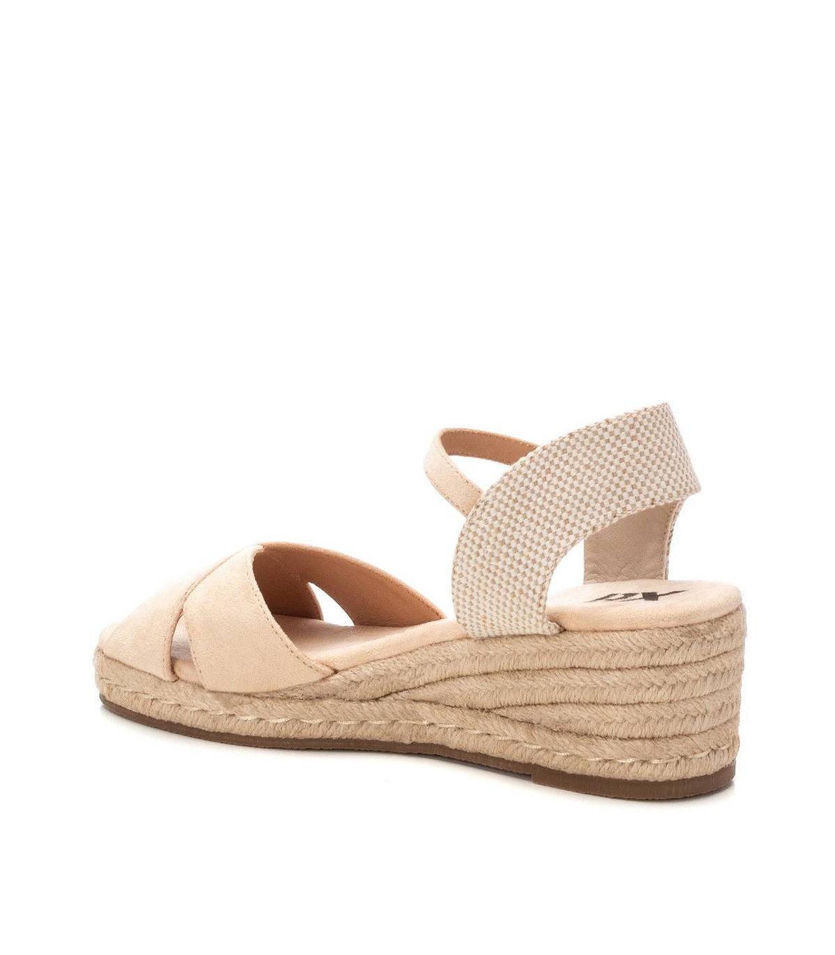 Sandalia de mujer, de la marca Xti. Fabricada en antelina y material textil. Modelo de pala cruzada con tira sujetada al tobillo mediante hebilla metálica. Cuña baja de yute y suela antideslizante. Este modelo ha obtenido el certificado vegano por la organización mundial PETA (Organización de los derechos de los animales).