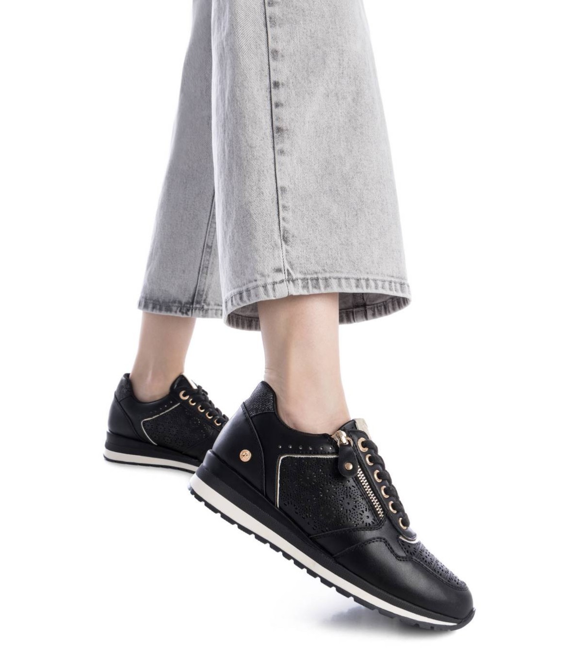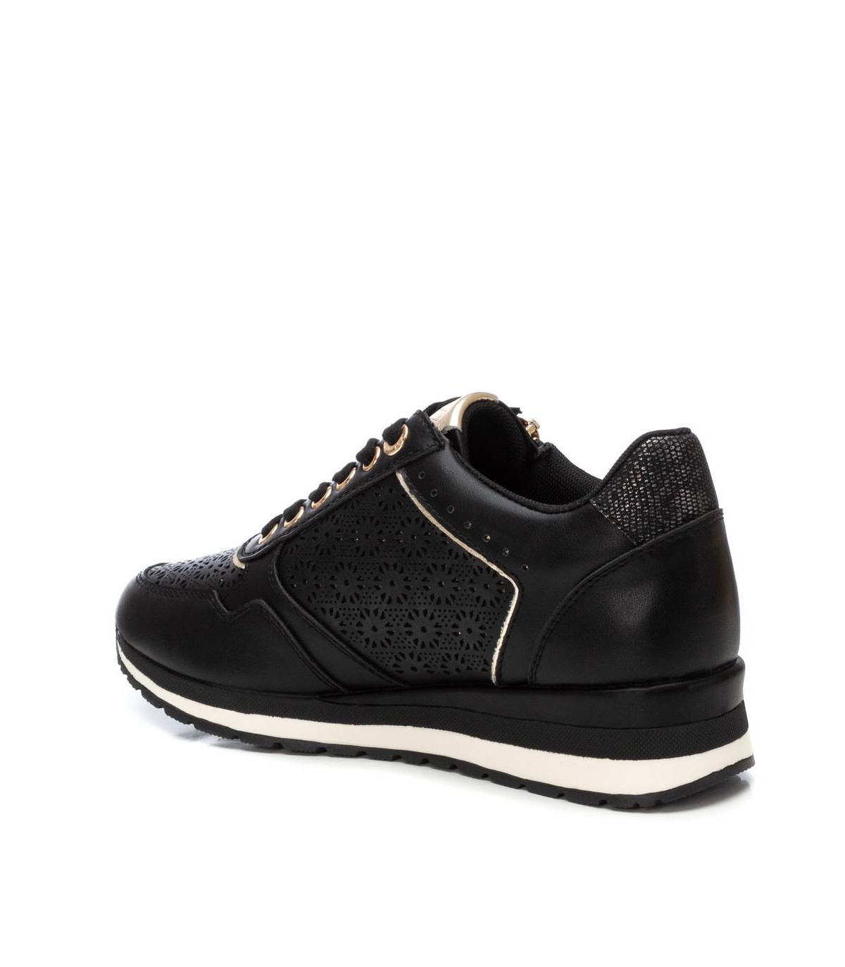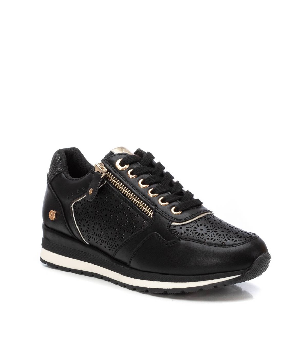 Zapatilla casual de mujer, de la marca Xti. Está fabricada en material que imita a la piel. Bonito troquelado en el lateral. Cordones al tono y cremallera con función en el lateral. Cuña bicolor con suela de goma antideslizante. Con plantilla extraíble. Este modelo ha obtenido el certificado vegano por la organización mundial PETA (Organización de los derechos de los animales).