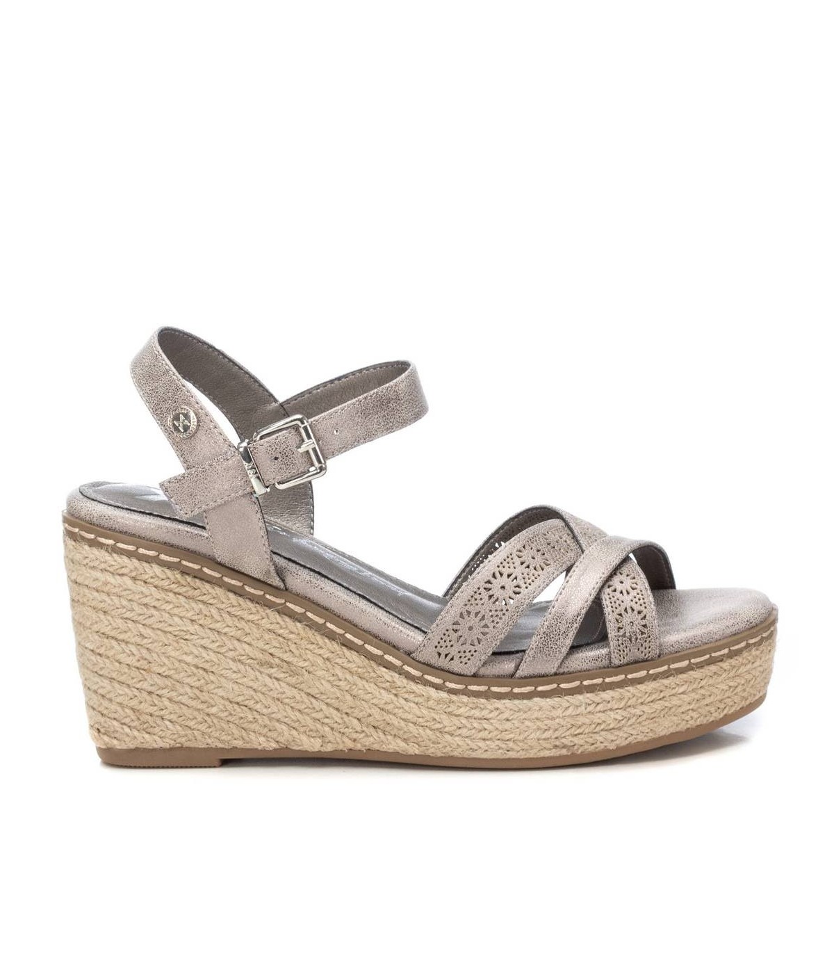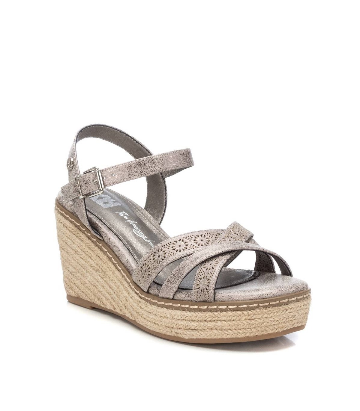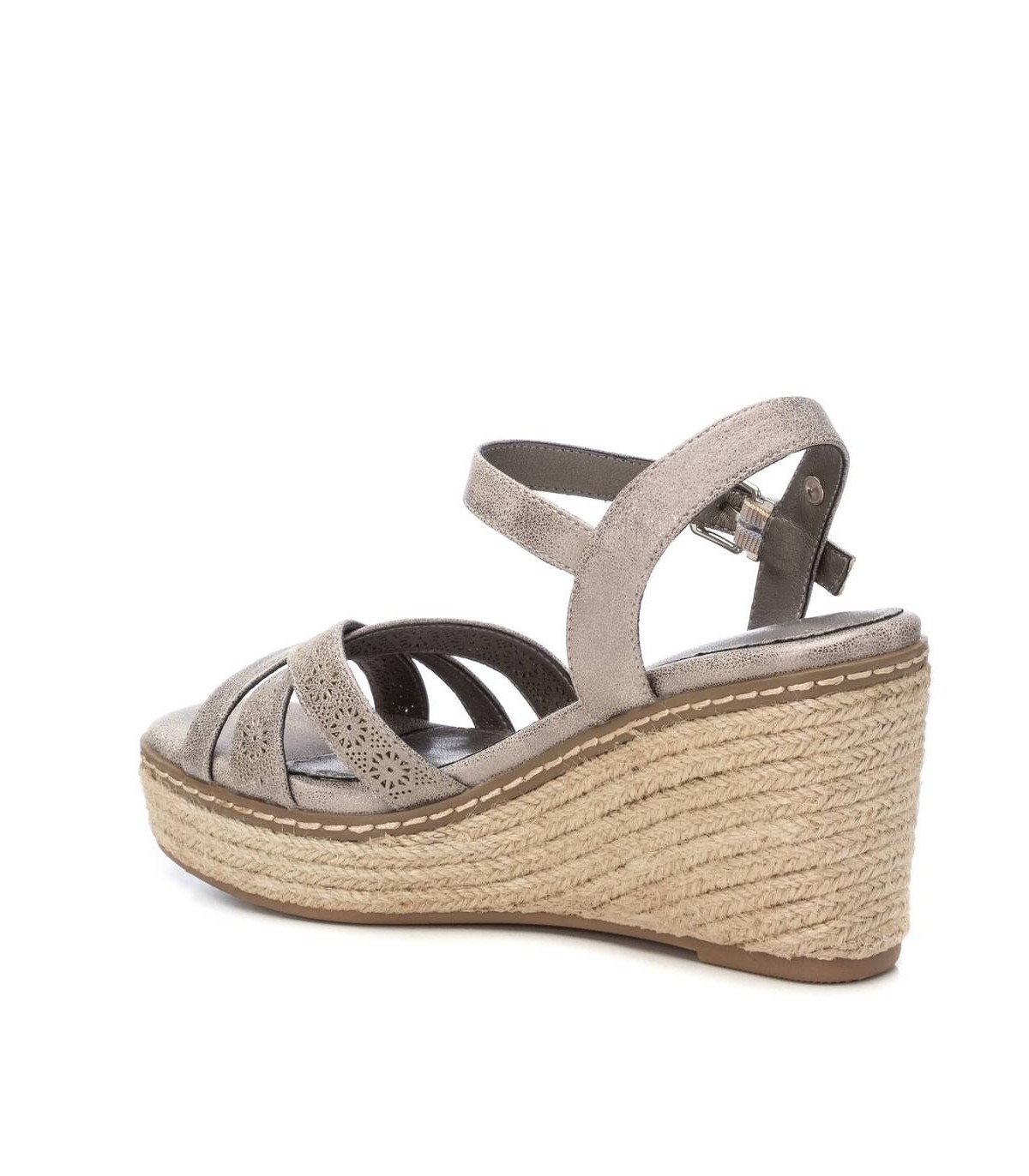 Sandalia de mujer, de la marca Xti. Fabricada en material que imita la piel con efecto metalizado. Modelo de tiras entrelazadas con detalle de un bonito troquelado. Cuña de 9 cm con plataformas. Comodísimas para llevar todo el verano.