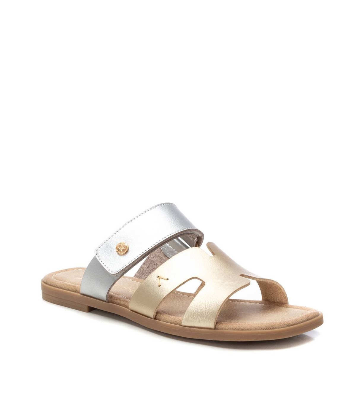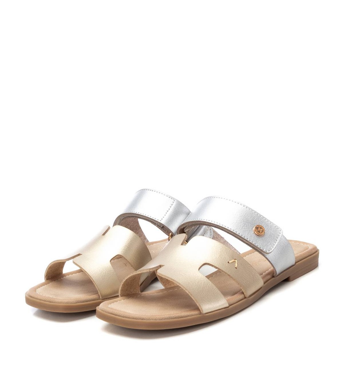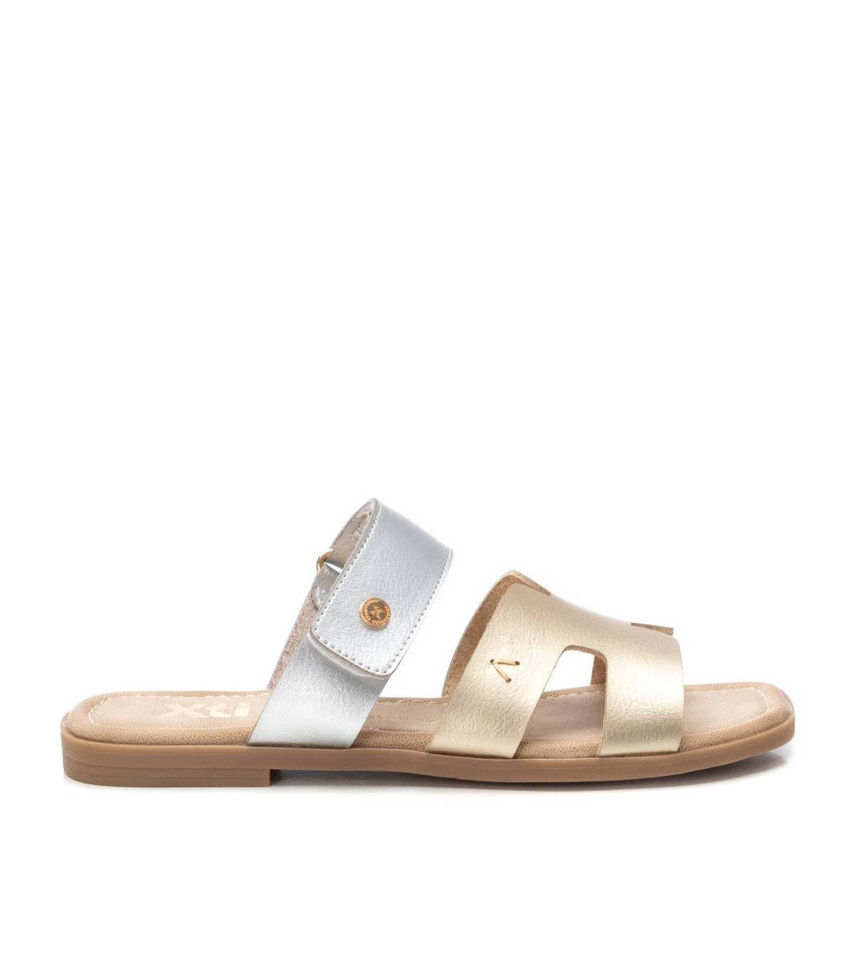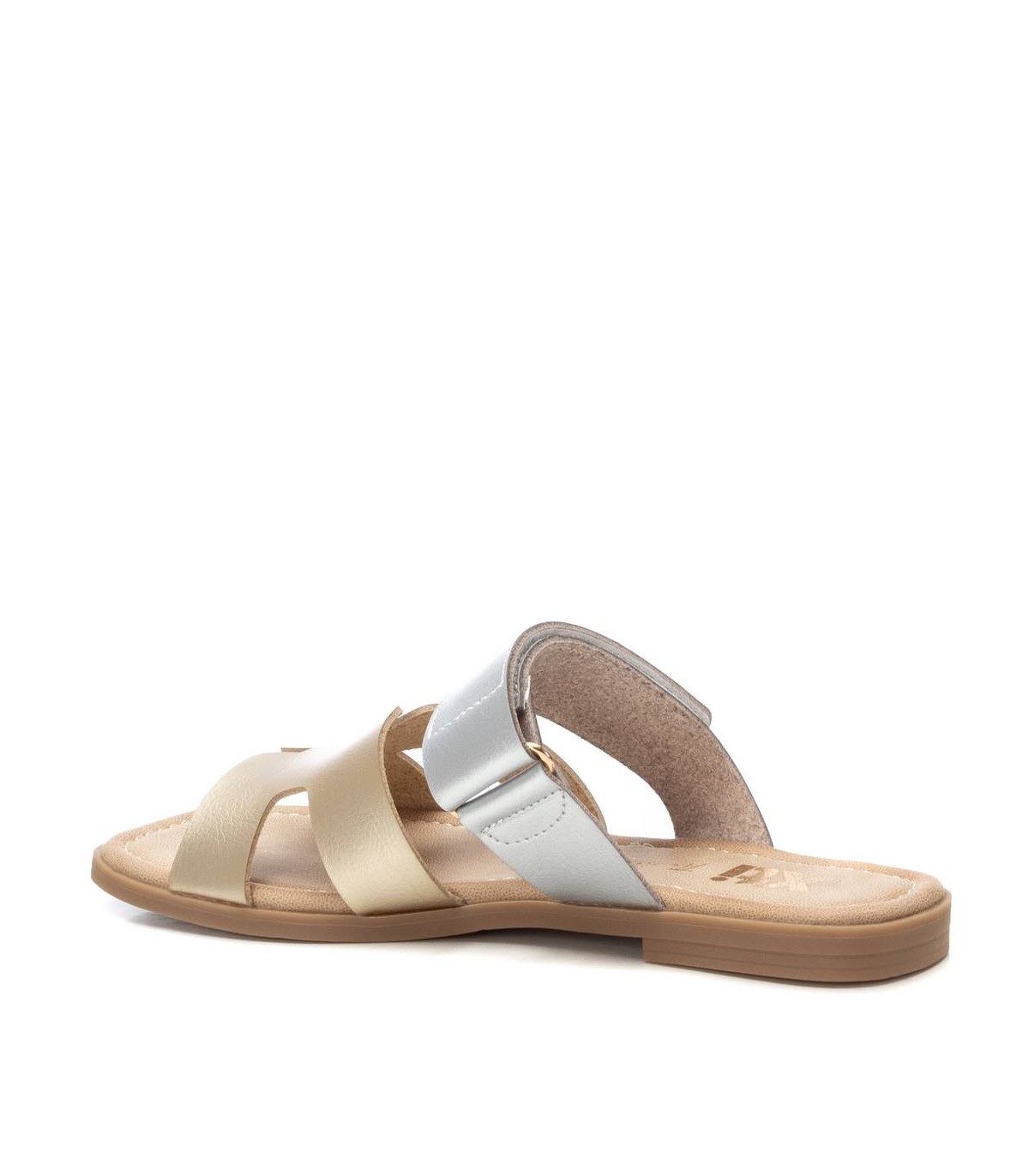 Sandalia de mujer, de la marca Xti. Fabricada en material que imita la piel. Diseño de doble pala, una de ellas con cierre adhesivo para su ajuste. Modelo bicolor. Suela plana de goma antideslizante.