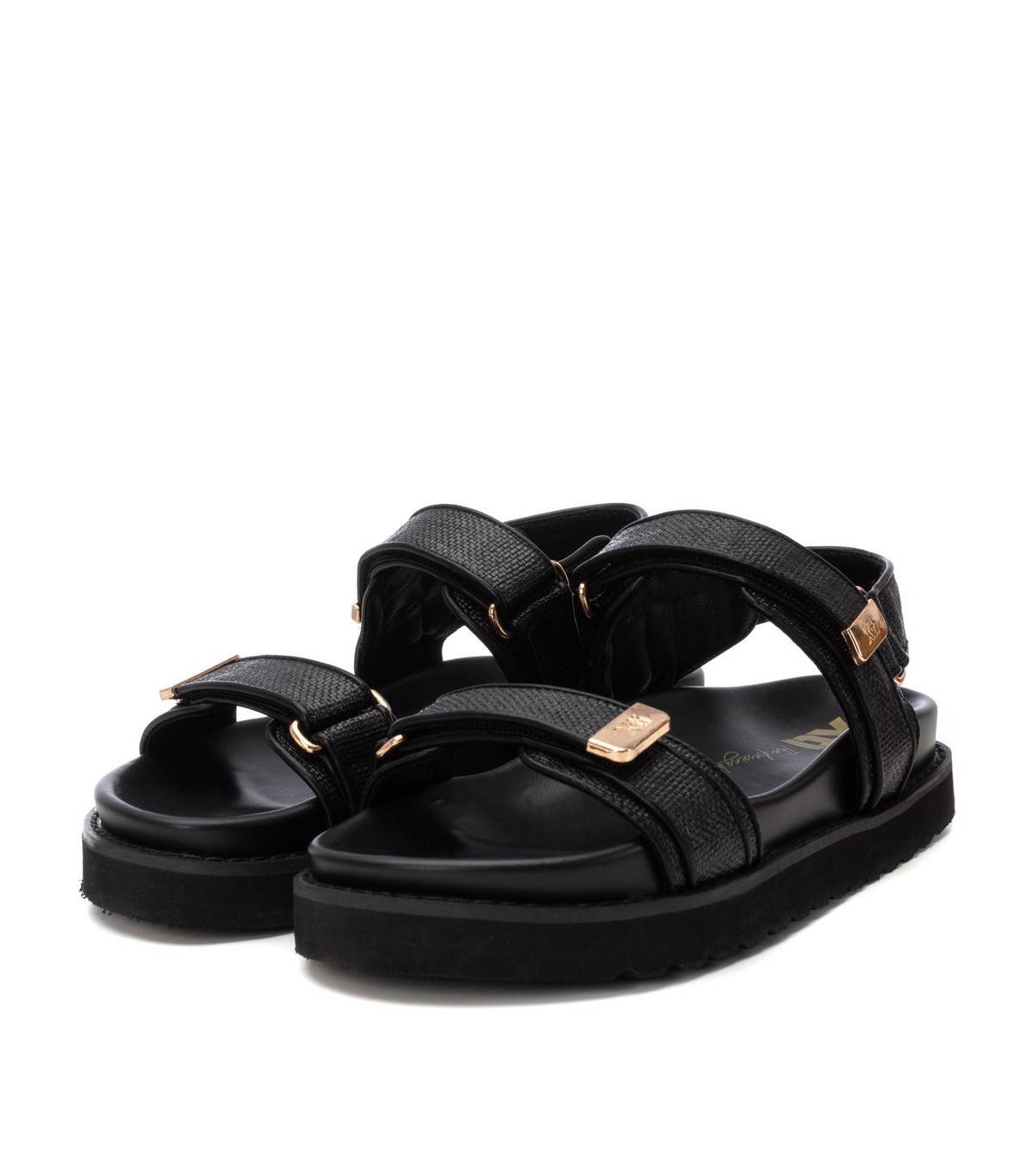 Sandalia de mujer, de la marca Xti. Fabricada en rafia. Modelo de doble pala con cierre adhesivos. Piezas decorativas metálicas. Suela plana antideslizante y forrada en con trenzado con el mismo tono de la rafia.