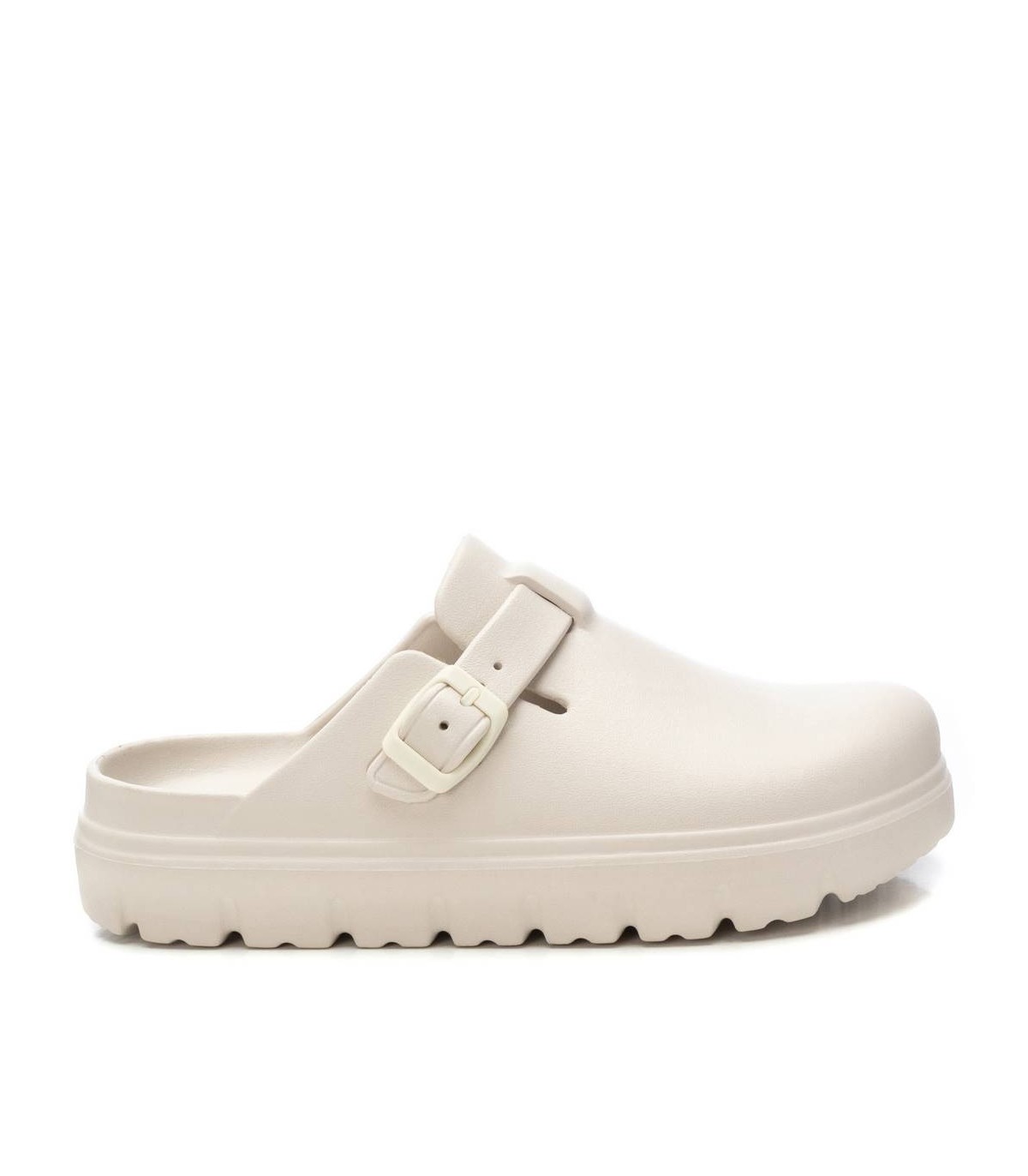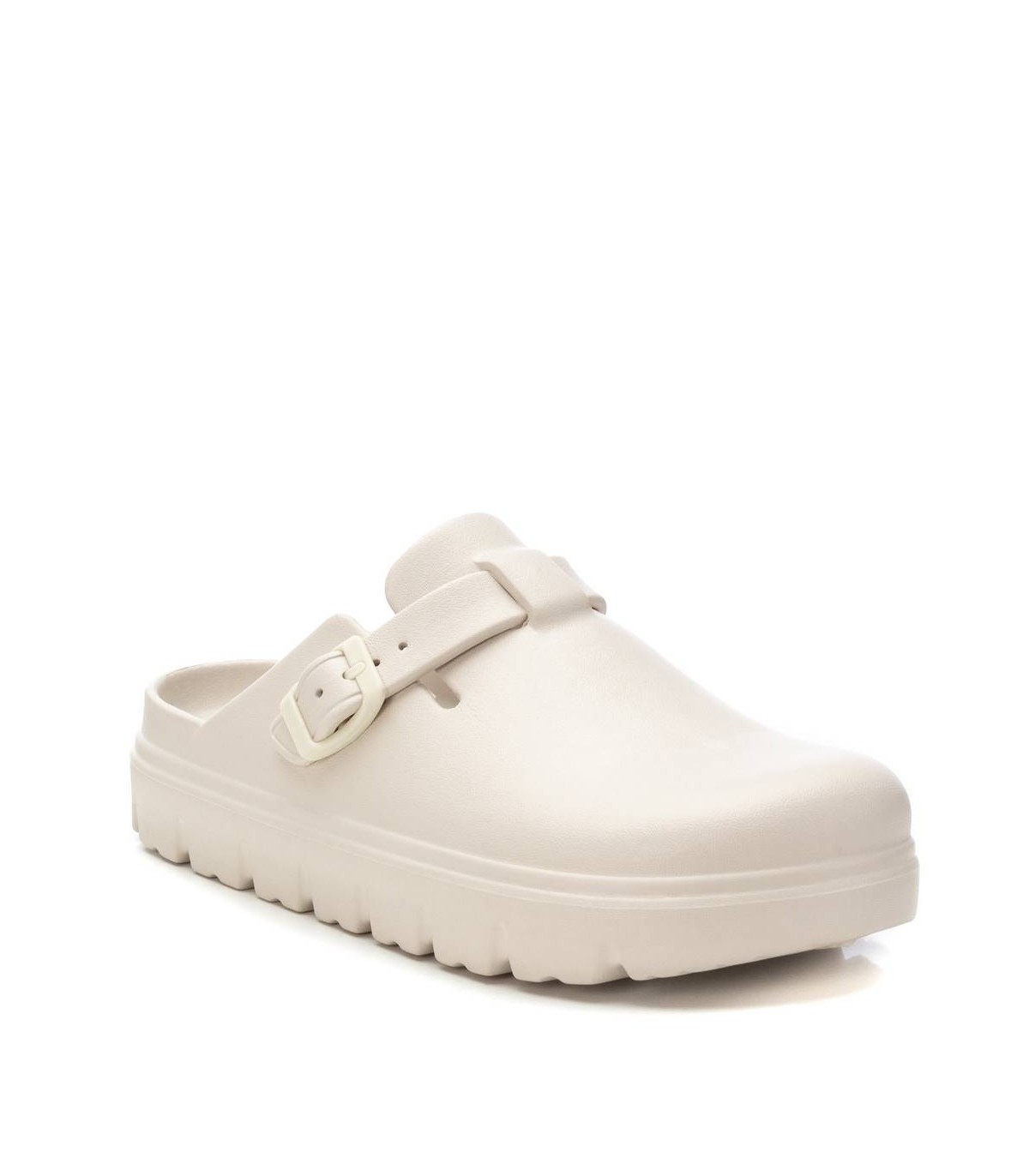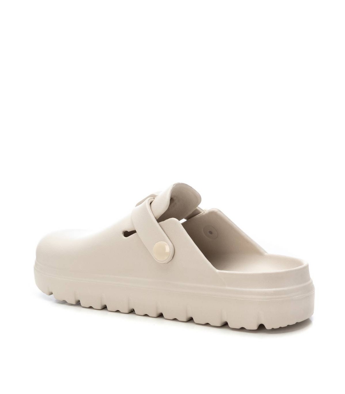 Zapato de mujer de la marca Xti, estilo zueco. Fabricado en goma. Modelo cómodo para todos los planes más refrescantes del verano. Suela antideslizante. Este modelo ha obtenido el certificado vegano por la organización mundial PETA (Organización de los derechos de los animales).