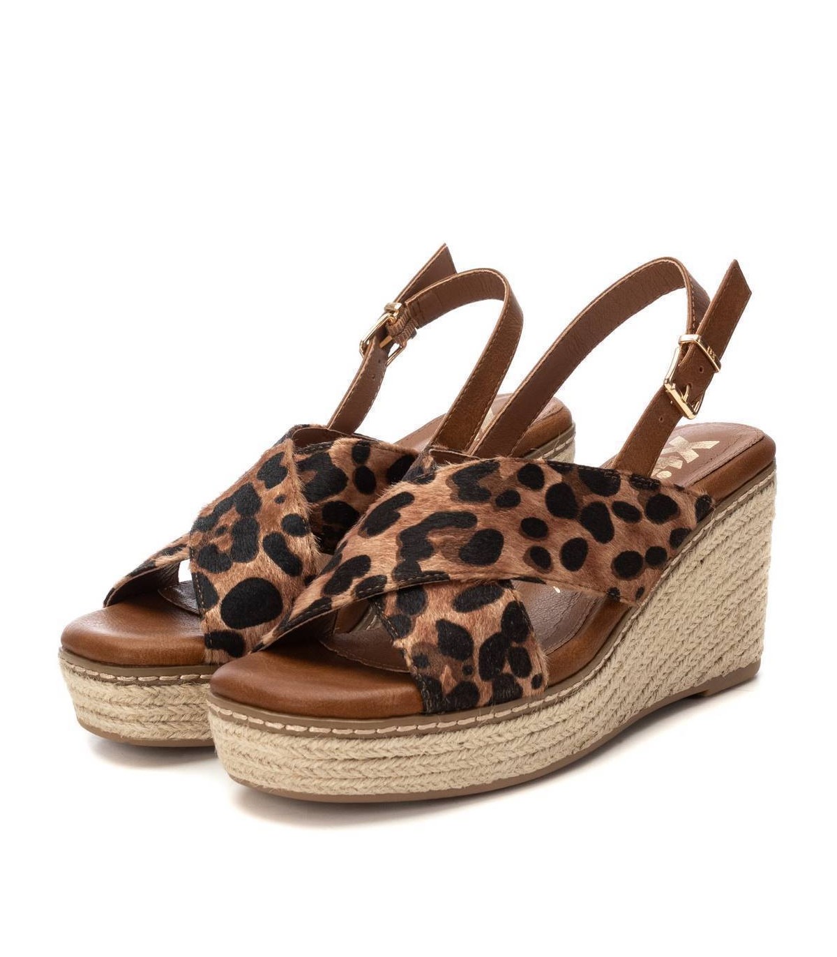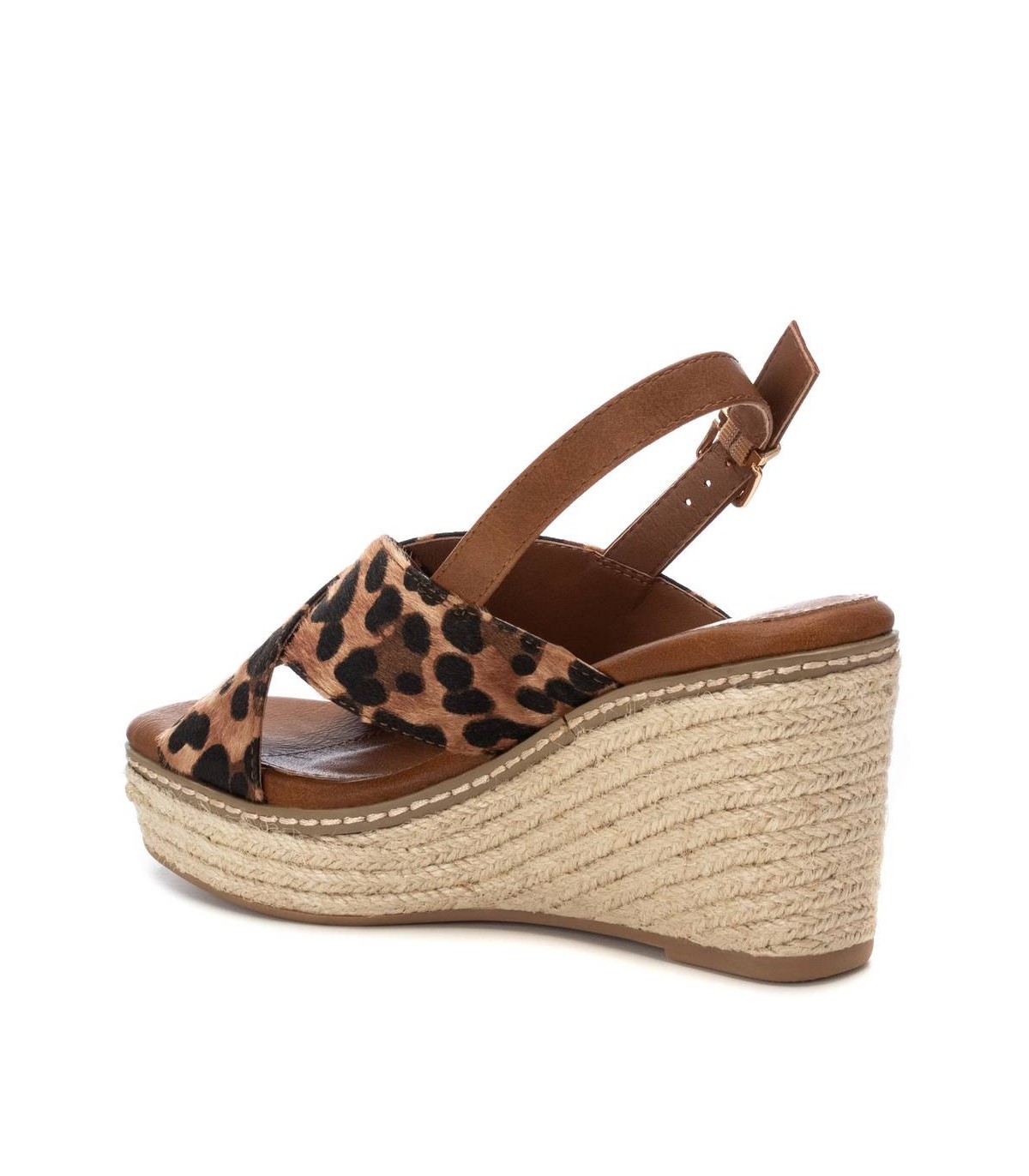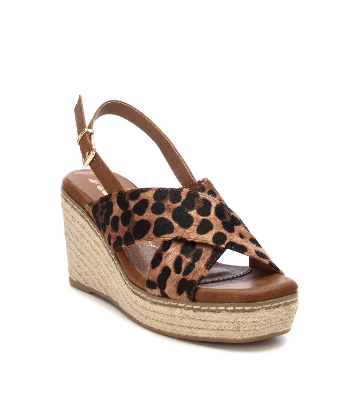 Sandalia de mujer con cuña, de la marca Xti. Diseño con material que imita la piel con acabado animal print. Cierre con hebilla metálica para facilitar el ajuste. Cuña de 8 cm de yute con plataforma delantera y suela de goma antideslizante. Este modelo ha obtenido el certificado vegano por la organización mundial PETA (Organización de los derechos de los animales).