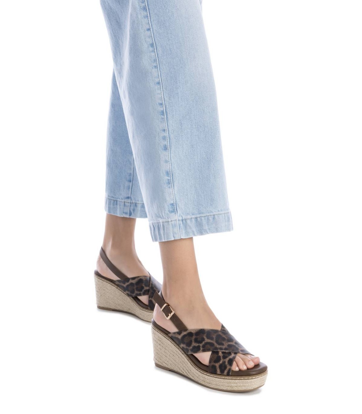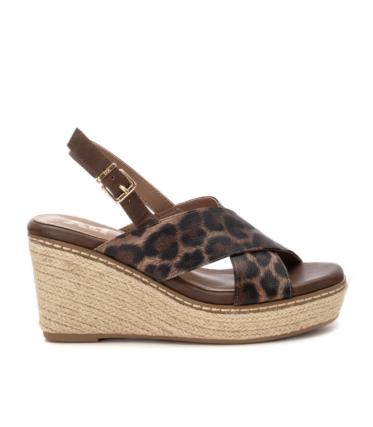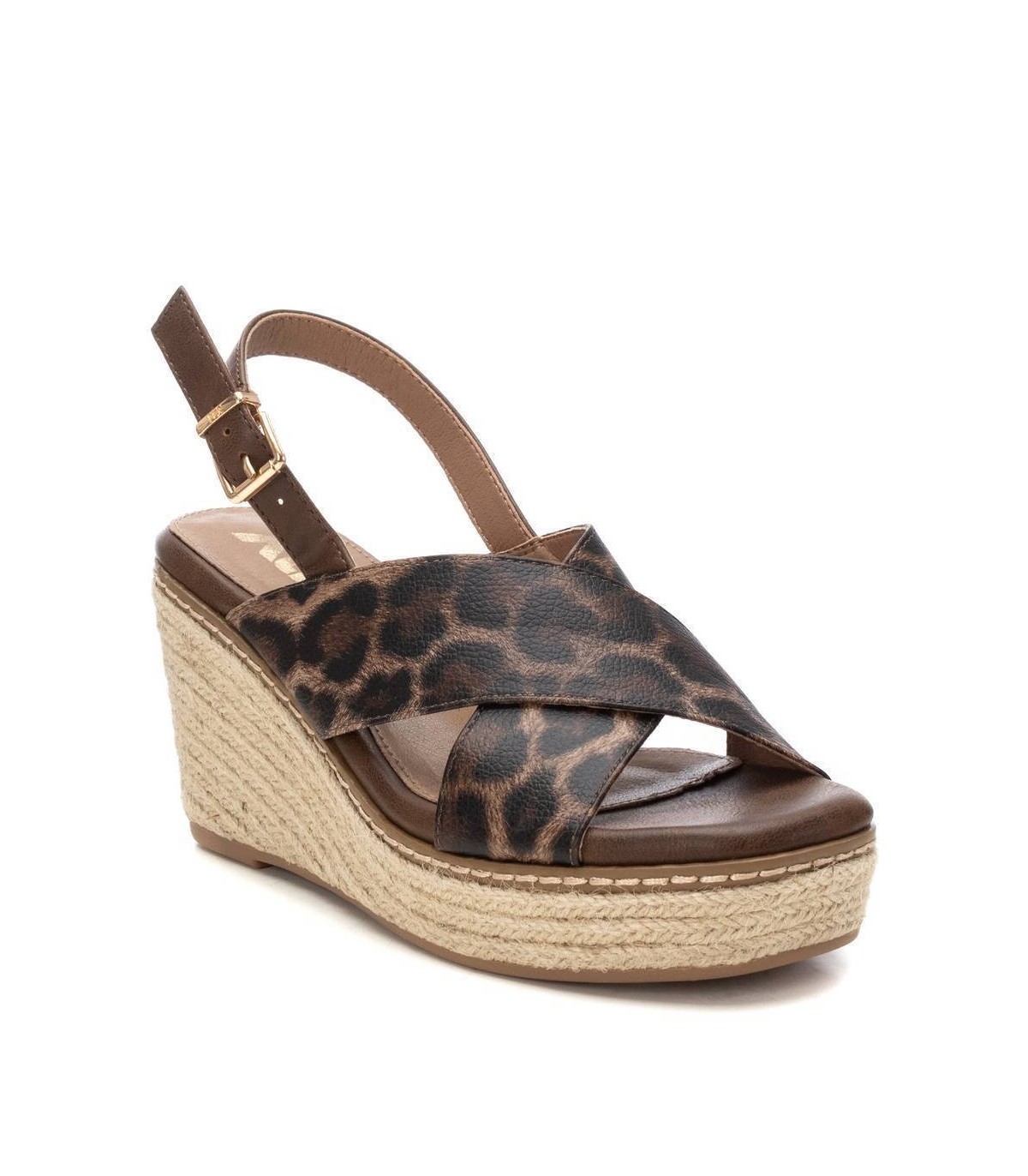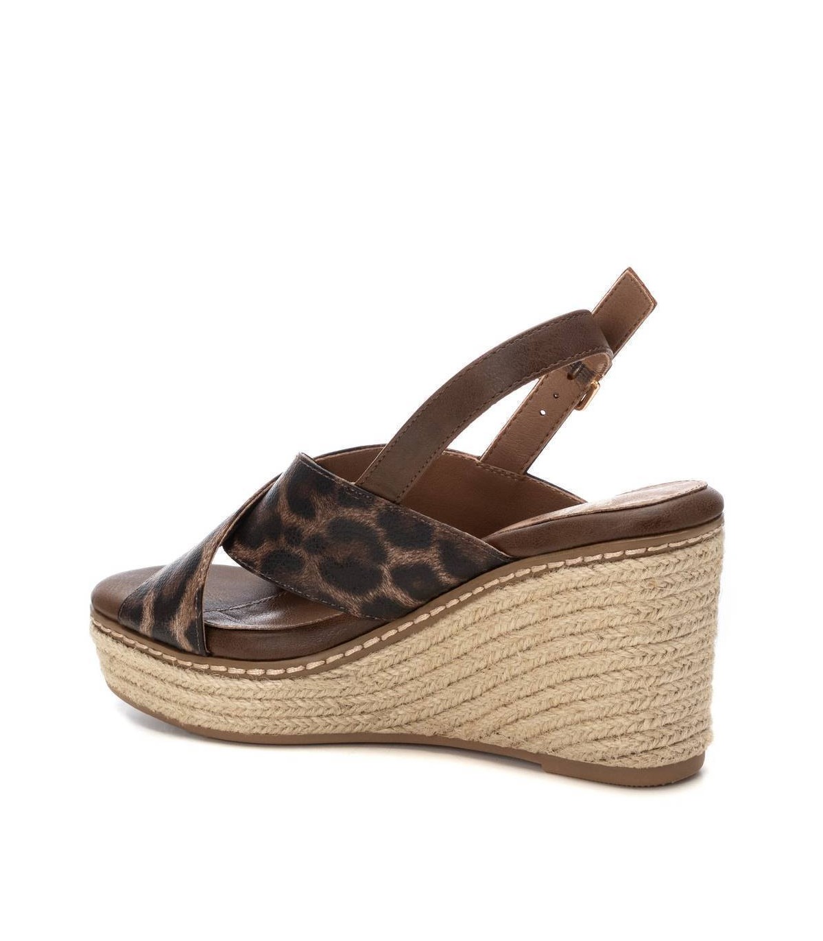 Sandalia de mujer con cuña, de la marca Xti. Diseño con material que imita la piel con acabado animal print. Cierre con hebilla metálica para facilitar el ajuste. Cuña de 8 cm de yute con plataforma delantera y suela de goma antideslizante. Este modelo ha obtenido el certificado vegano por la organización mundial PETA (Organización de los derechos de los animales).