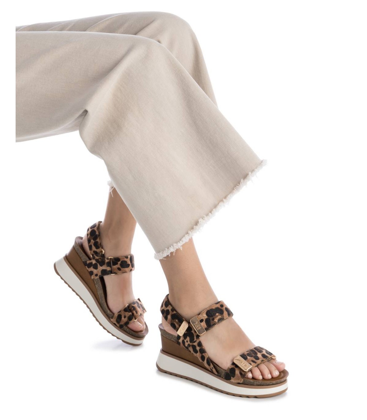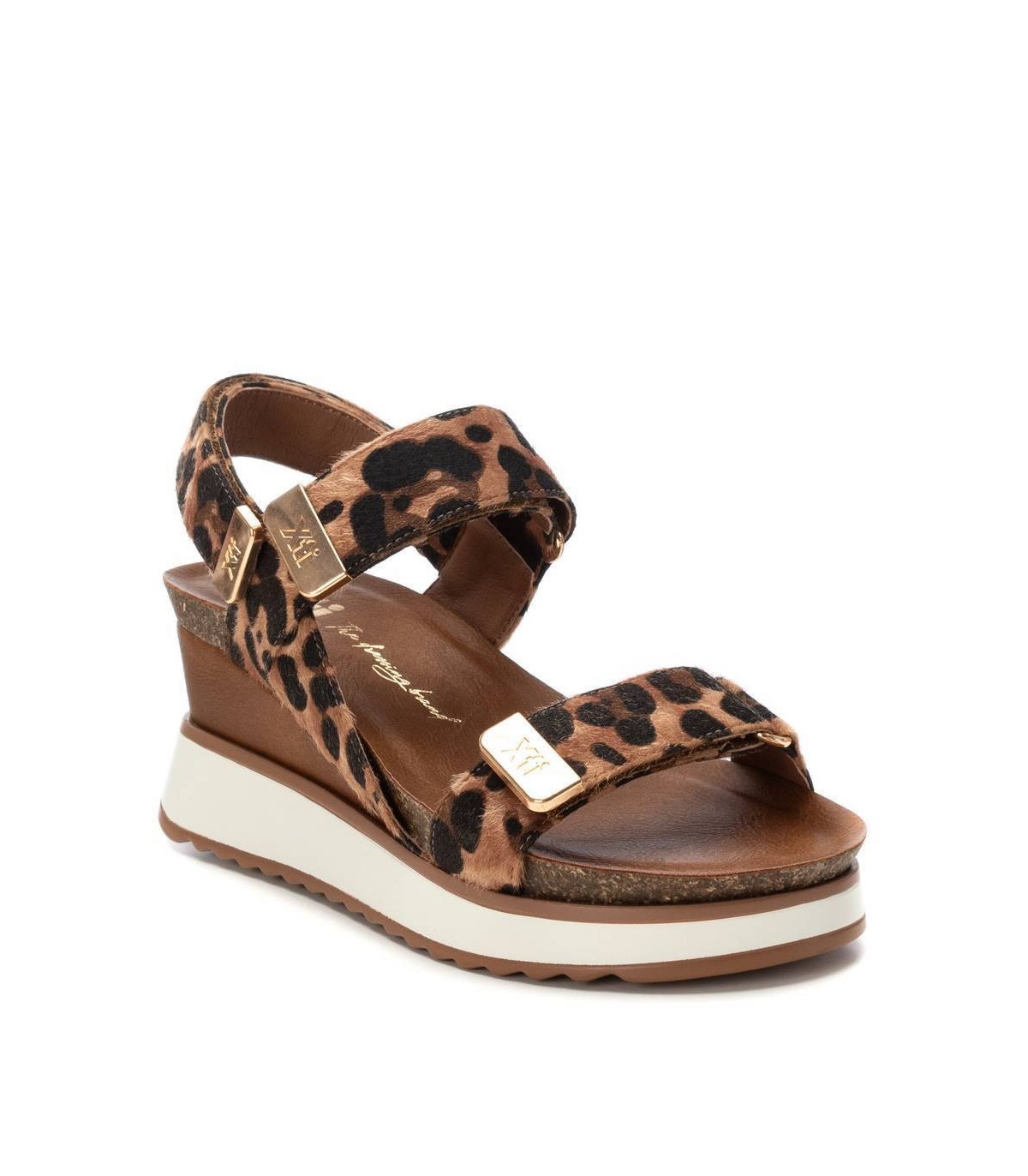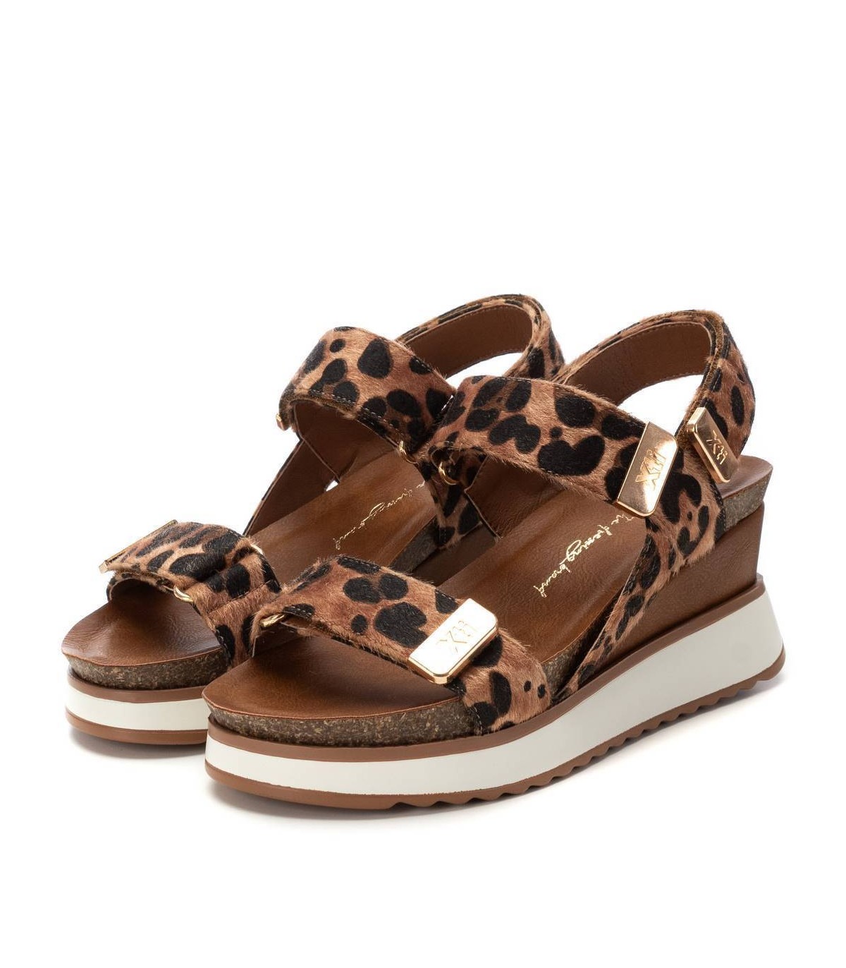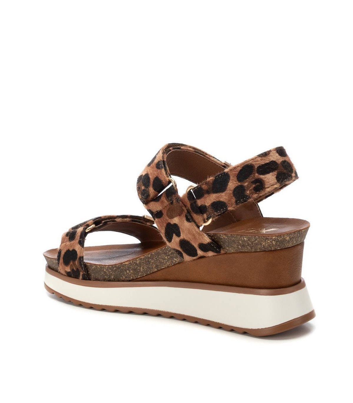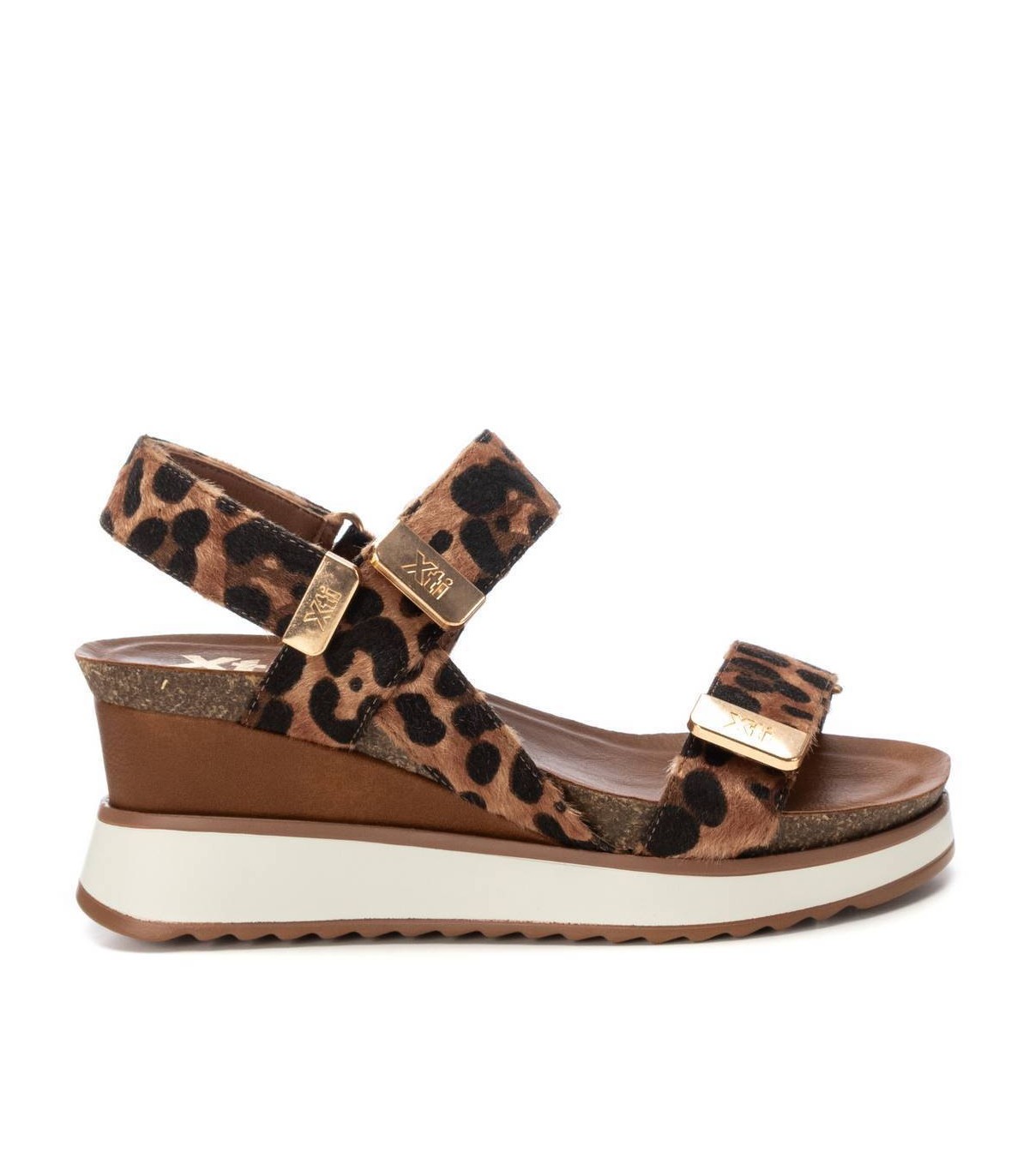 Sandalia de mujer con cuña, de la marca Xti. Fabricada en material que imita la piel con animal print , se convertirá en uno de tus esenciales de esta temporada. Detalles metalizados para un mejor acabado. Cierre mediante tira adherente. Planta bios. Cuña de 7 cm con suela de goma antideslizante. Este modelo ha obtenido el certificado vegano por la organización mundial PETA (Organización de los derechos de los animales).
