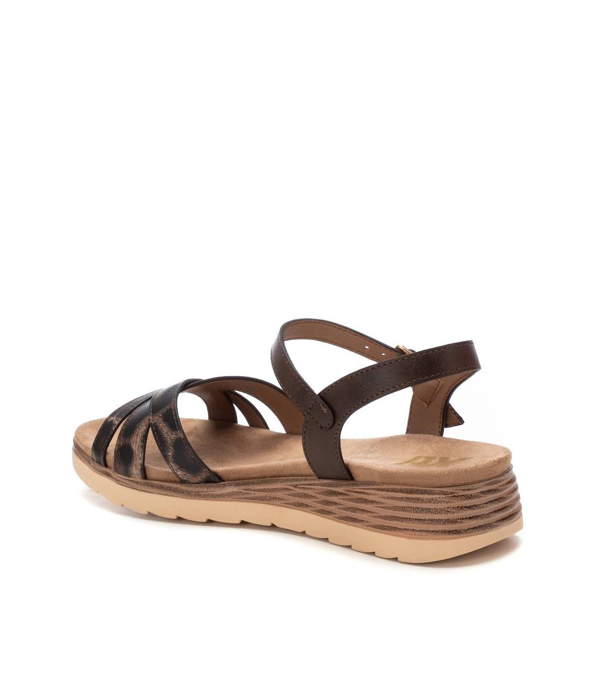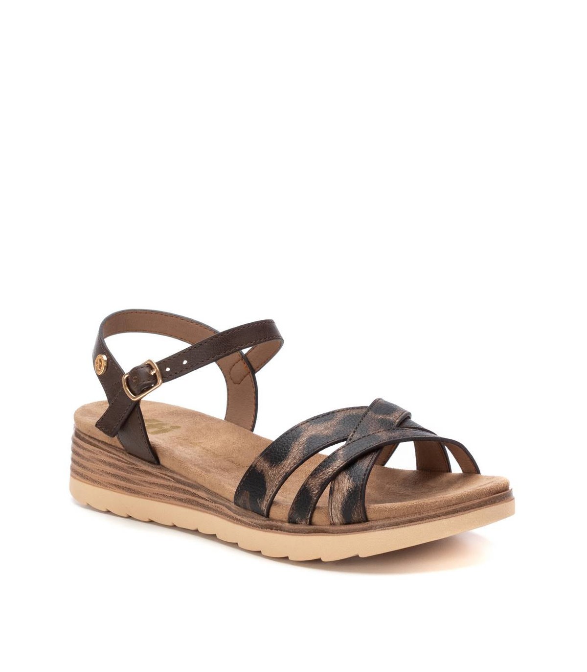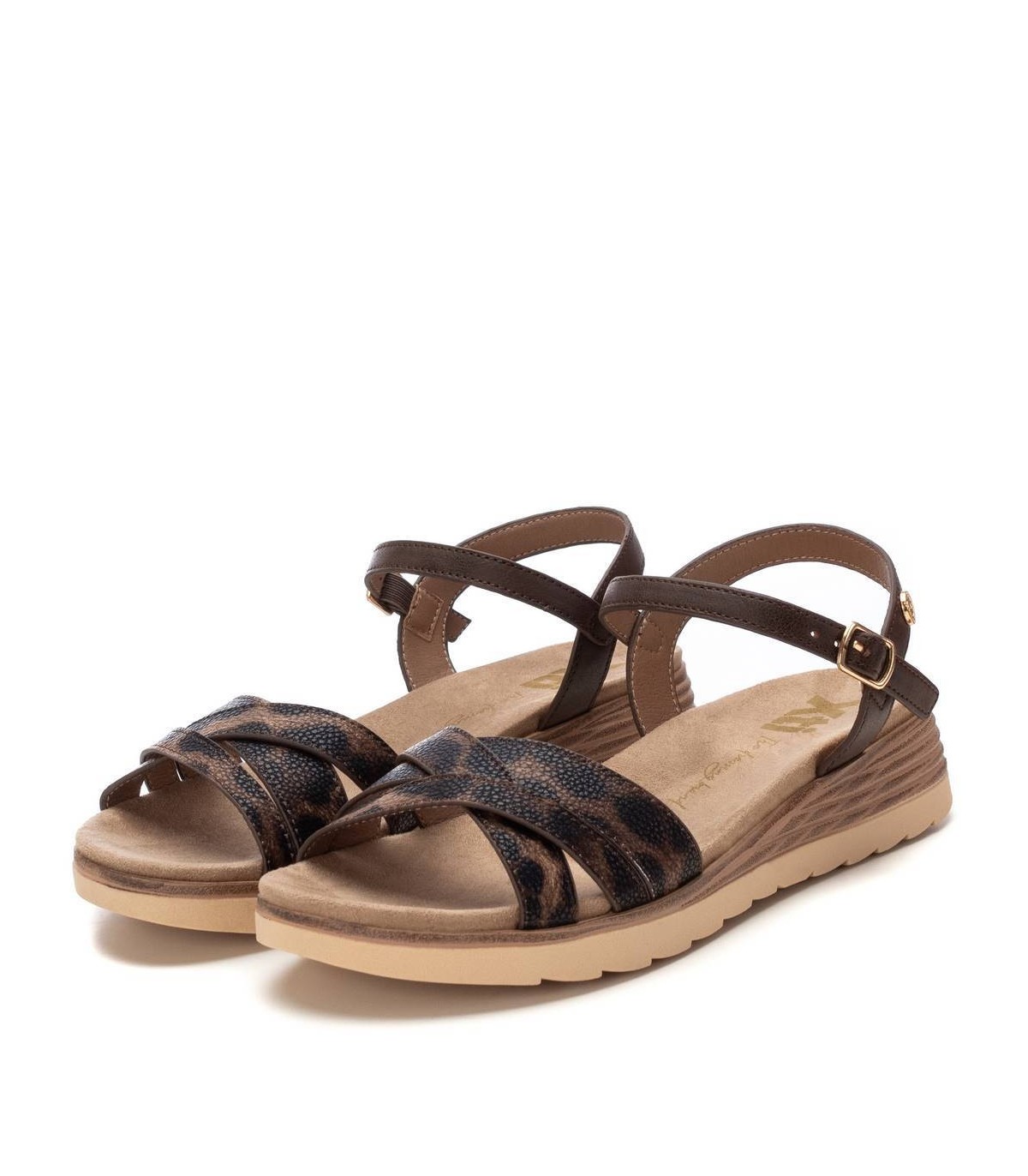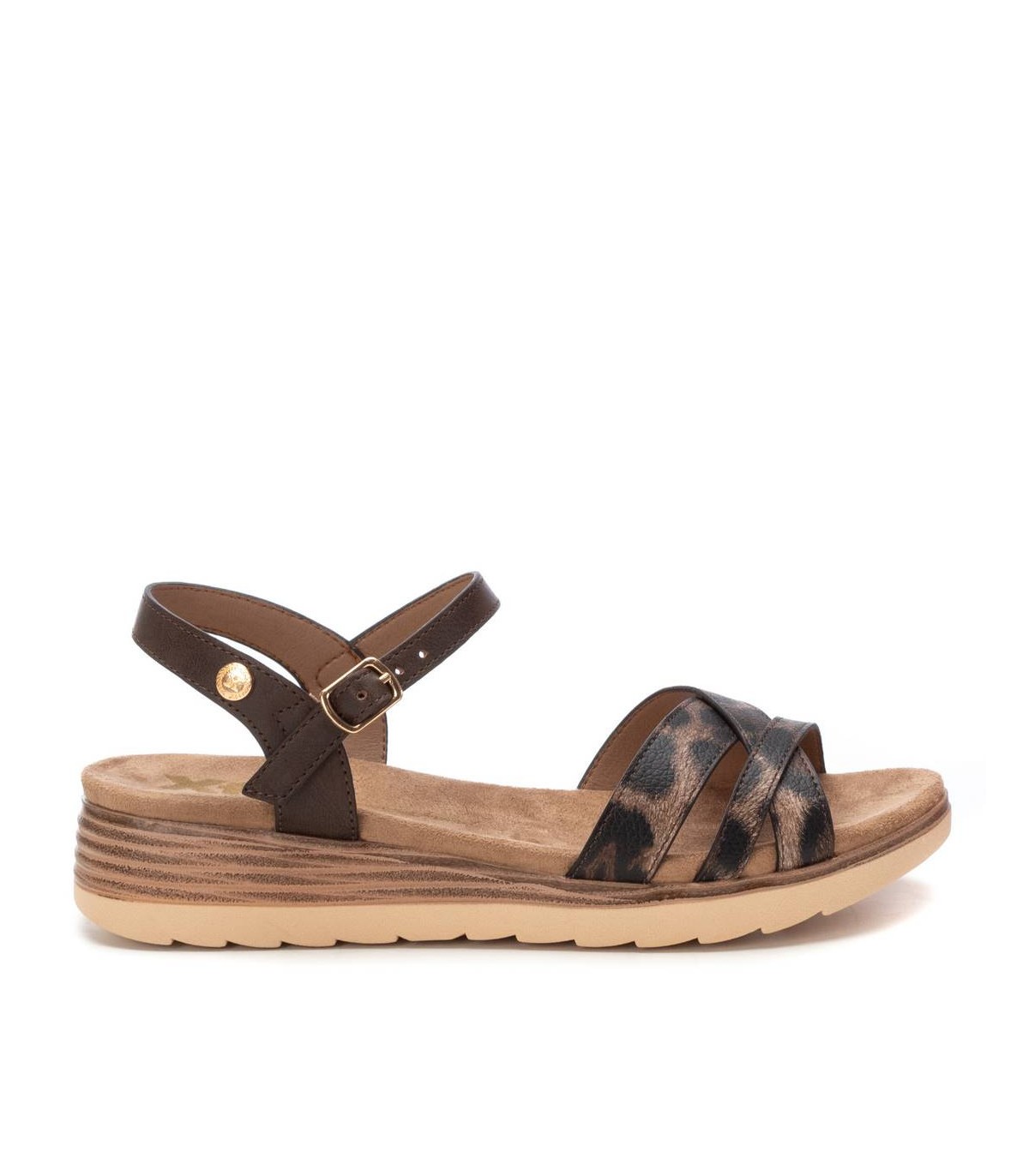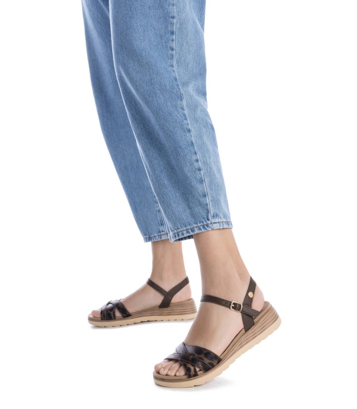 Sandalia de mujer, de la marca Xti. Fabricada en material que imita la piel con animal print. Pulsera con hebilla metálica para ajustar al tobillo. Cómoda planta acolchada con pequeña plataforma de 4 cm de altura con efecto madera. Suela de goma antideslizante. Este modelo ha obtenido el certificado vegano por la organización mundial PETA (Organización de los derechos de los animales).