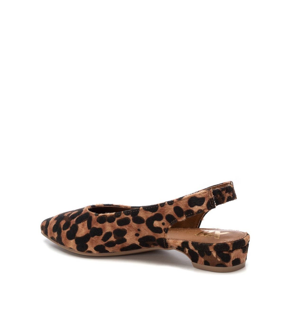 Zapato destalonado de mujer, de la marca Xti. Fabricado en material que imita la piel con animal print. Modelo con pulsera elástica en el tobillo con muy buena sujeción. Ideal para todos tus conjuntos. Este modelo ha obtenido el certificado vegano por la organización mundial PETA (Organización de los derechos de los animales).