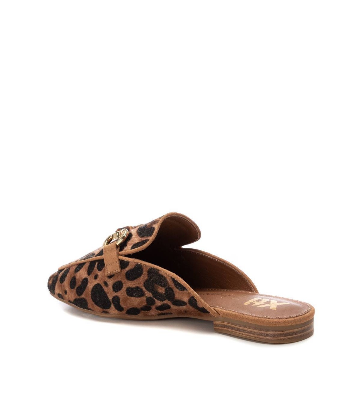 Mocasín destalonado de mujer, de la marca Xti. Fabricado en material que imita la piel , perfecto para tus looks de primavera/ verano pero con un toque de animal print. Con trabilla decorativa al en color oro. Suela plana y antideslizante. Este modelo ha obtenido el certificado vegano por la organización mundial PETA (Organización de los derechos de los animales).