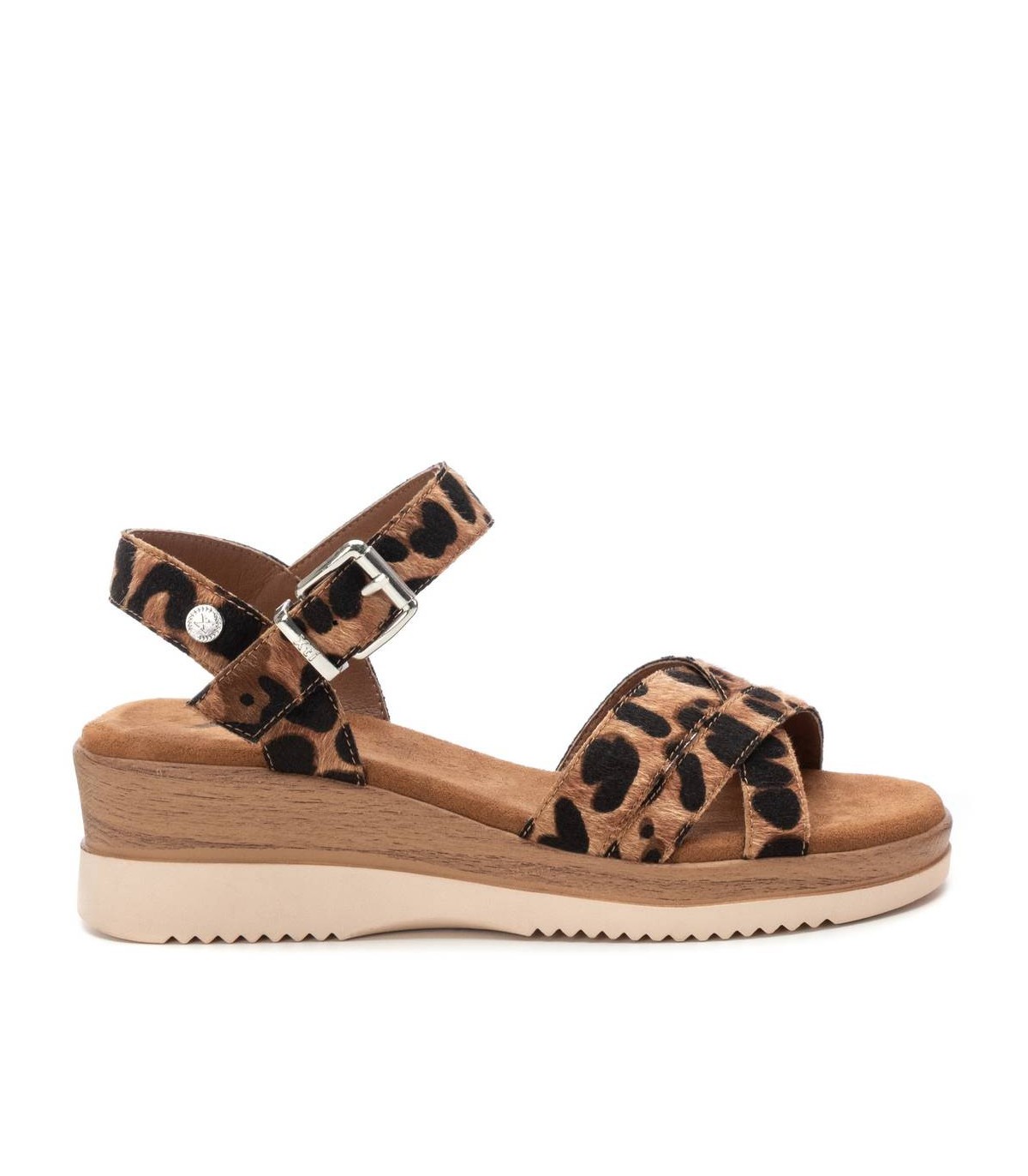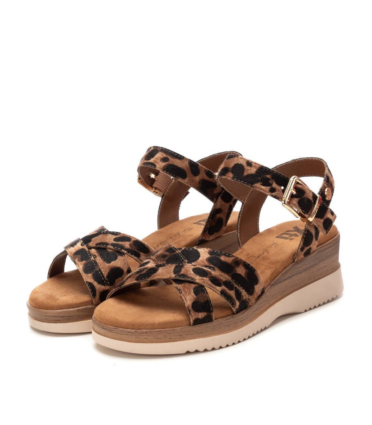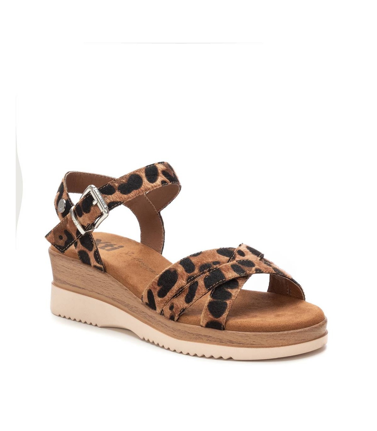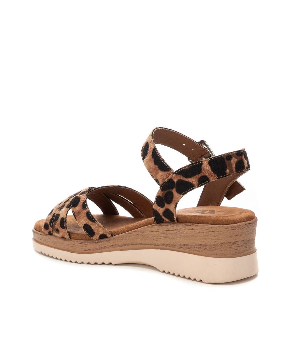 Sandalia de mujer, de la marca Xti. Fabricada en material que imita la piel con animal print. Modelo multitiras y pulsera en el tobillo con sujeción mediante hebilla metálica. Cuña baja super cómoda y suela antideslizante. Este modelo ha obtenido el certificado vegano por la organización mundial PETA (Organización de los derechos de los animales).