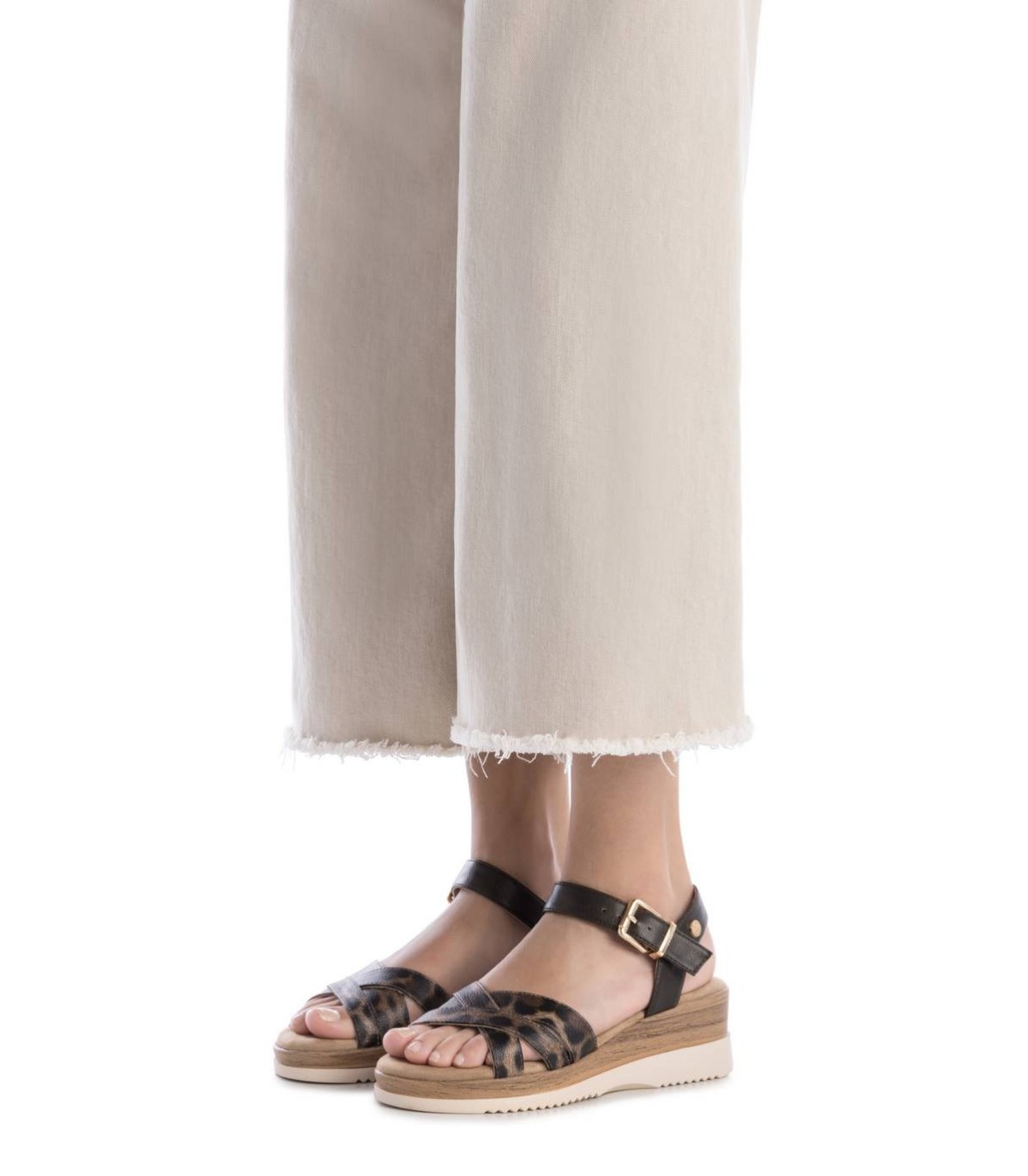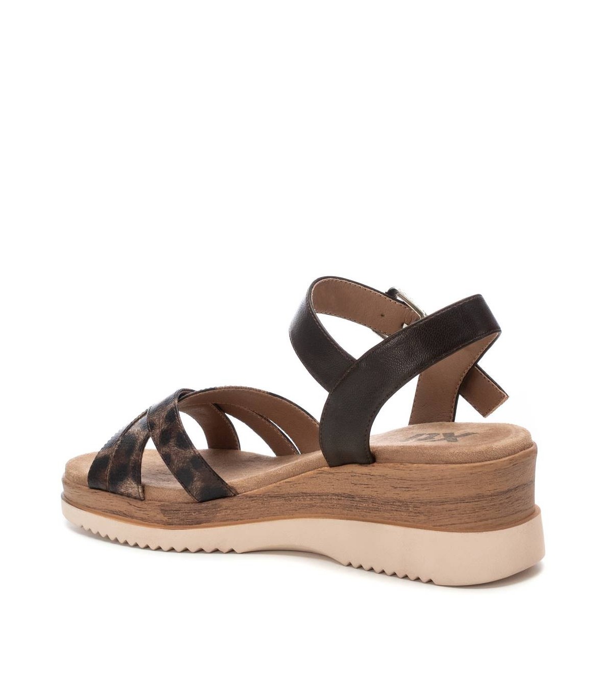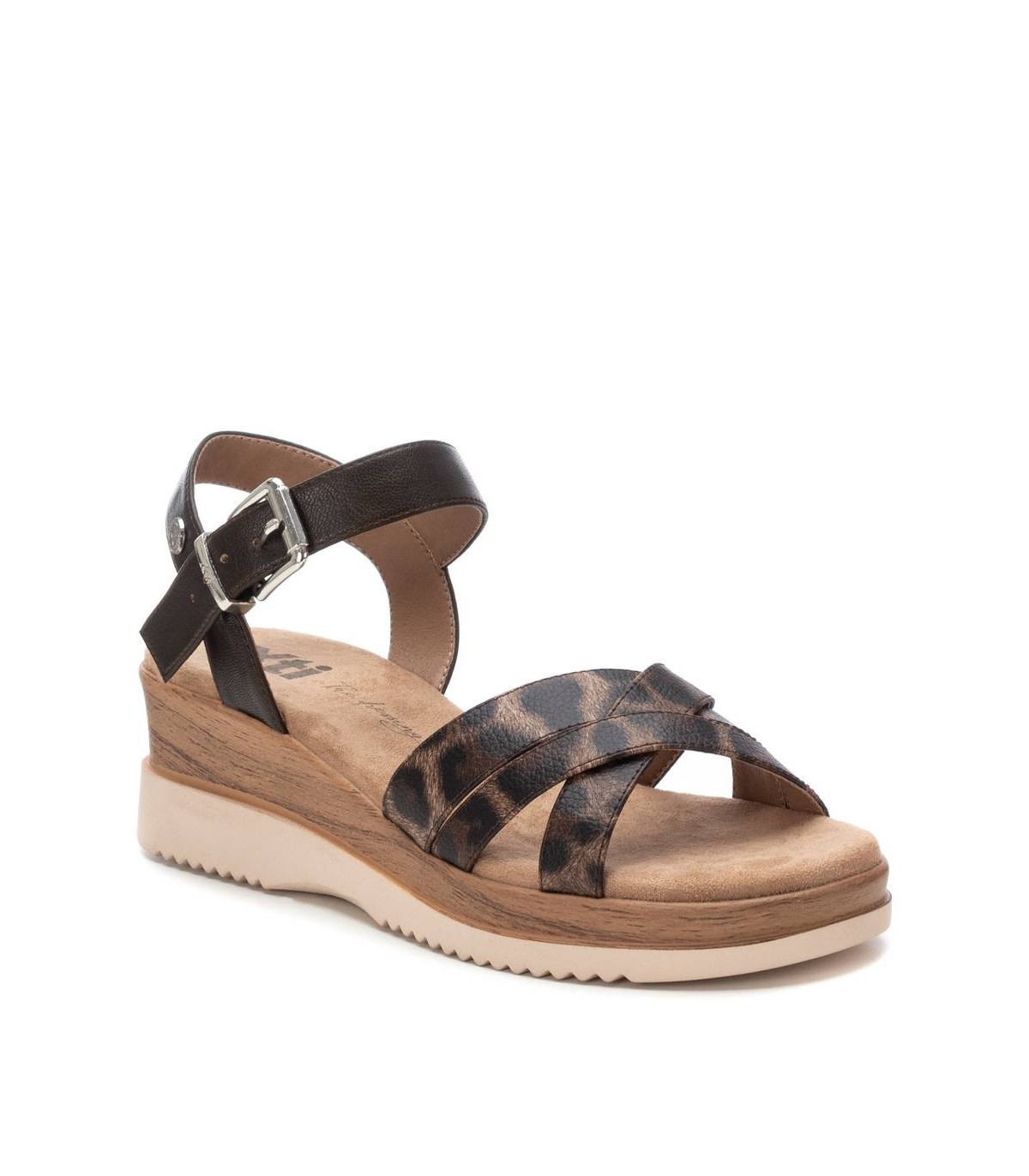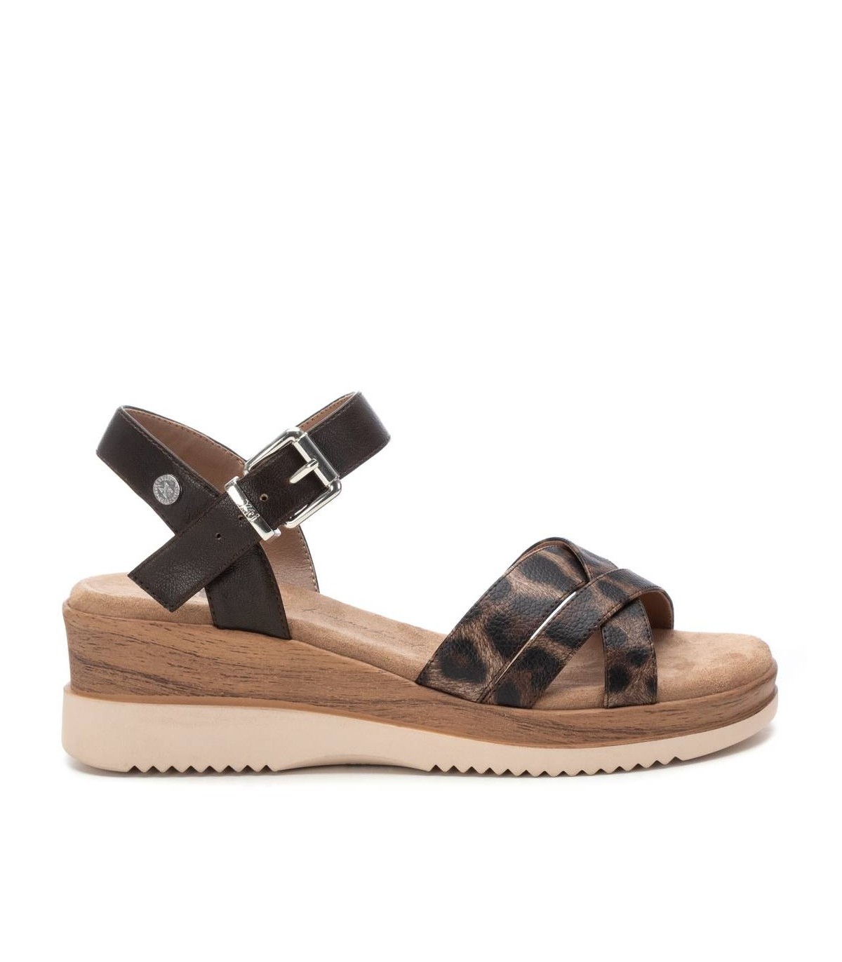Sandalia de mujer, de la marca Xti. Fabricada en material que imita la piel con animal print. Modelo multitiras y pulsera en el tobillo con sujeción mediante hebilla metálica. Cuña baja super cómoda y suela antideslizante. Este modelo ha obtenido el certificado vegano por la organización mundial PETA (Organización de los derechos de los animales).