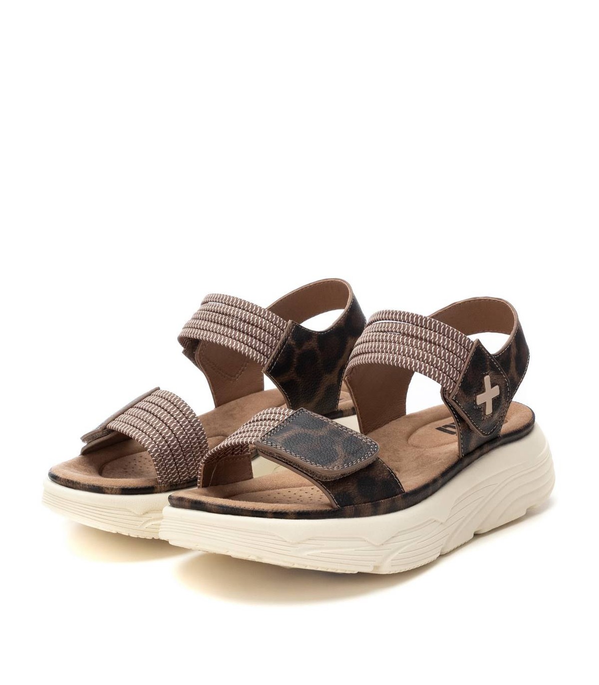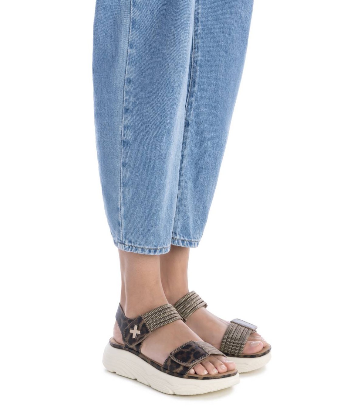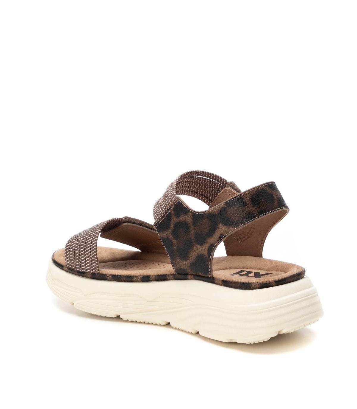 Sandalia de mujer, de la marca Xti. Fabricada en material que imita la piel con animal print combinada con tiras elásticas en el tobillo. Sujeción con cierre adhesivo, fáciles de poner y super cómodas para llevar todo el día. Suela deportiva y antideslizante. Este modelo ha obtenido el certificado vegano por la organización mundial PETA (Organización de los derechos de los animales).
