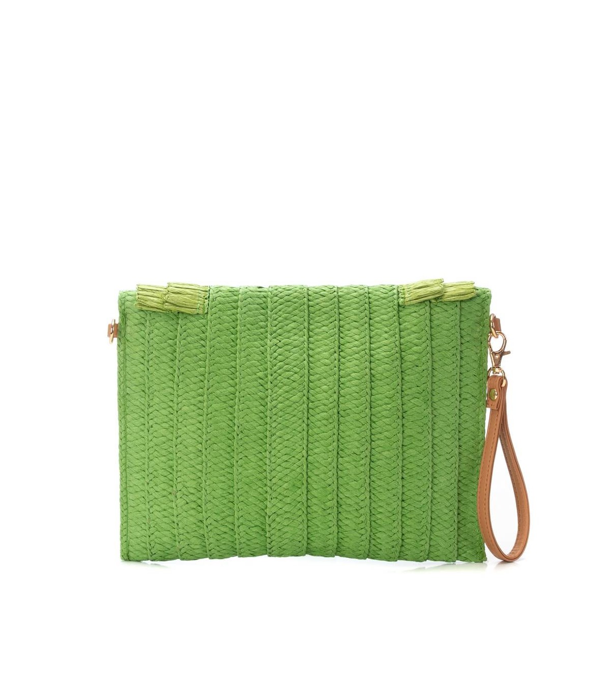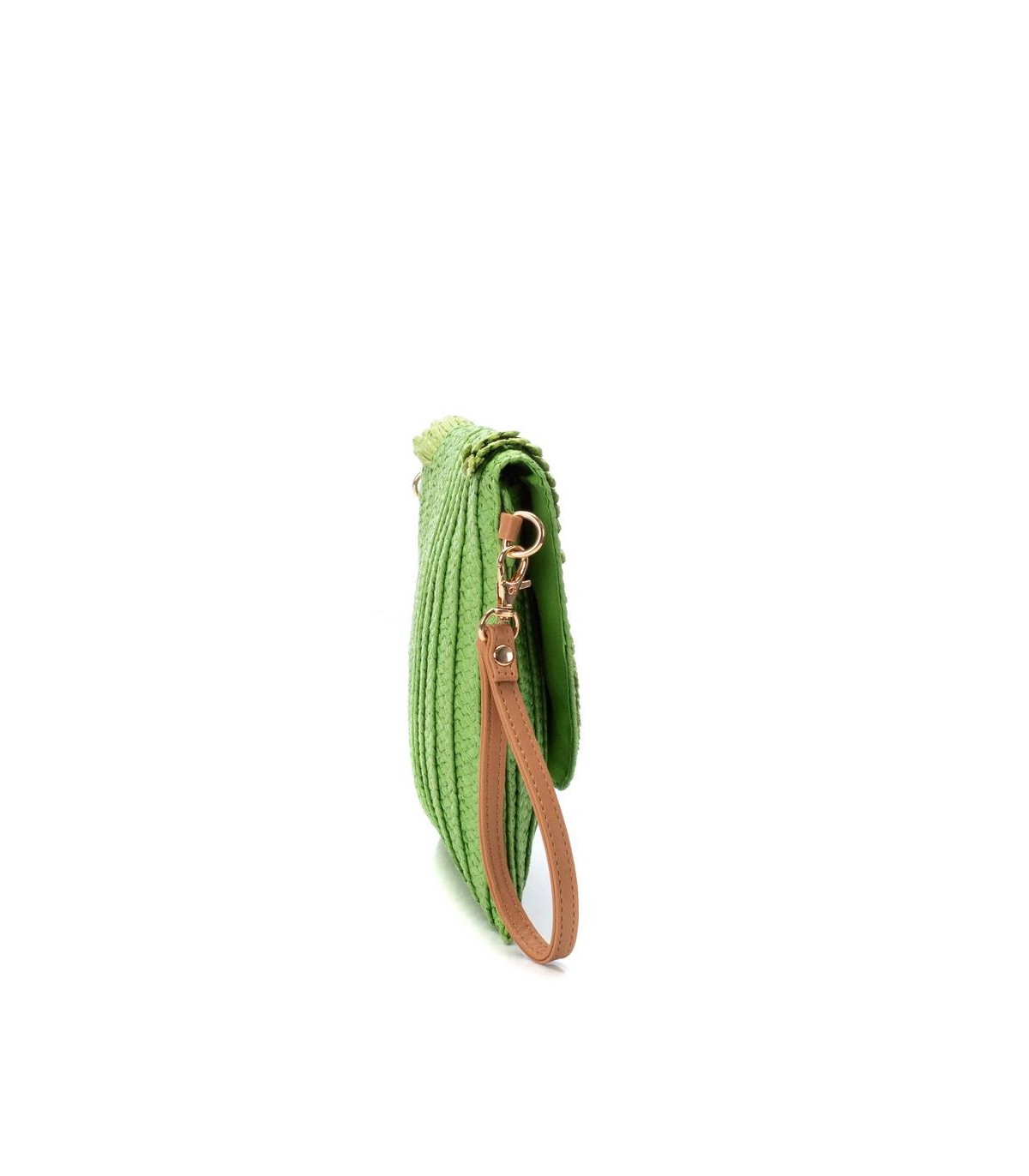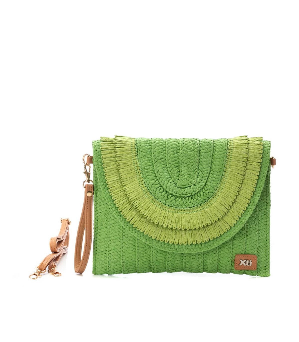 Bolso de mano pequeño, marca Xti. Fabricado en rafia de alta calidad. Cierre mediante cremallera. Con asa bandolera extraíble y regulable para mayor comodidad. Medidas 21x26x2 cm. Este modelo ha obtenido el certificado vegano por la organización mundial PETA (Organización de los derechos de los animales).