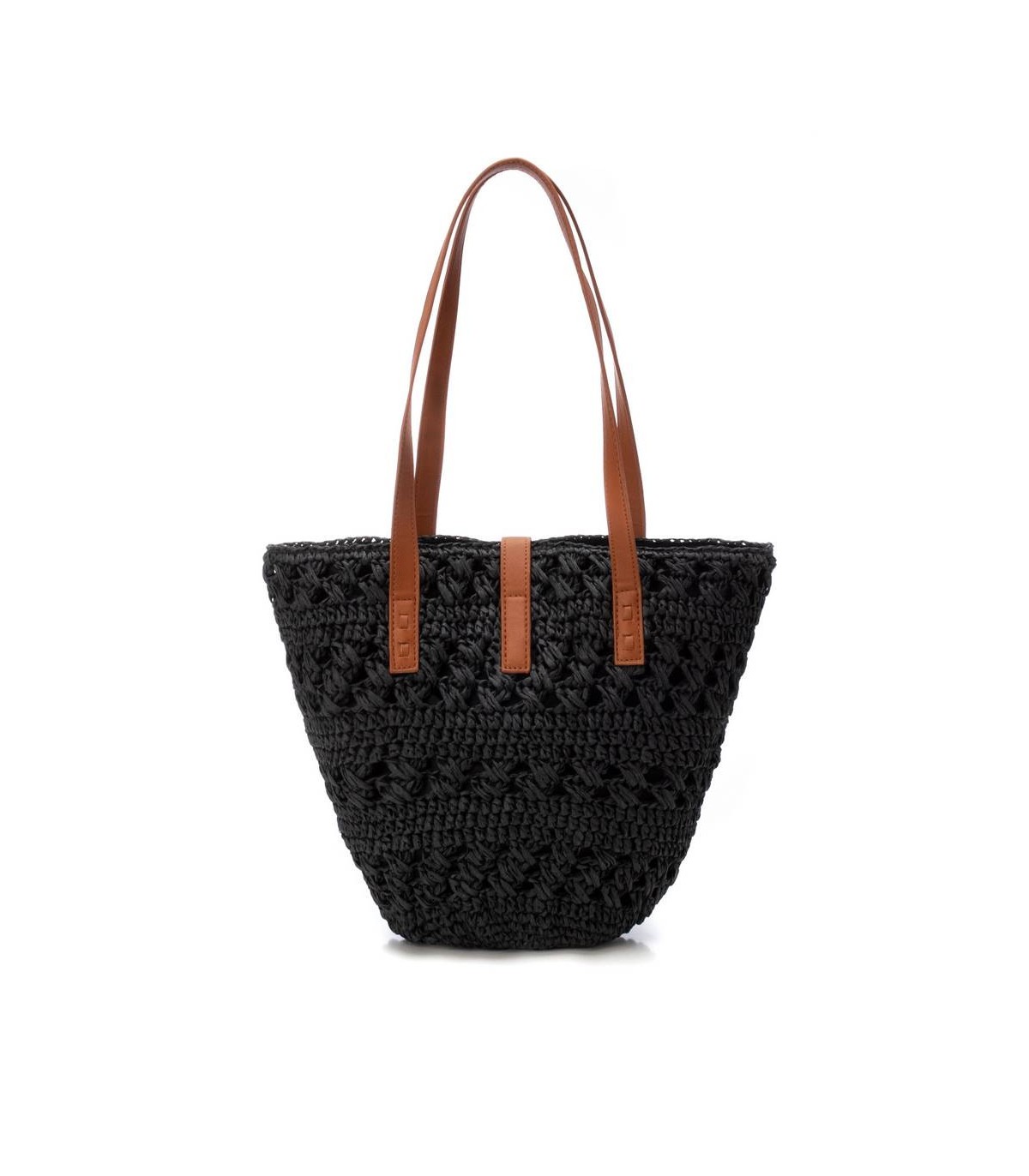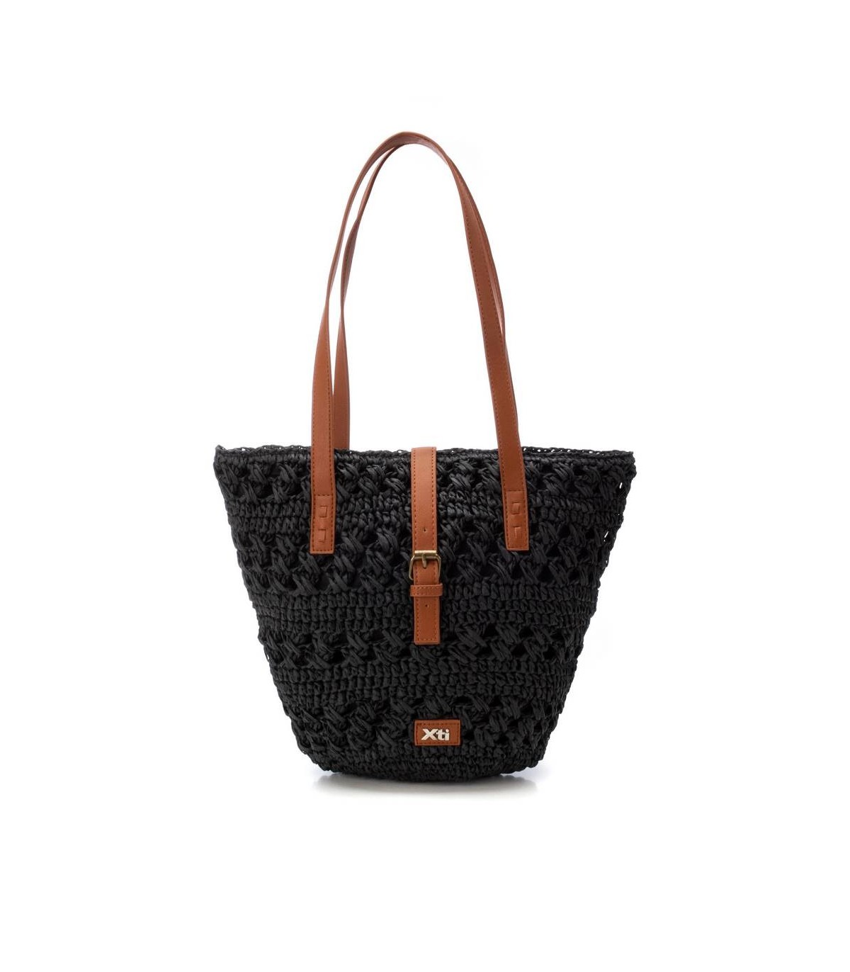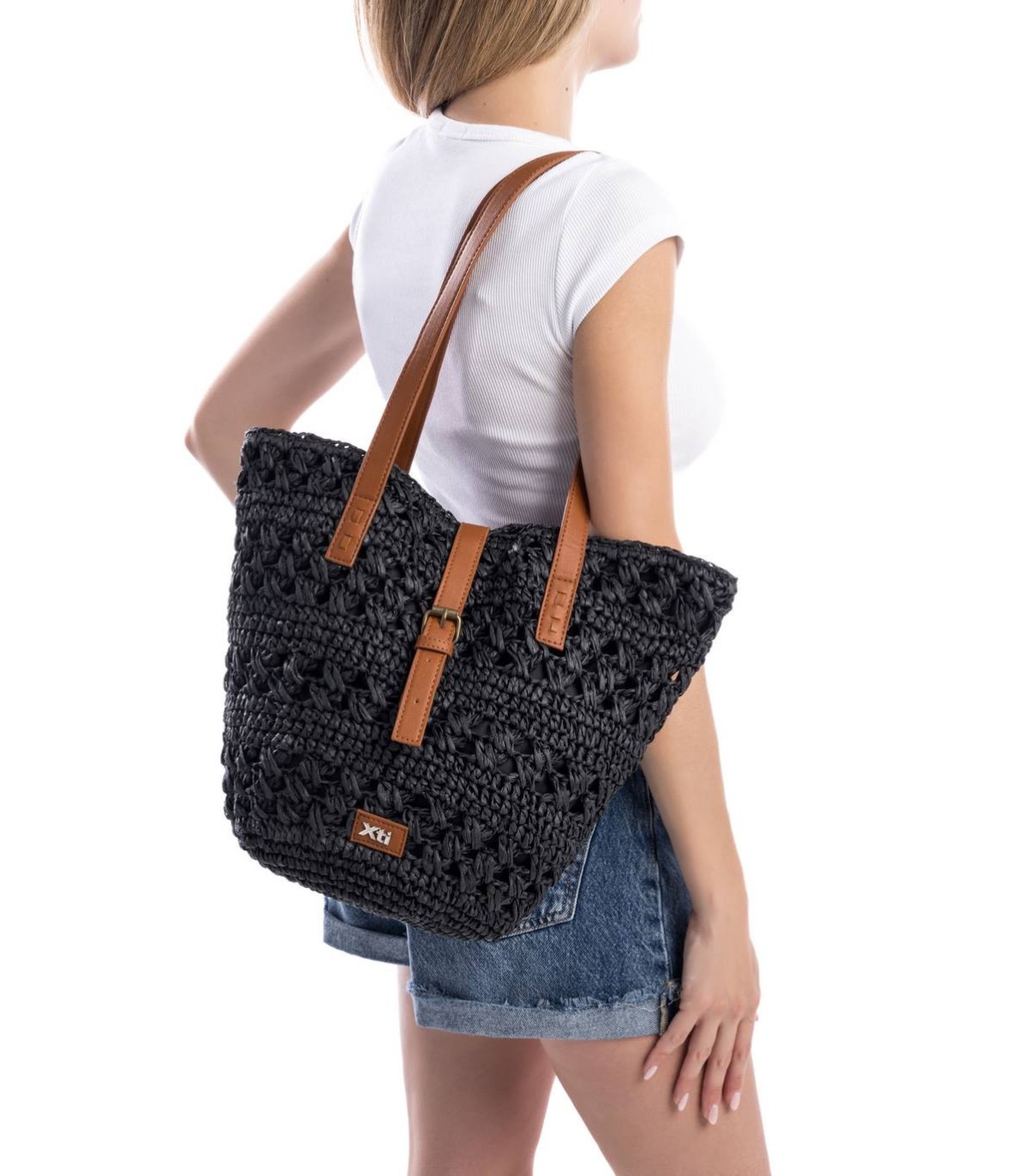 Bolso grande de hombro, marca Xti. Fabricado en rafia de alta calidad. Con cierre cremallera para mayor seguridad, detalle de cierre decorativo. Medidas 28x37x19 cm. Este modelo ha obtenido el certificado vegano por la organización mundial PETA (Organización de los derechos de los animales).