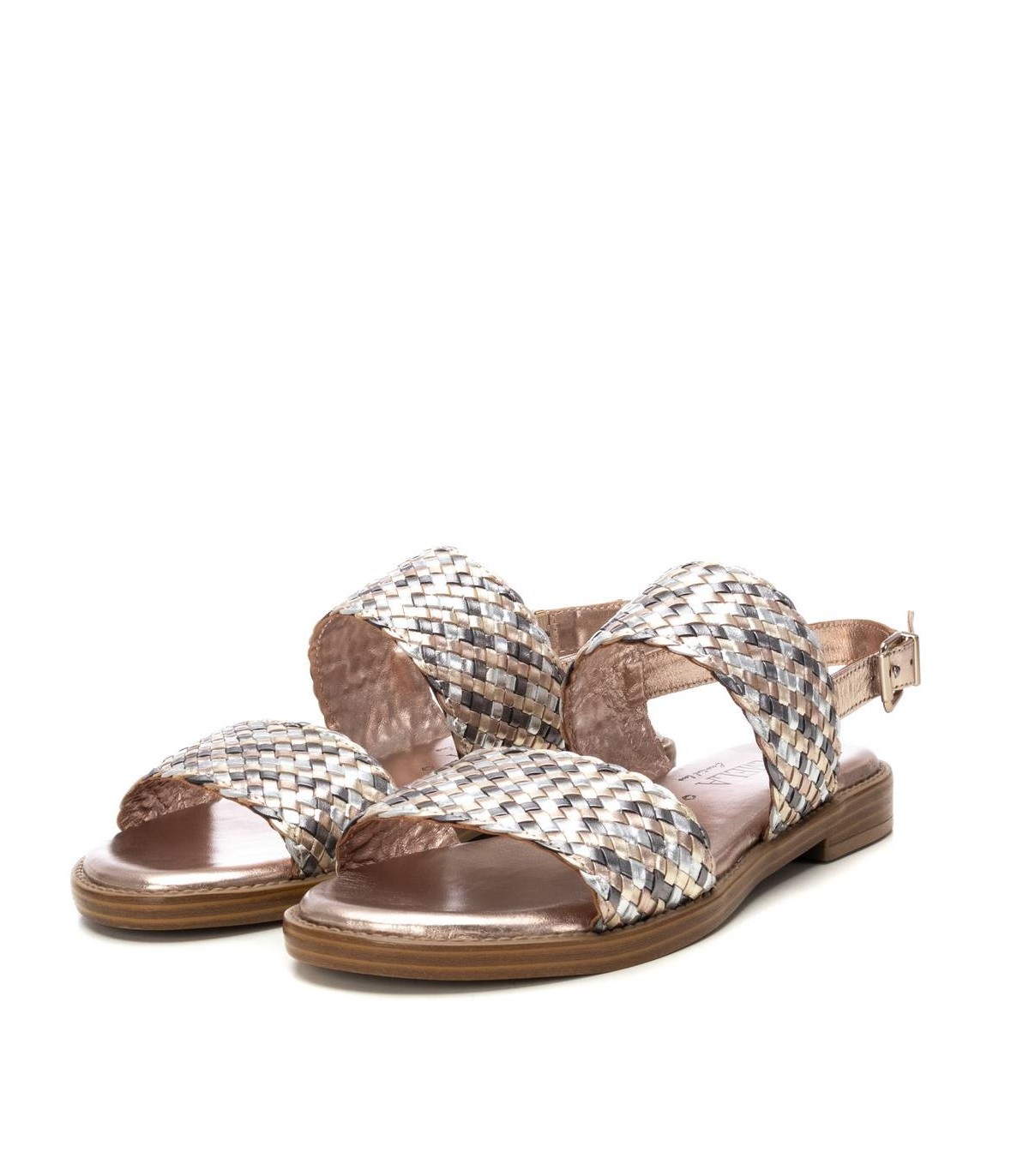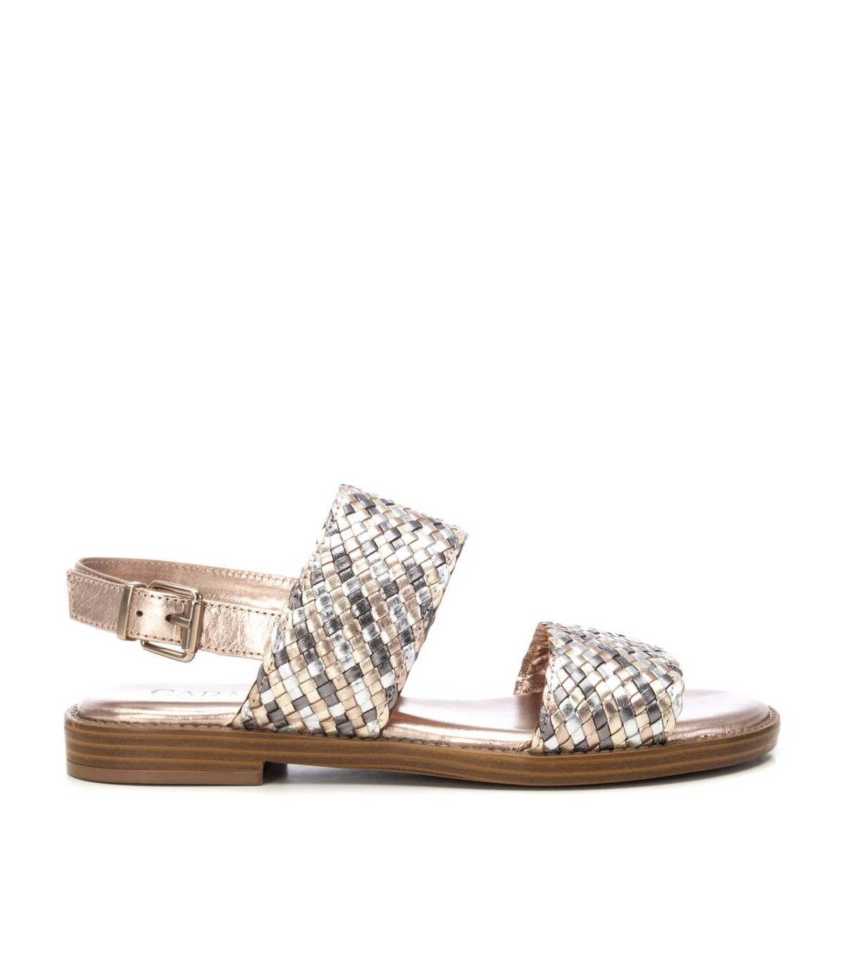 Sandalia plana de mujer, marca Carmela. Fabricada en piel de alta calidad. Modelo doble pala atado al tobillo y cierre mediante hebilla para mayor comodidad. Acabado metalizado. Ideal para la comodidad y elegancia este verano.