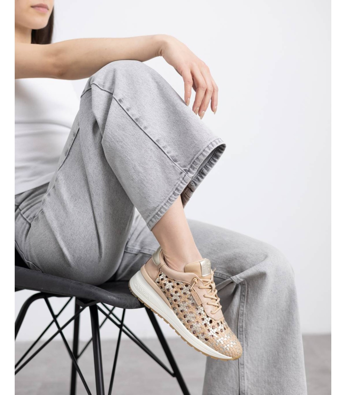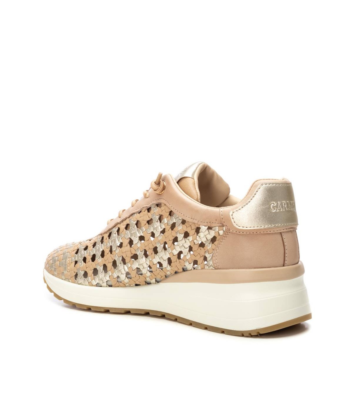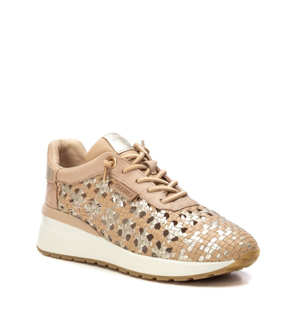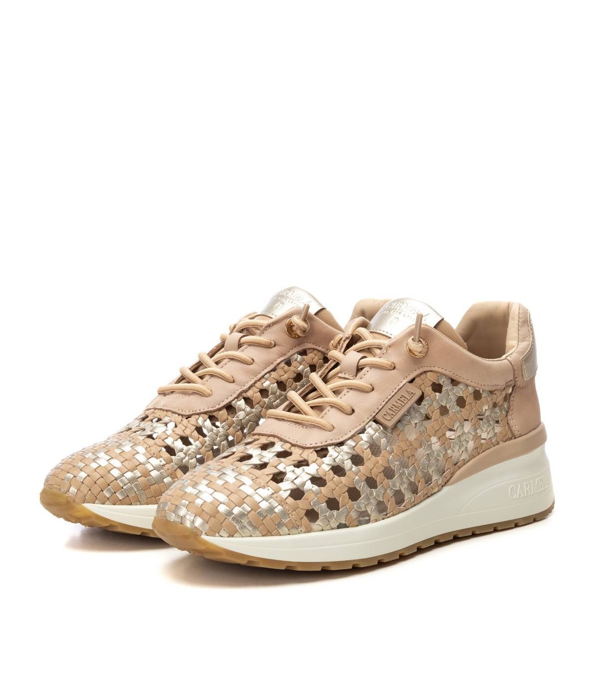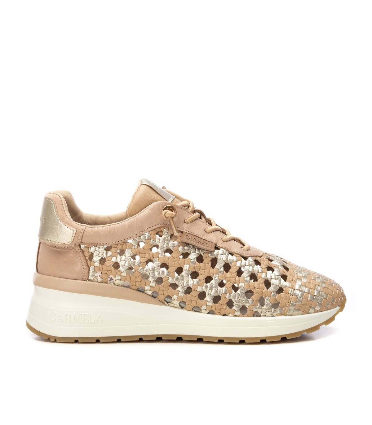 Zapatilla de mujer, marca Carmela. Fabricada en piel de alta calidad. Diseño trenzado con toques metalizados. Con plantilla extraíble. Suela de goma antideslizante.