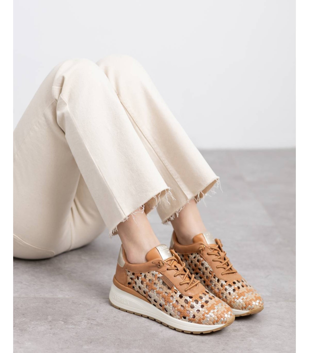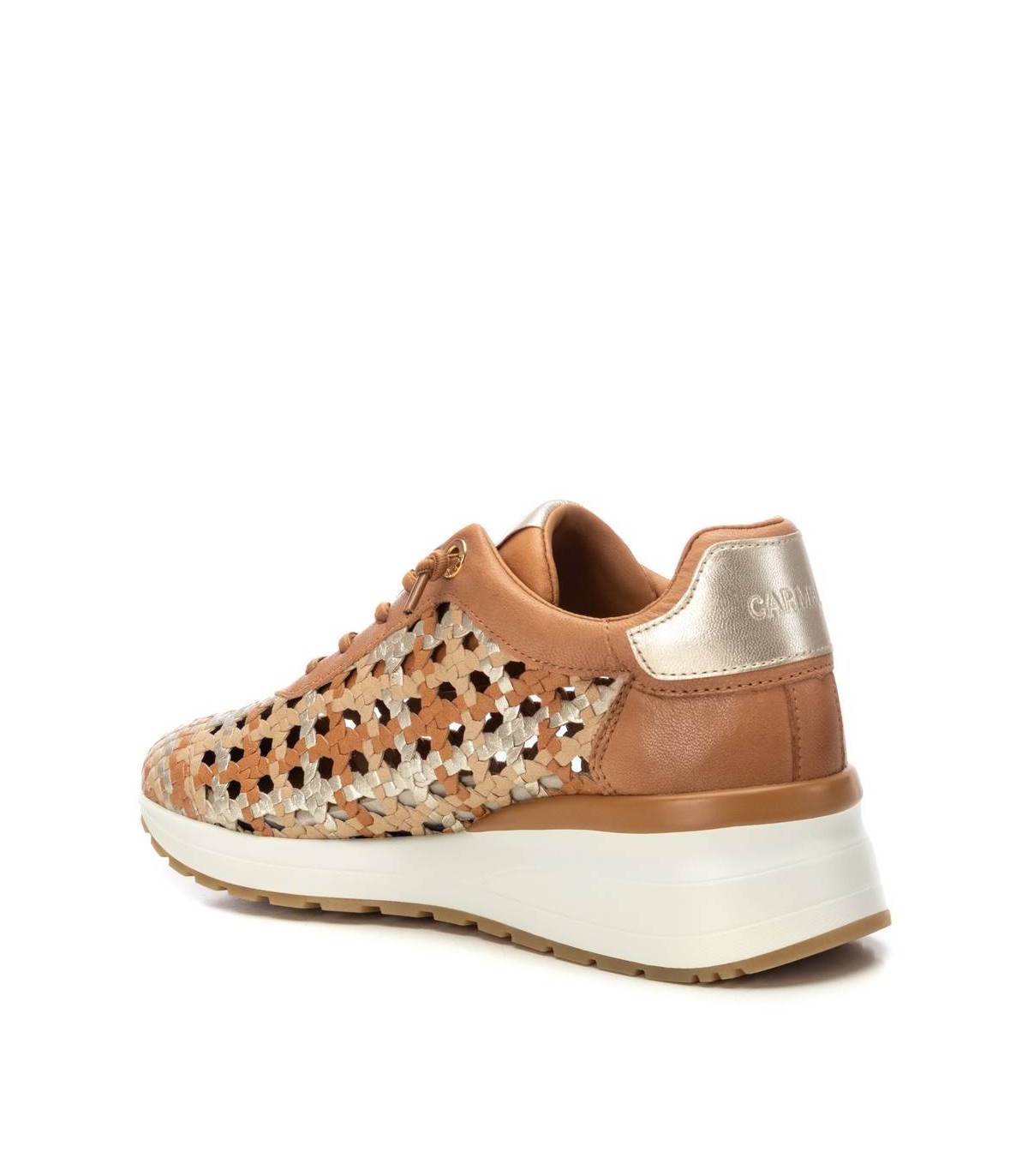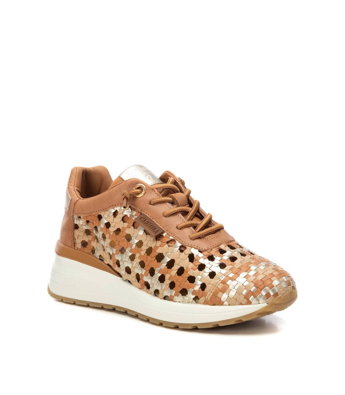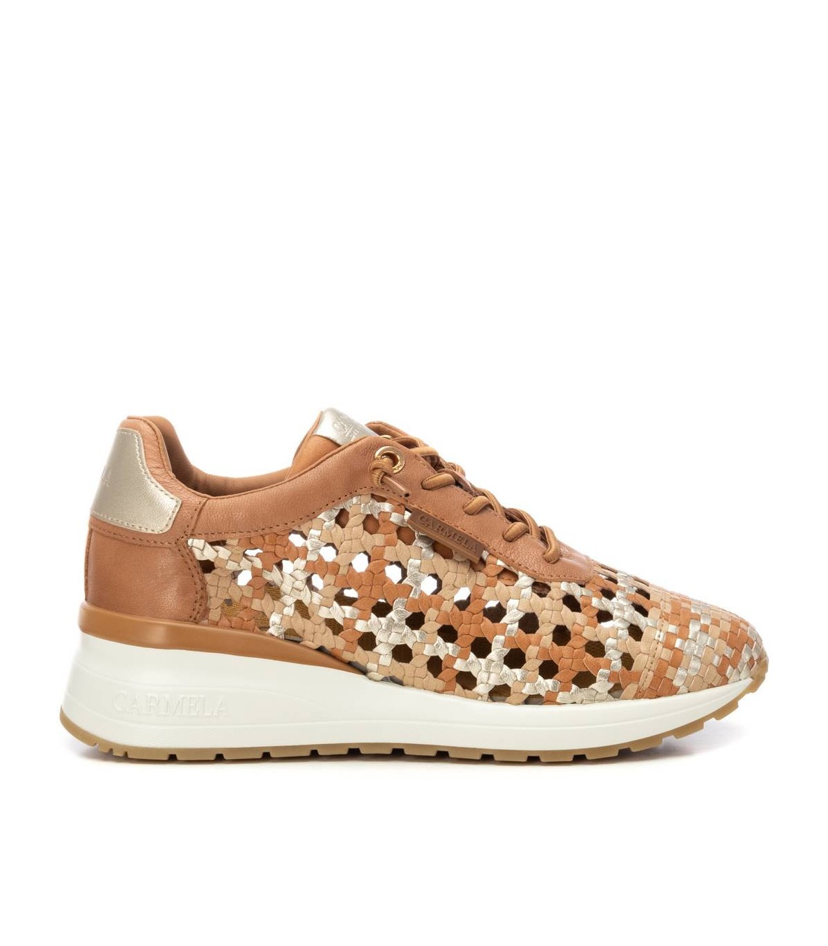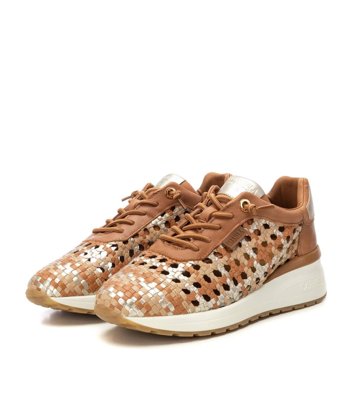 Zapatilla de mujer, marca Carmela. Fabricada en piel de alta calidad. Diseño trenzado con toques metalizados. Con plantilla extraíble. Suela de goma antideslizante.