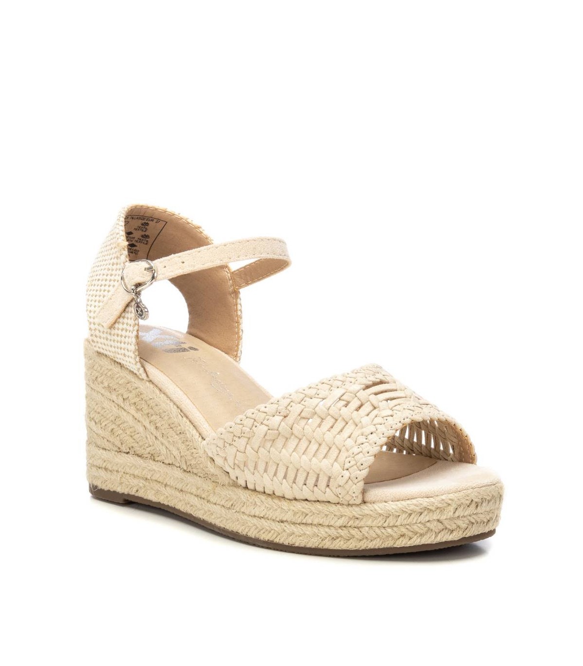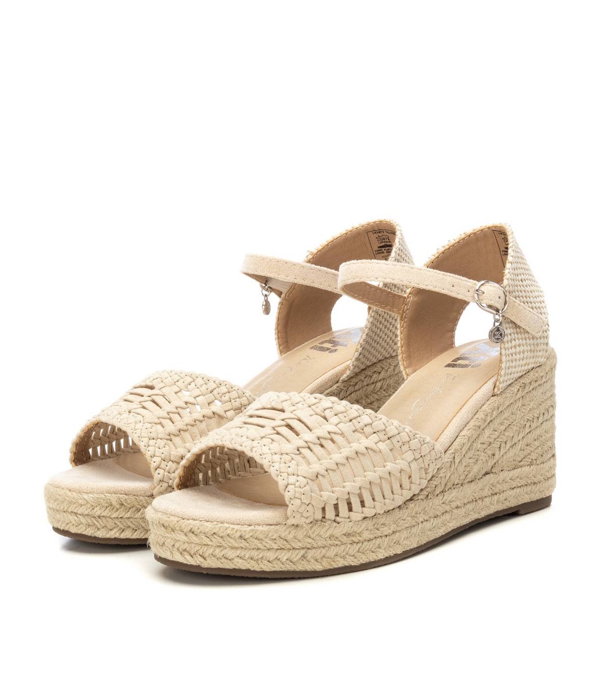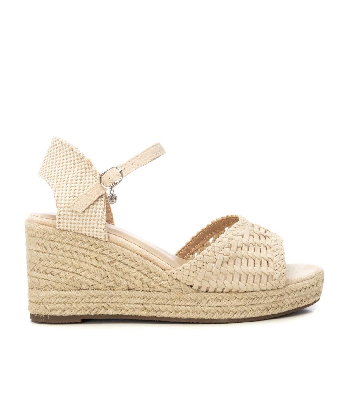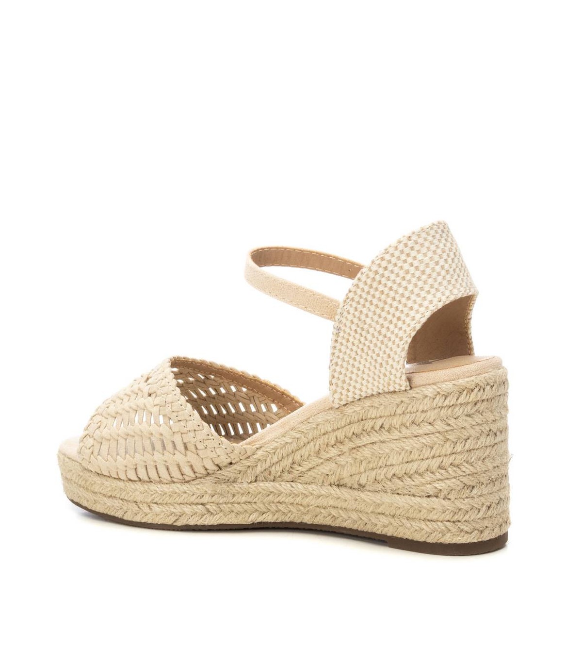 Sandalia de mujer con cuña , de la marca Xti. Diseño de pala y pulsera fabricadas en material textil. Cierre mediante hebilla metálica para facilitar el ajuste. Cuña con suela antideslizante. Este modelo ha obtenido el certificado vegano por la organización mundial PETA (Organización de los derechos de los animales).