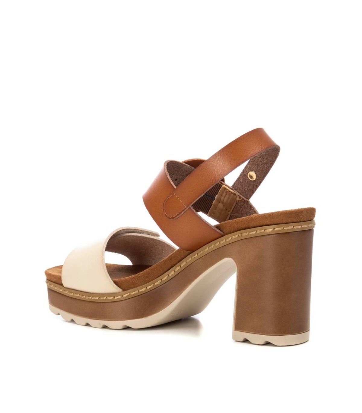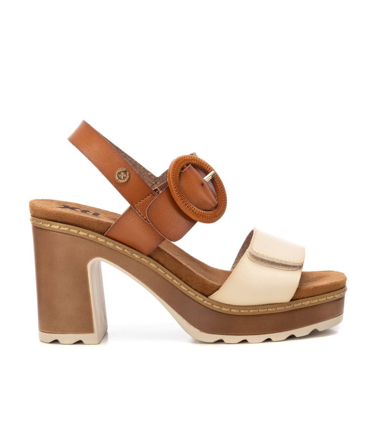 Sandalia de mujer, de la marca Xti. Fabricada en material que imita la piel. Modelo de doble pala con cierre adhesivo y hebilla decorativa para su sujeción al tobillo. Tacón con plataforma efecto madera y suela antideslizante.