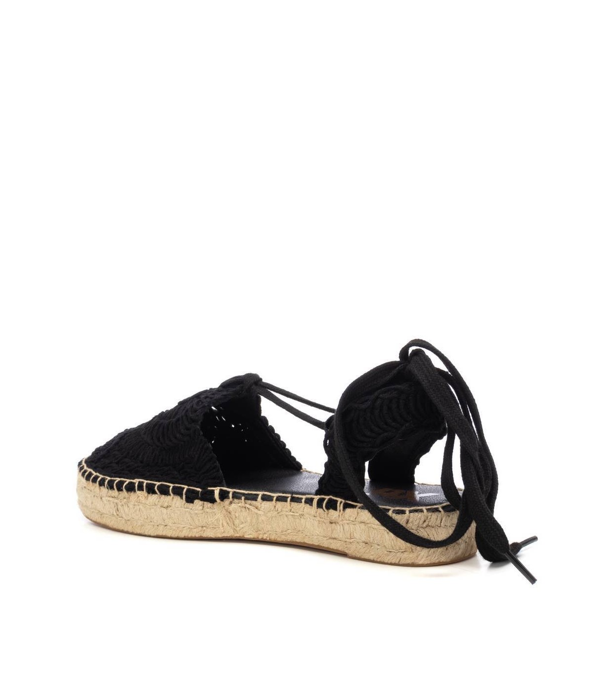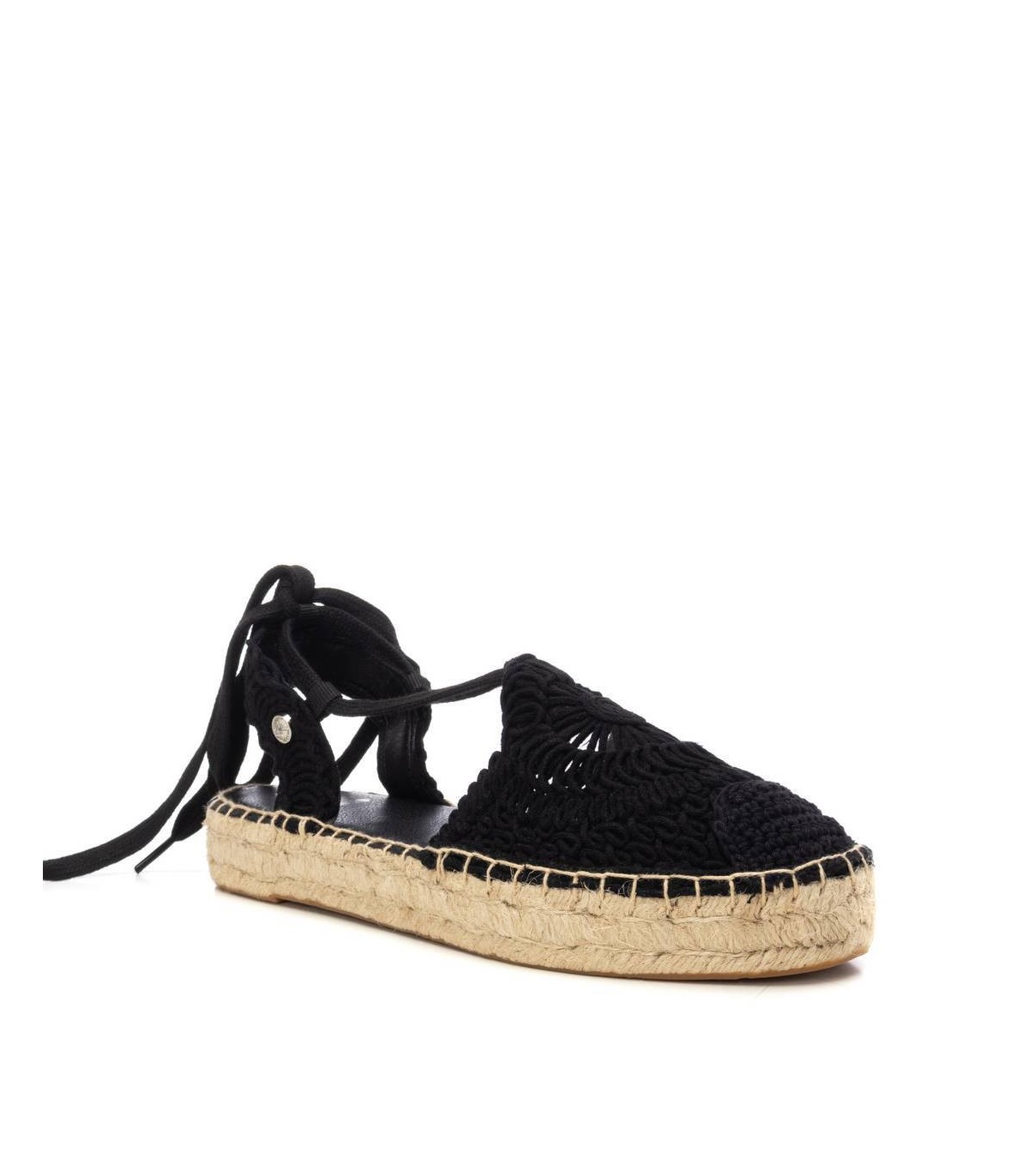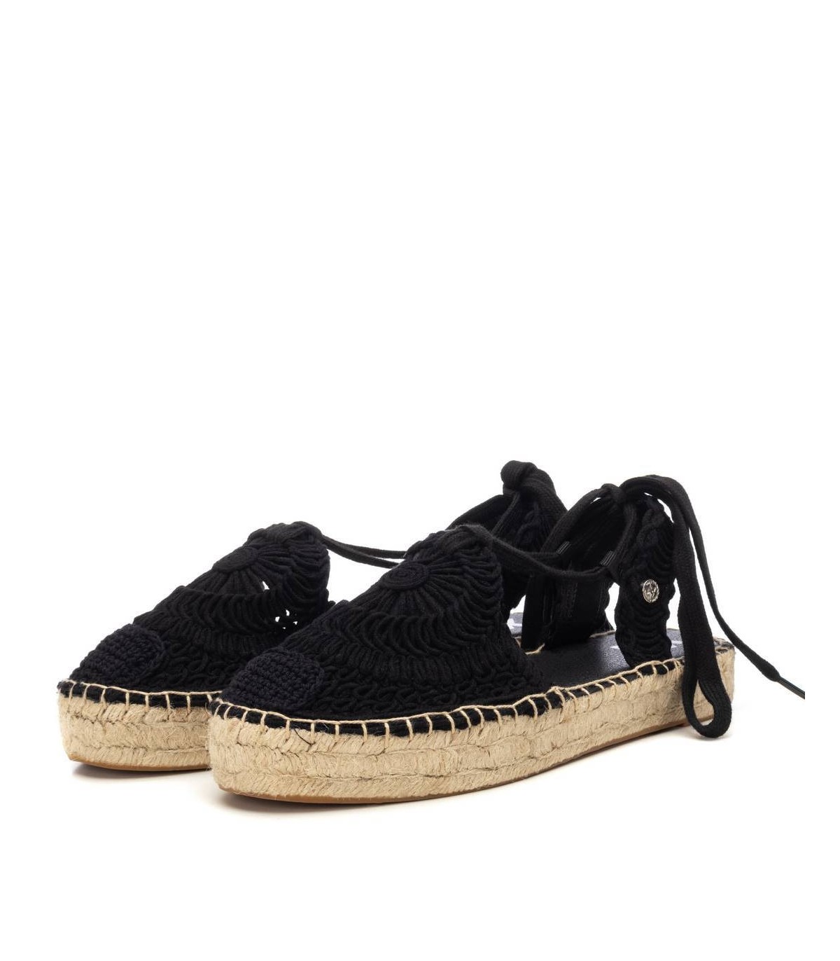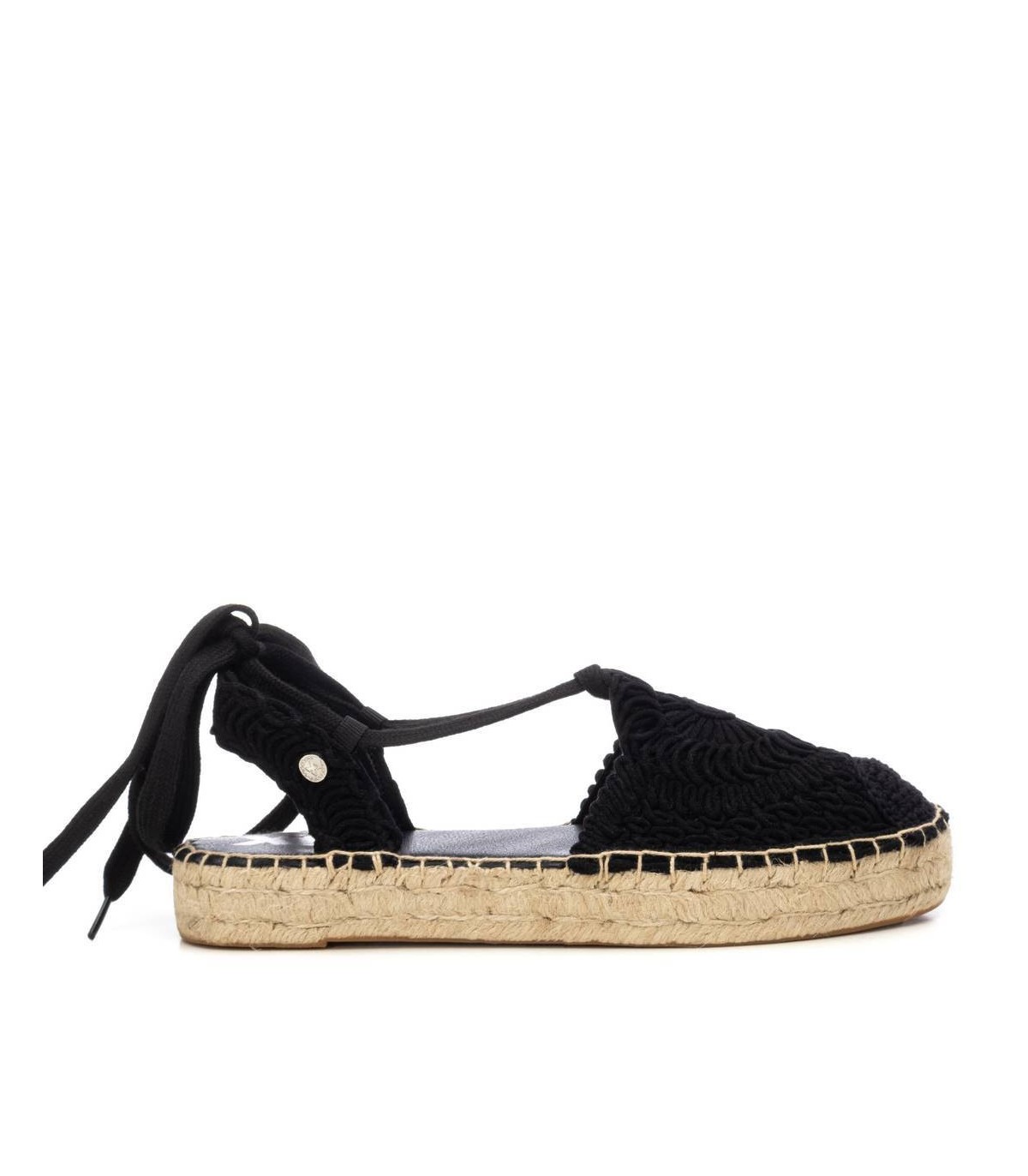 Sandalia de mujer, de la marca Xti. Fabricada en tejido estilo macramé. Cierre mediante cordones. Plataforma de yute con suela de goma antideslizante. Este modelo ha obtenido el certificado vegano por la organización mundial PETA (Organización de los derechos de los animales).