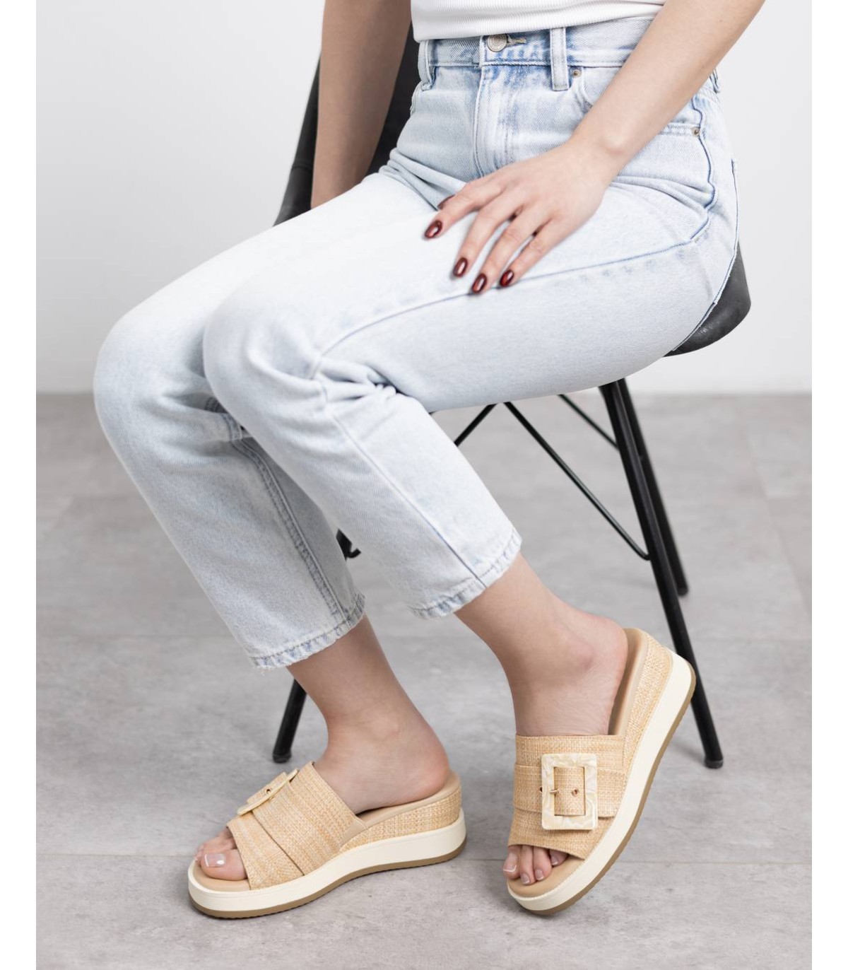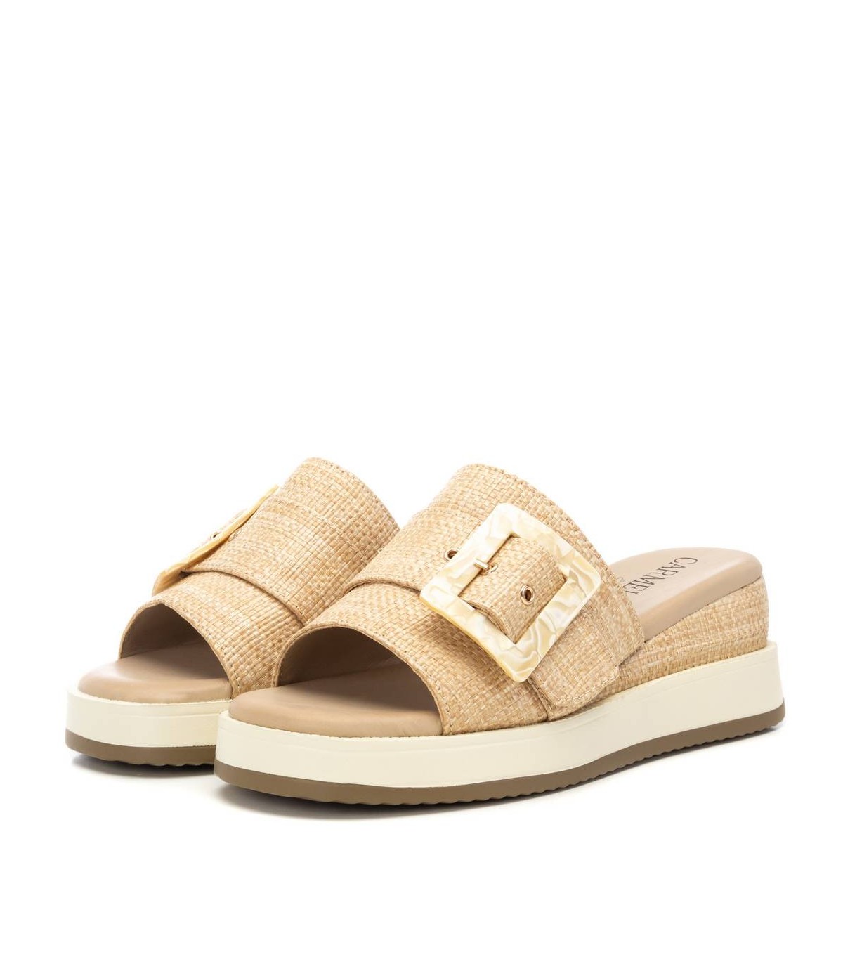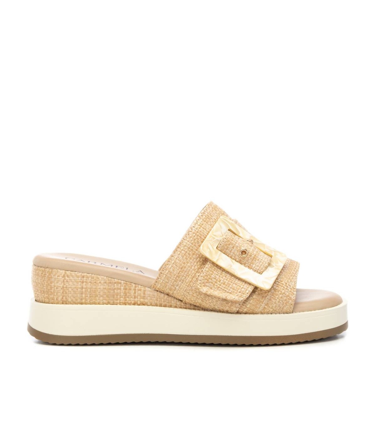 Sandalia de mujer, marca Carmela. Fabricada en rafia de alta calidad, con adorno decorativo al frente para mayor elegancia. Modelo de pala ancha con cómoda cuña de 6 cm con plataforma para mayor comodidad. Suela de goma antideslizante.