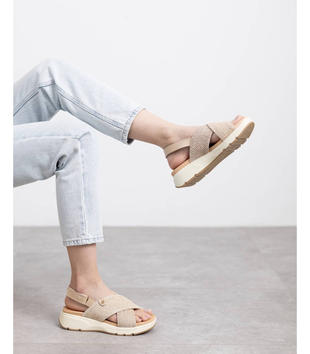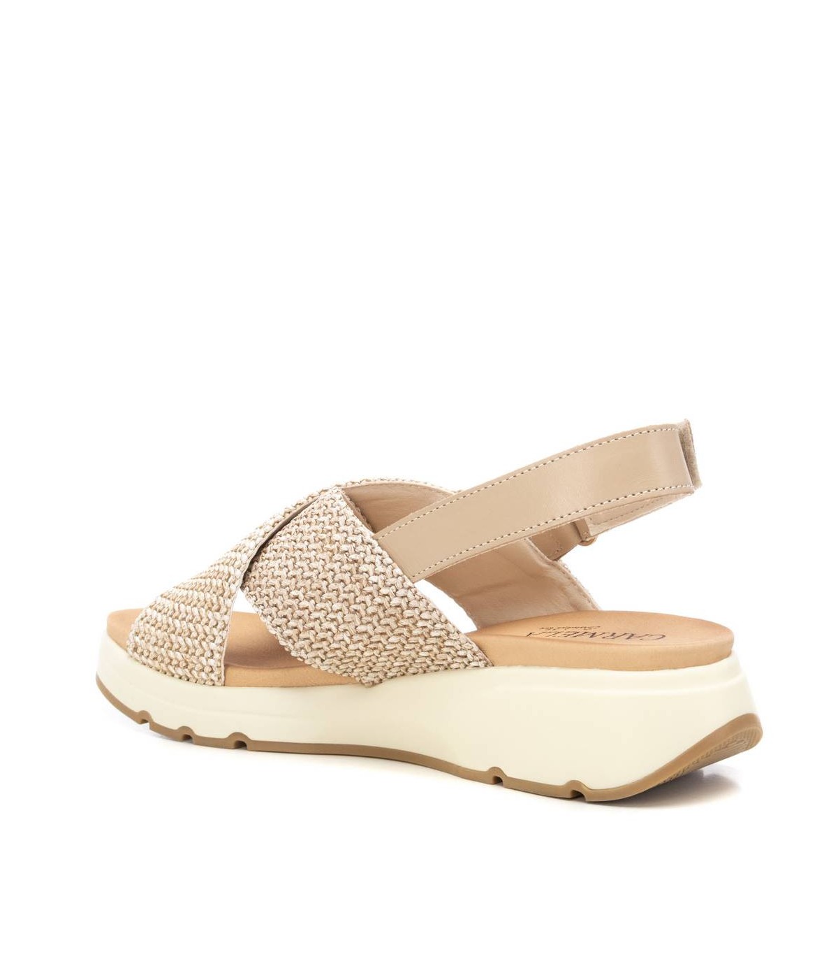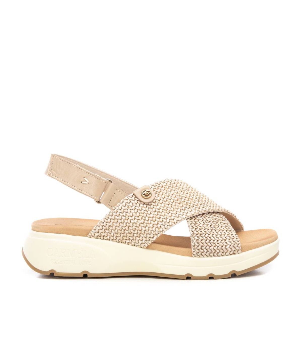 Sandalia de mujer, marca Carmela. Fabricada en rafia de alta calidad. Modelo con pala cruzada, un básico cómodo y elegante para esta temporada. Cierre mediante hebilla metálica. Cómoda planta y suela de goma antideslizante.