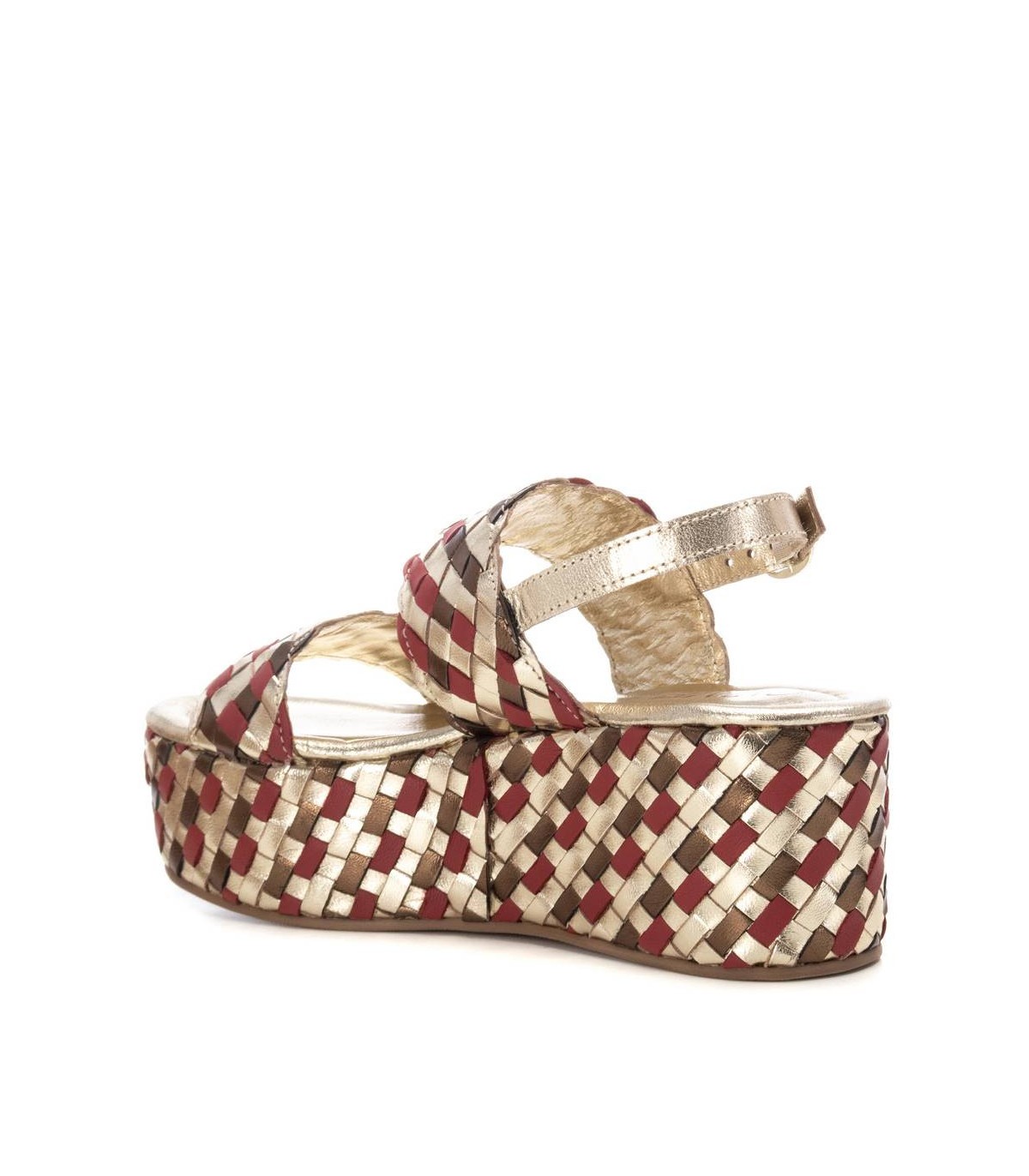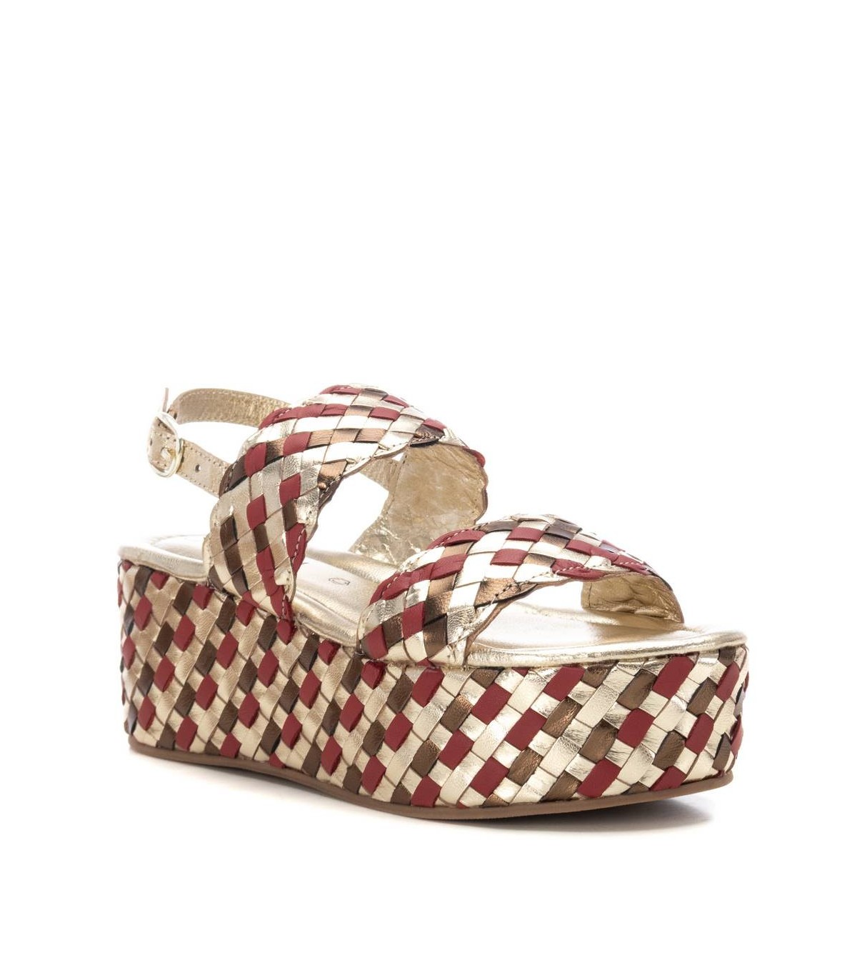 Sandalia de mujer, marca Carmela. Fabricada en piel de alta calidad. Modelo de palas. Cierre al tobillo mediante hebilla metálica. Cuña de 6 cm con plataforma para mayor comodidad. Suela de goma antideslizante.