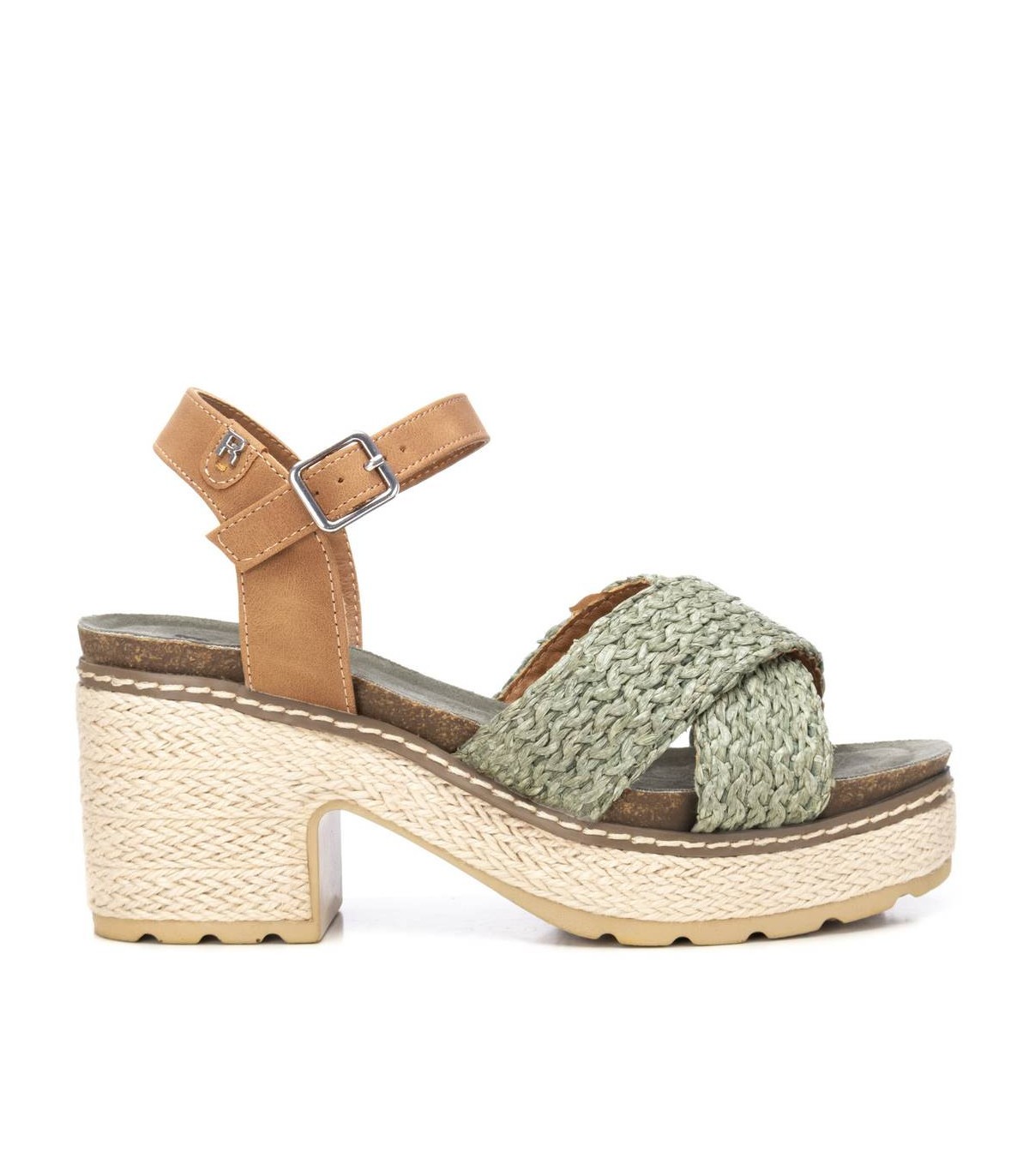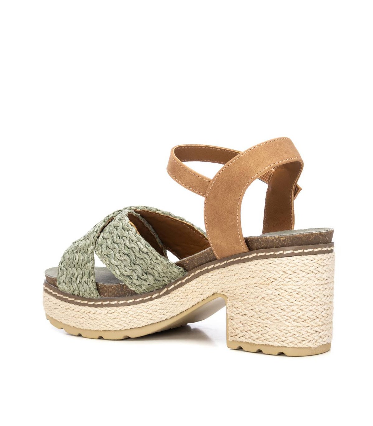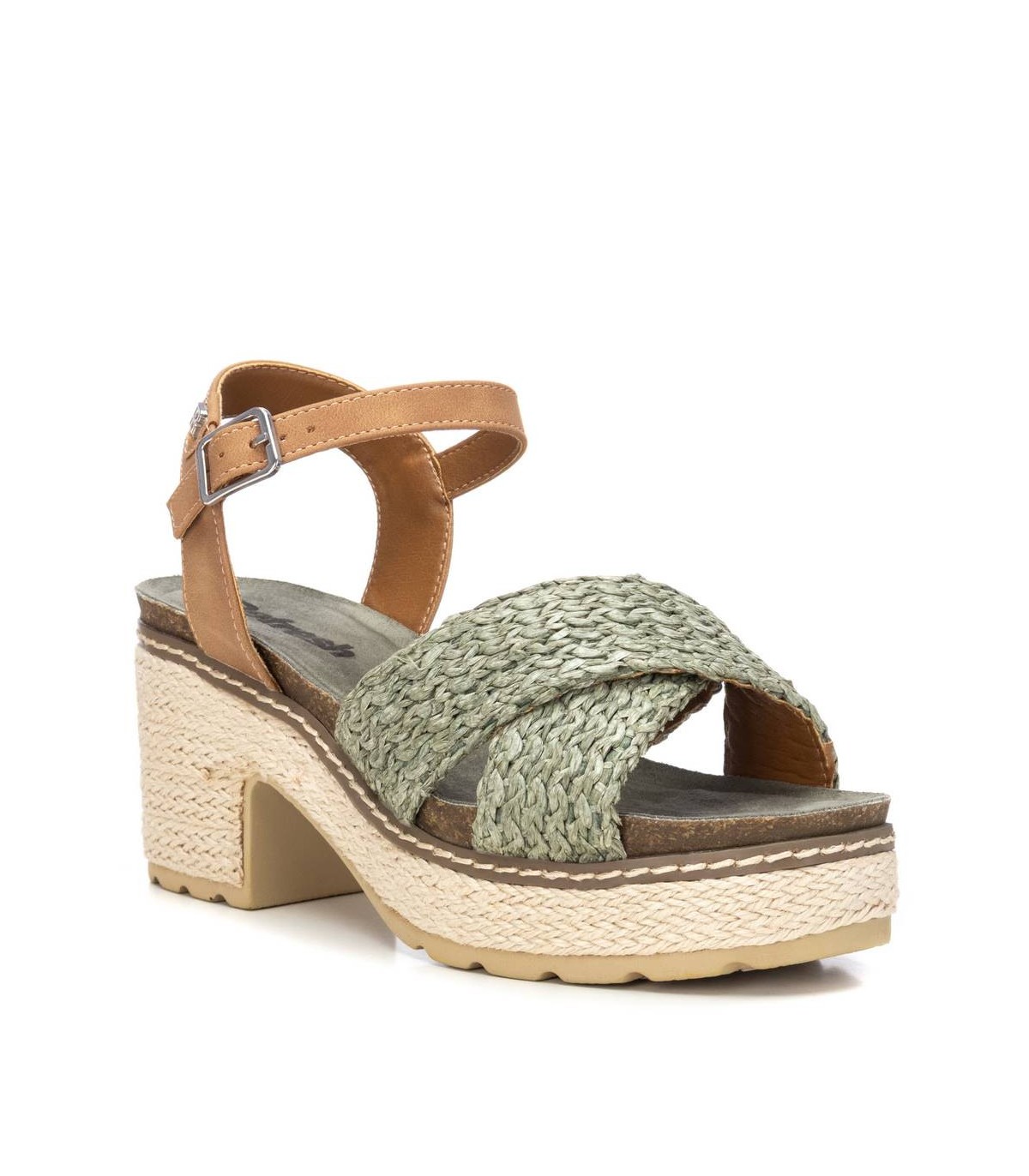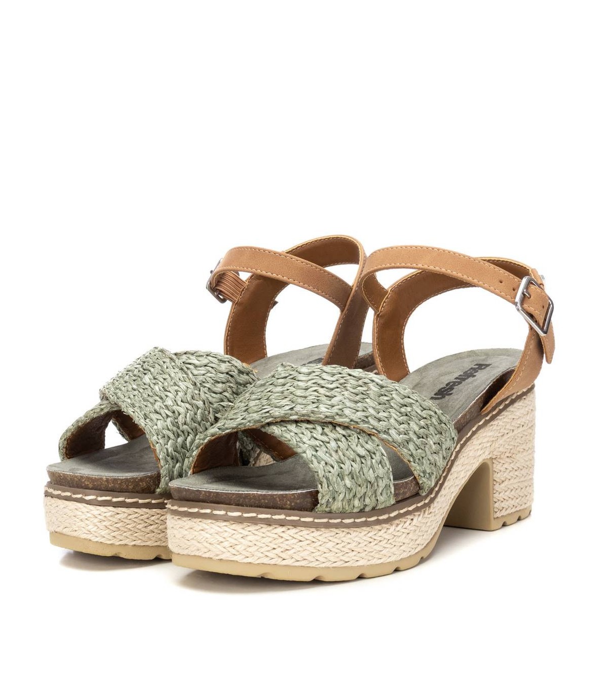 Sandalia de mujer, de la marca Refresh. Fabricada en rafia. Modelo de doble pala con pulsera al tobillo en material que imita a la piel. Planta tipo bios al tono. Cierre mediante hebilla. Tacón ancho de 8 cm con plataforma delantera para mayor comodidad, forrado en tiras de yute. Suela dentada antideslizante. Este modelo ha obtenido el certificado vegano por la organización mundial PETA (Organización de los derechos de los animales).
