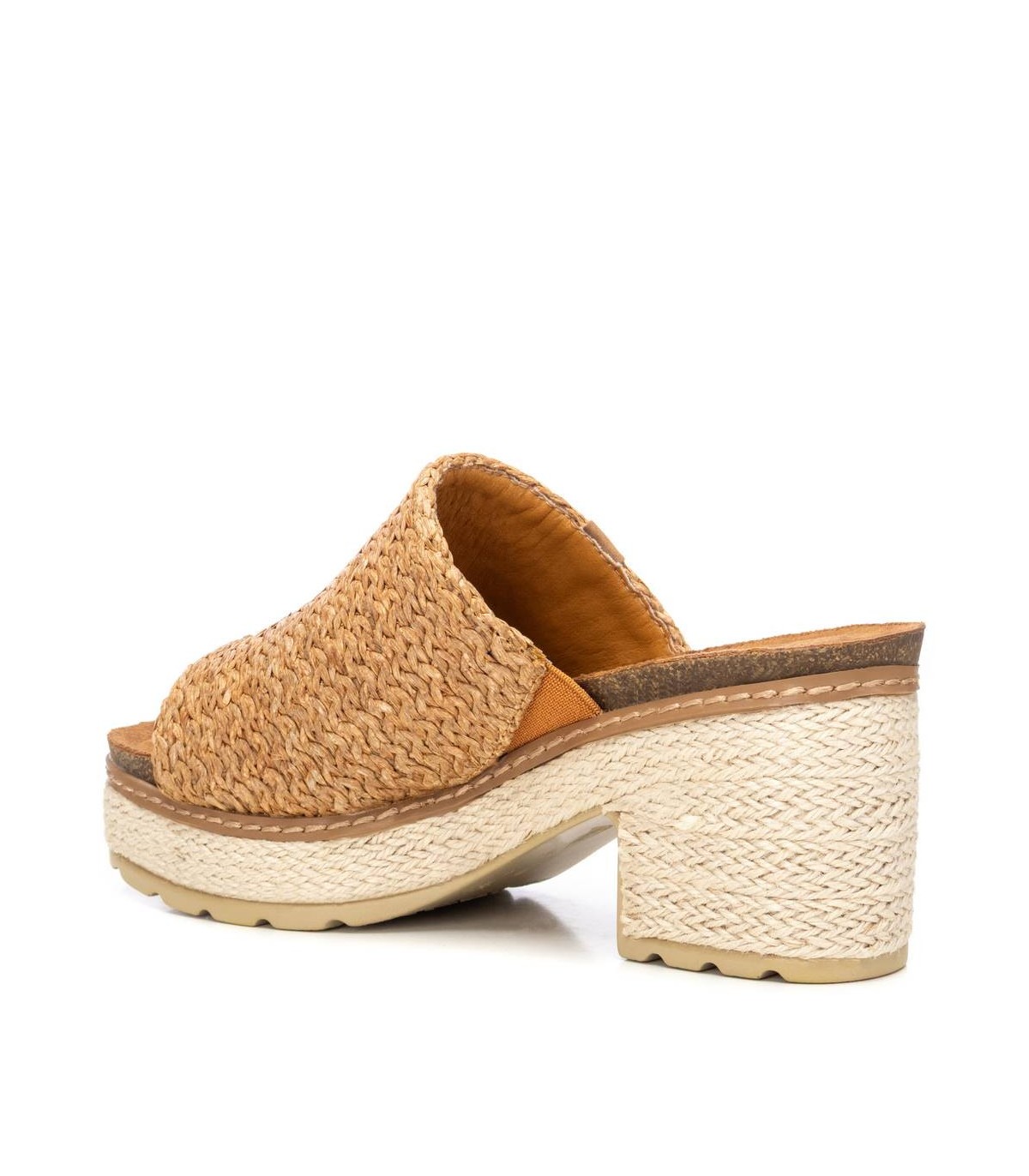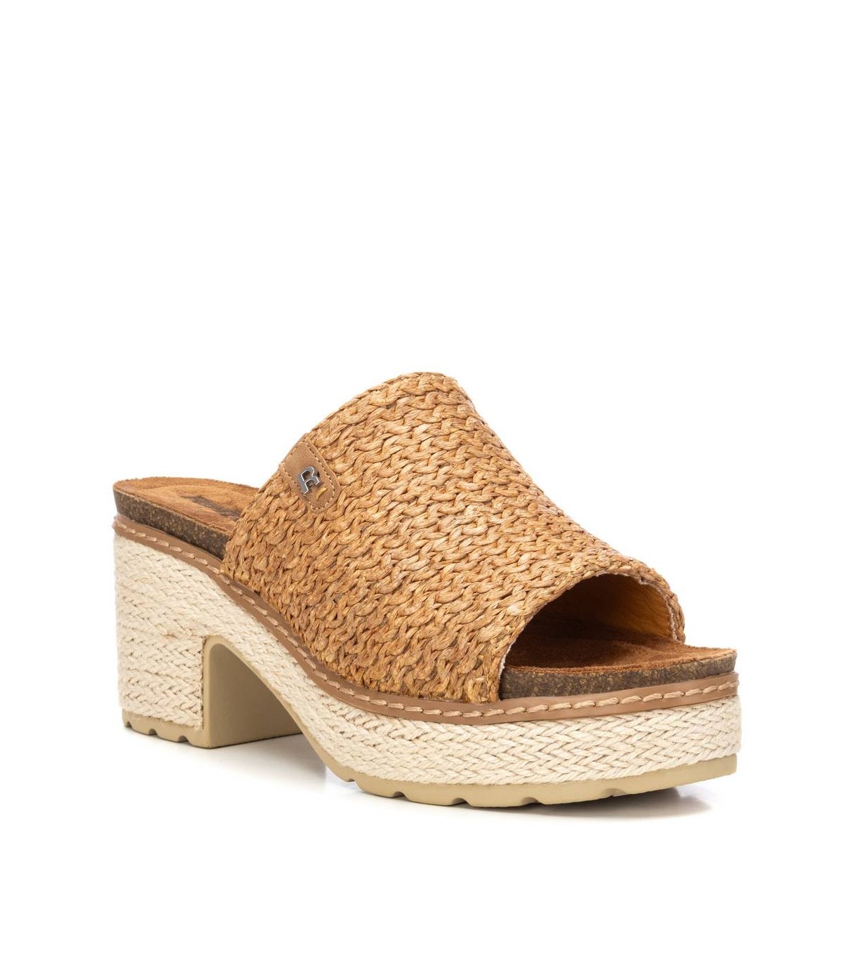 Sandalia de mujer, de la marca Refresh. Fabricada en rafia. Esta sandalia de pala ancha destalonada es un básico que no puede faltar esta temporada. Con planta tipo bios al tono. Tacón ancho de 8 cm con plataforma delantera para mayor comodidad, forrado en tiras de yute. Suela dentada antideslizante. Este modelo ha obtenido el certificado vegano por la organización mundial PETA (Organización de los derechos de los animales).