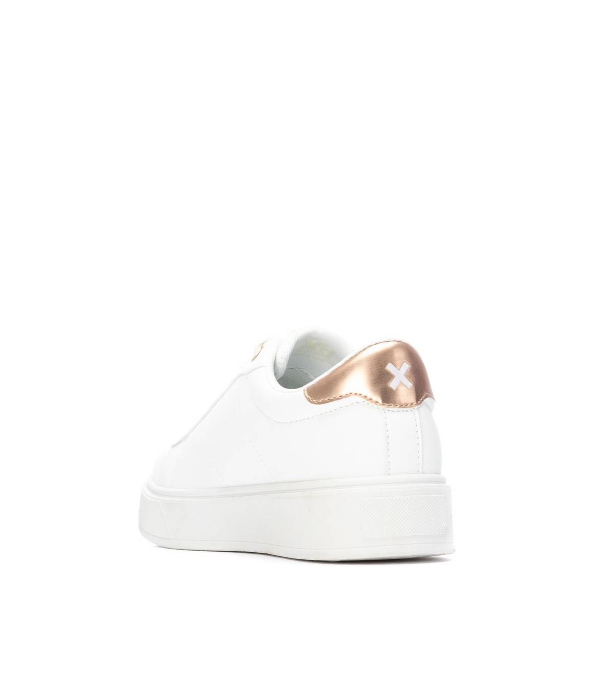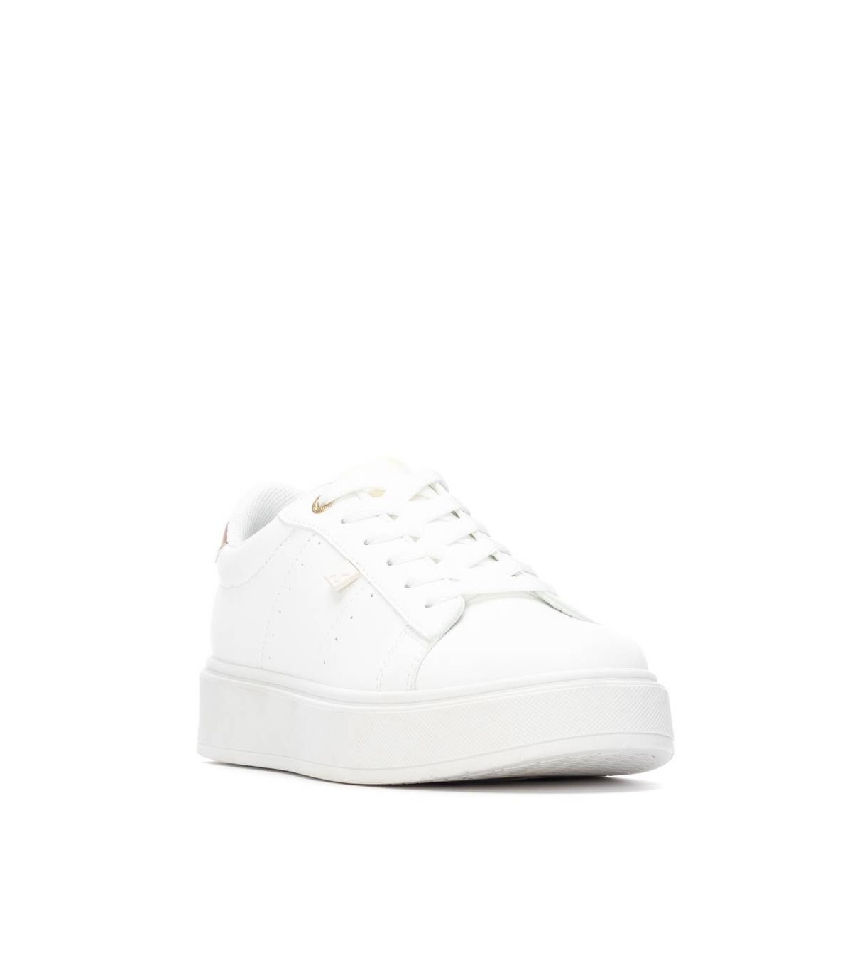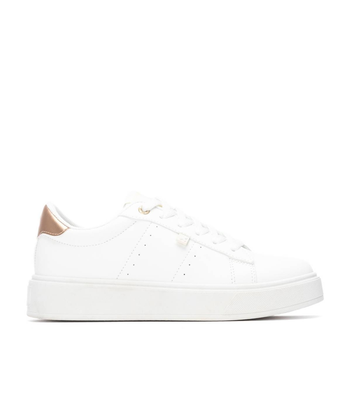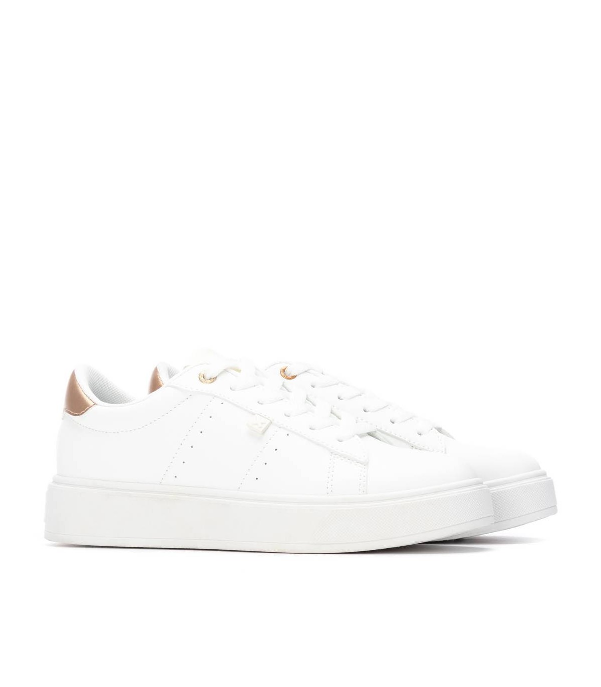 Zapatilla de mujer, de la marca Xti Basic. Fabricada en material que imita la piel, con un pequeño detalle de puntos en el lateral que aporta un toque moderno. Suela plana de 4 cm que brinda comodidad y estabilidad. Además, cuenta con un detalle metalizado en la talonera que añade un toque de elegancia. Con cordones para un ajuste personalizado y seguro. Con plantilla extraíble. Este modelo ha obtenido el certificado vegano por la organización mundial PETA (Organización de los derechos de los animales).