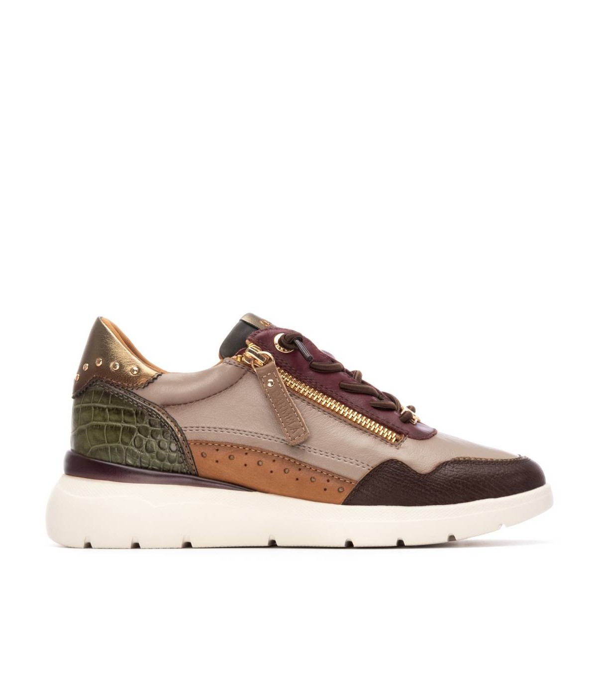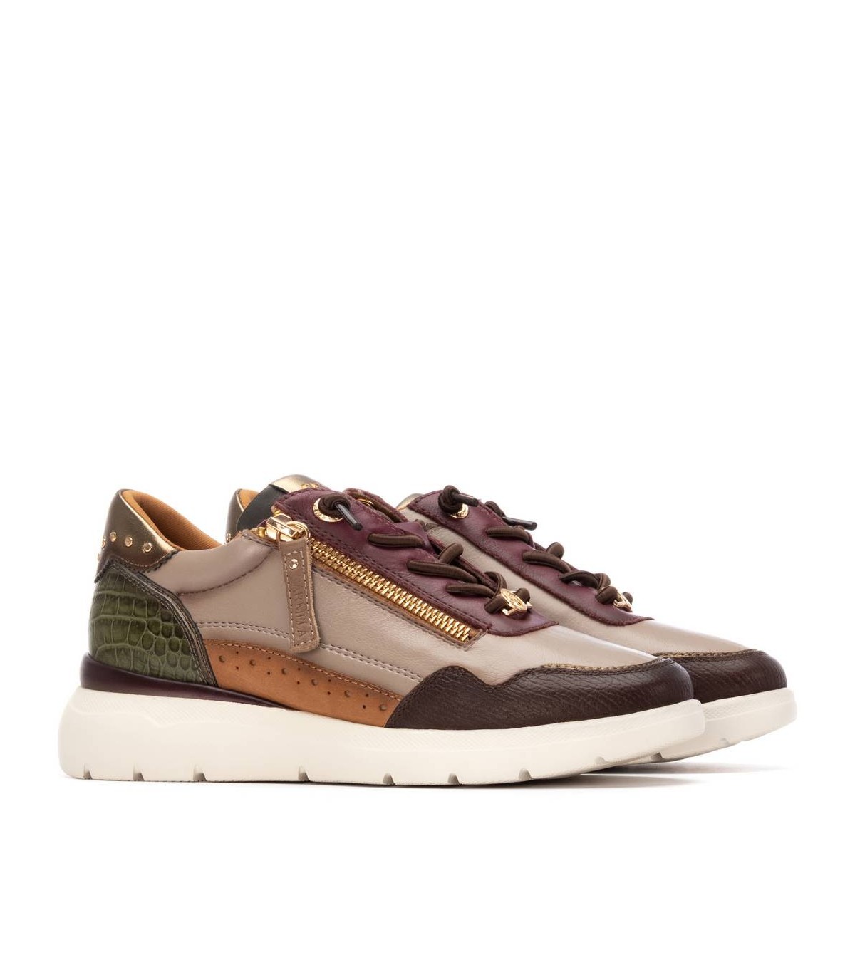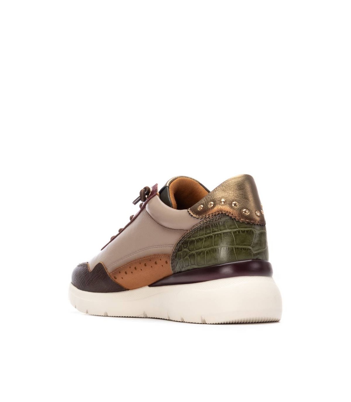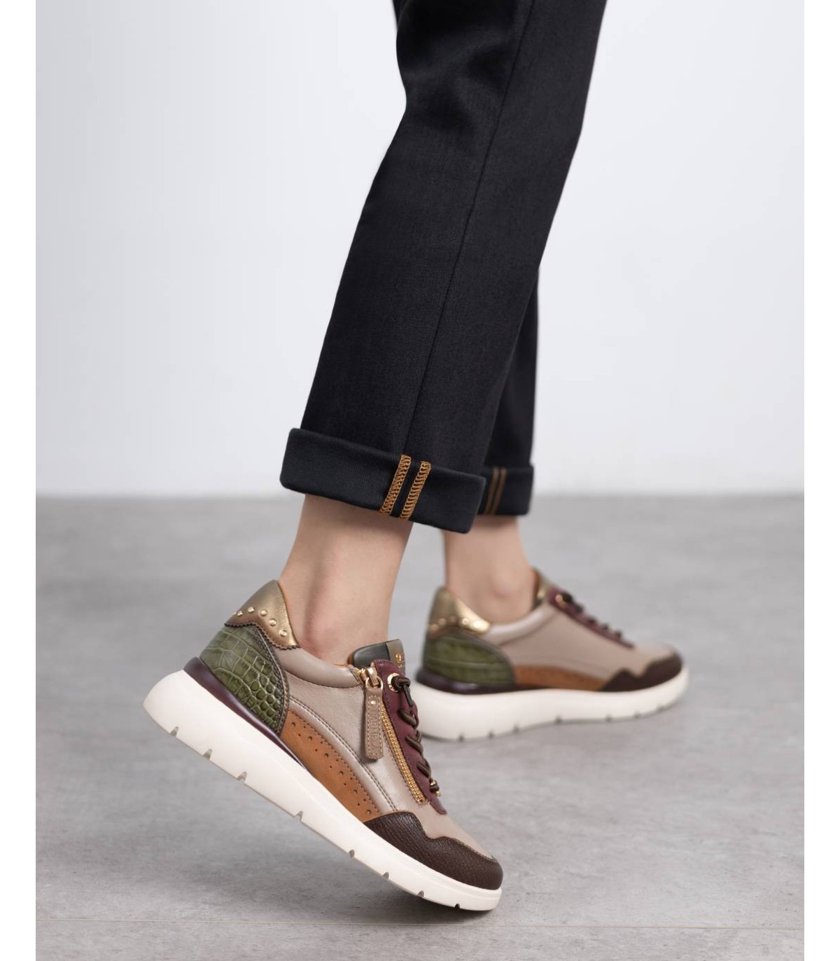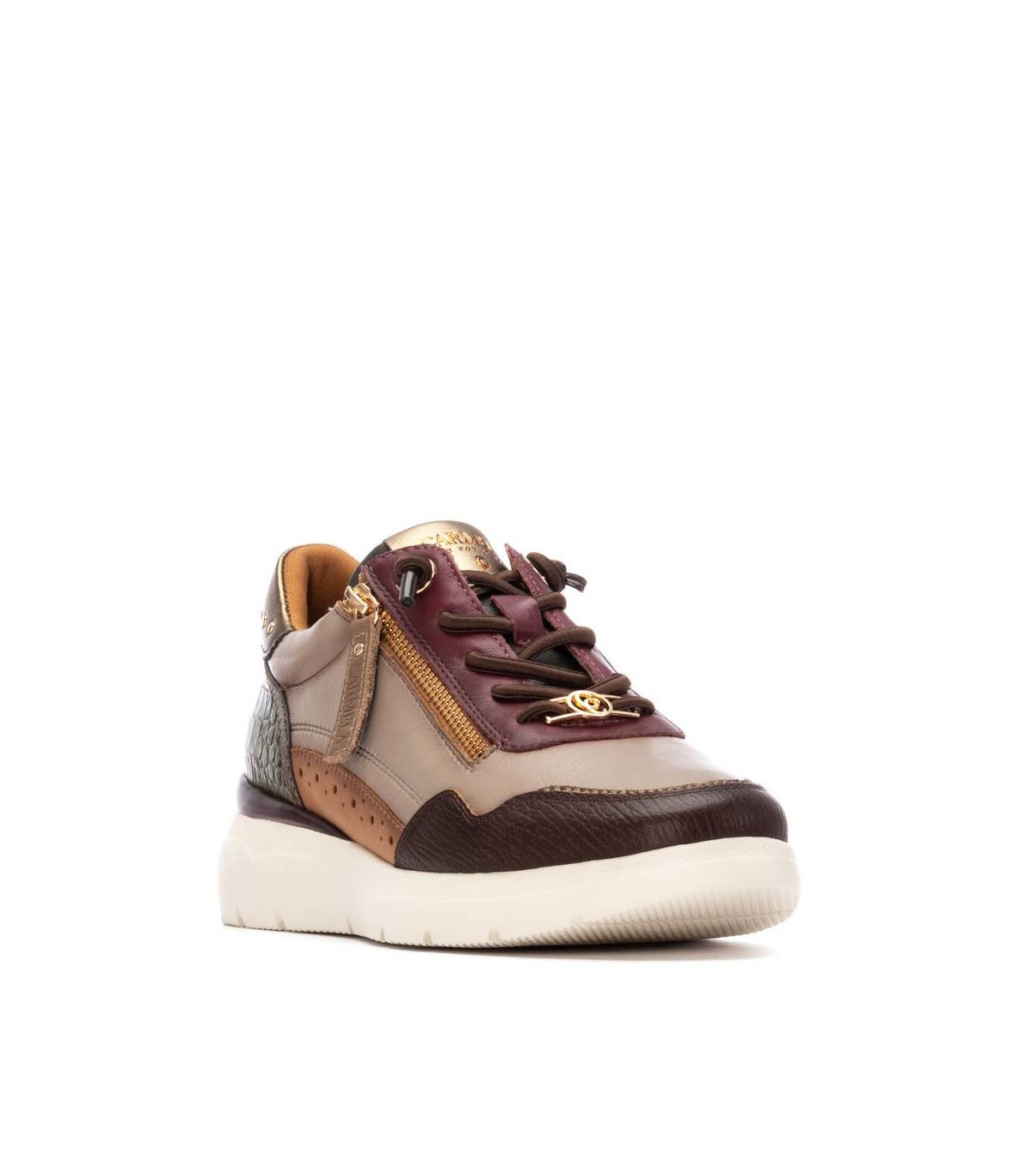 Zapatilla de mujer, de la marca Carmela. Fabricada en piel de alta calidad. Cierre mediante cremallera lateral y cordones ajustables. Detalle de piezas con efecto metalizado y tachuelas pequeñas. Suela de goma antideslizante. Con plantilla extraíble.