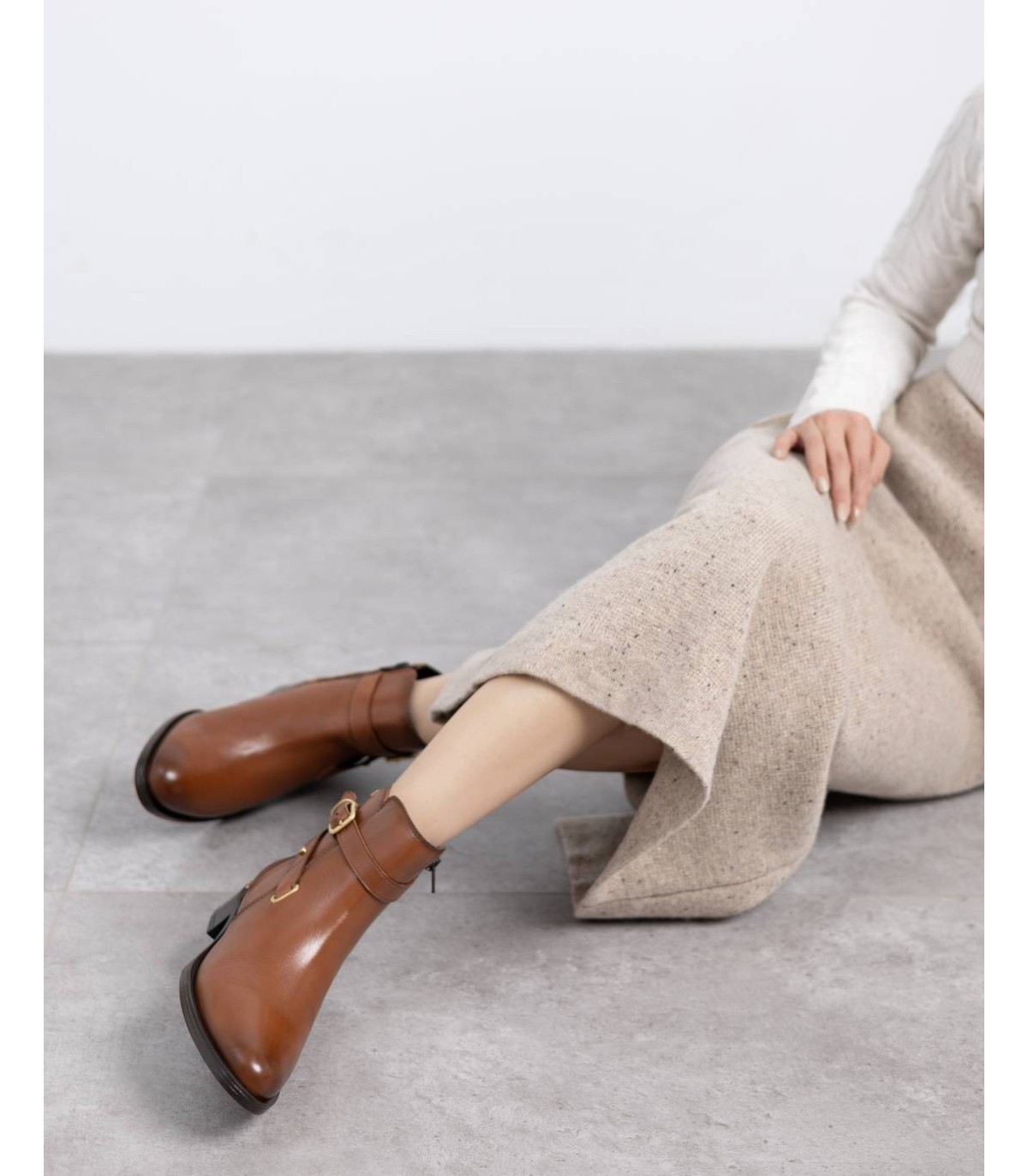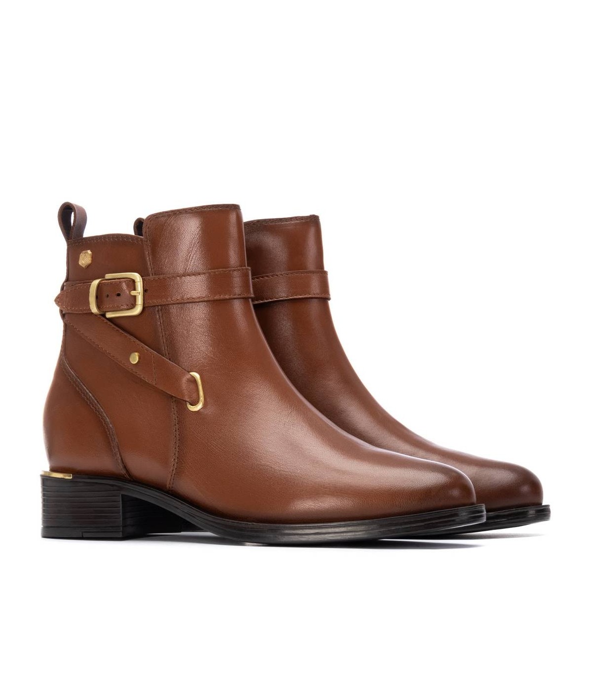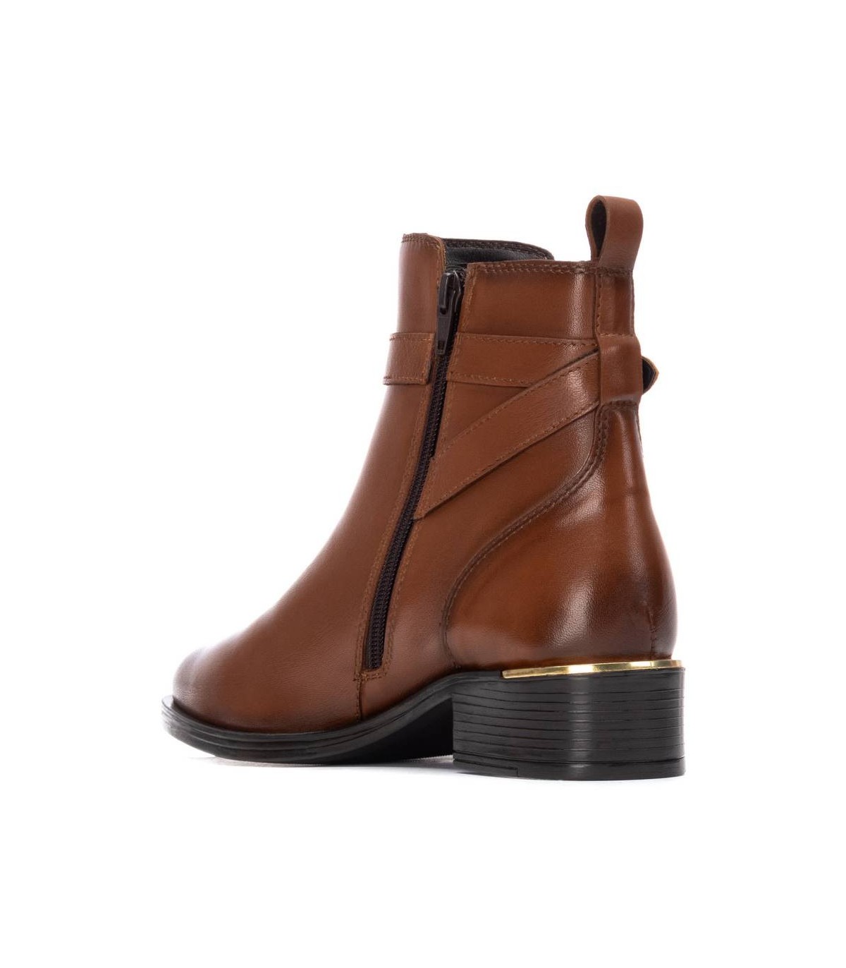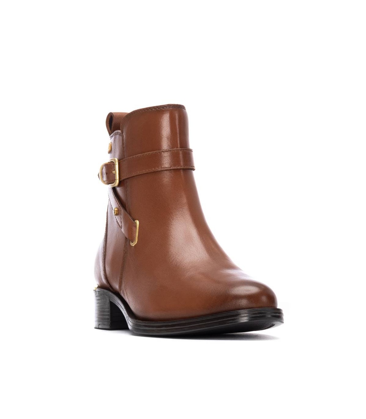 Botín de mujer, de la marca Carmela. Fabricado en piel de alta calidad. Cierre mediante cremallera interna. Tirador trasero para facilitar la puesta. Detalle lateral con hebilla. Suela antideslizante, con detalle metalizado.