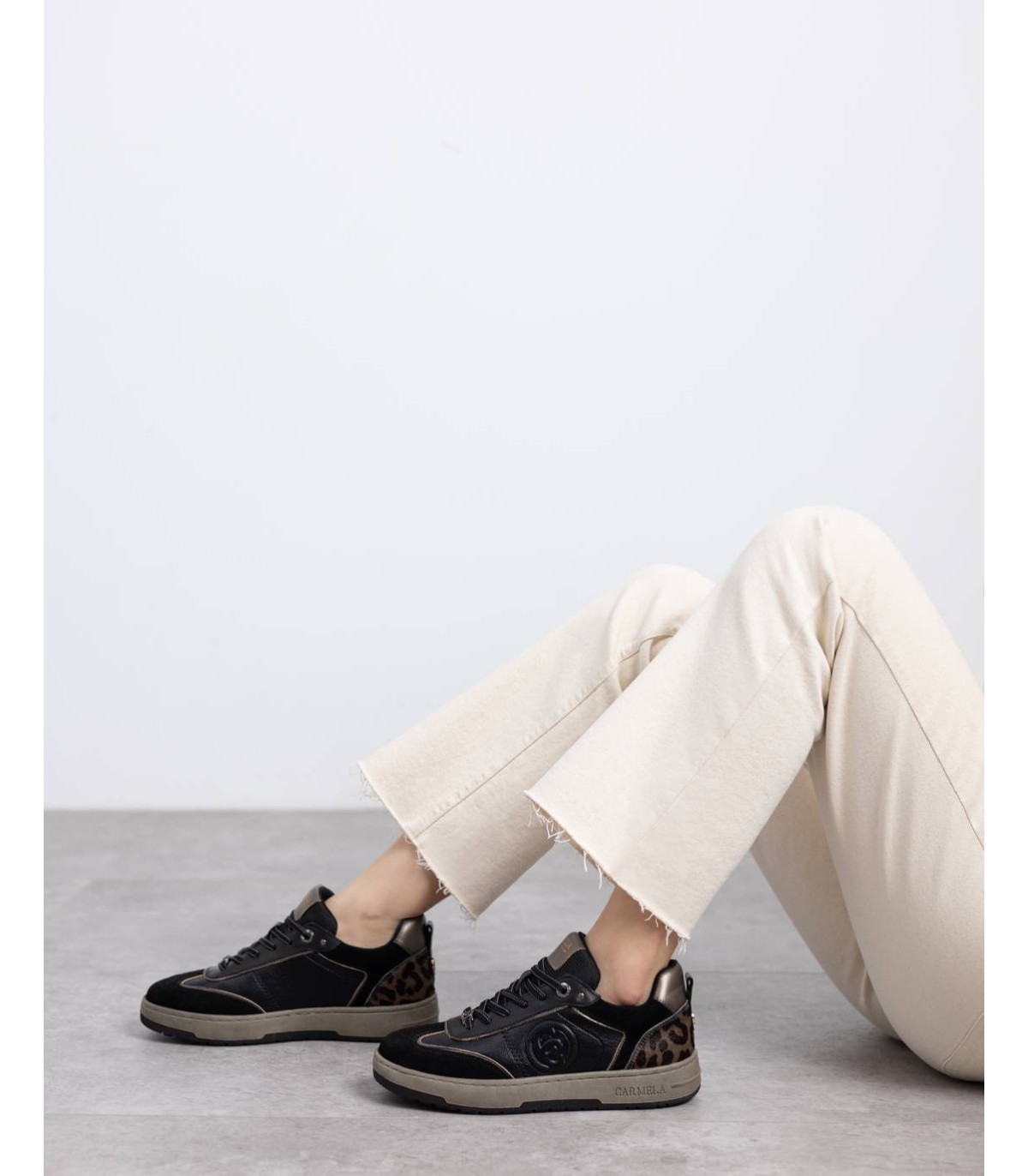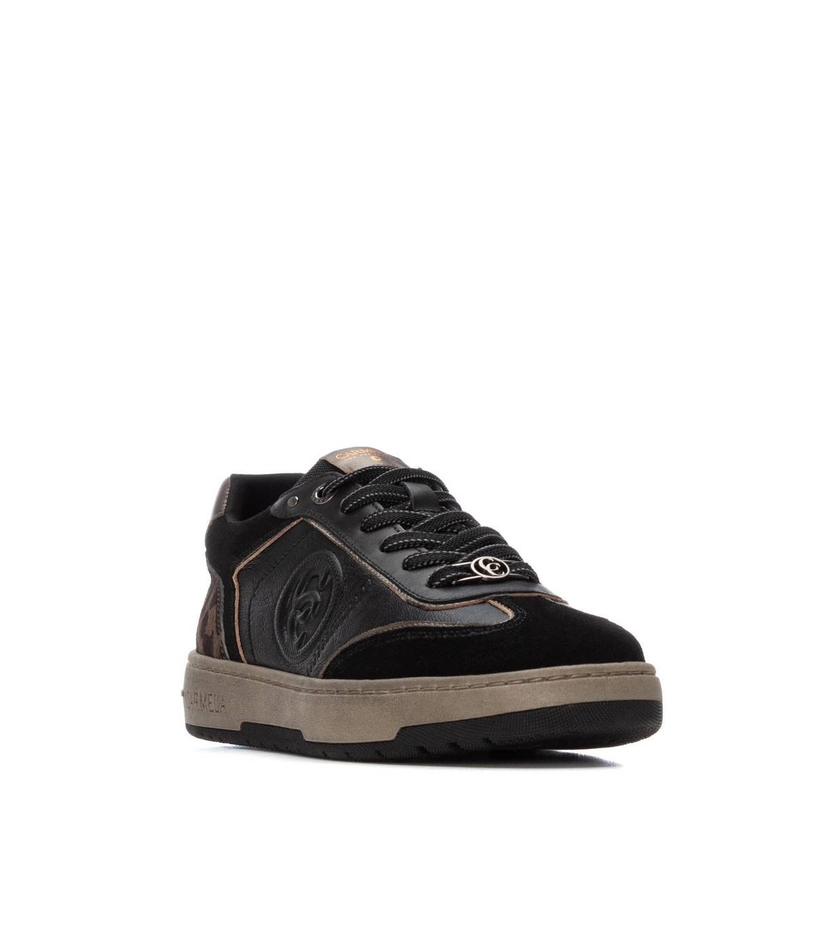 Zapatilla de mujer, de la marca Carmela. Fabricada en un suave serraje. Cierre mediante cordones ajustables. Detalles dorados y con estampado. Tirador trasero para facilitar la puesta. Suela de goma antideslizante.