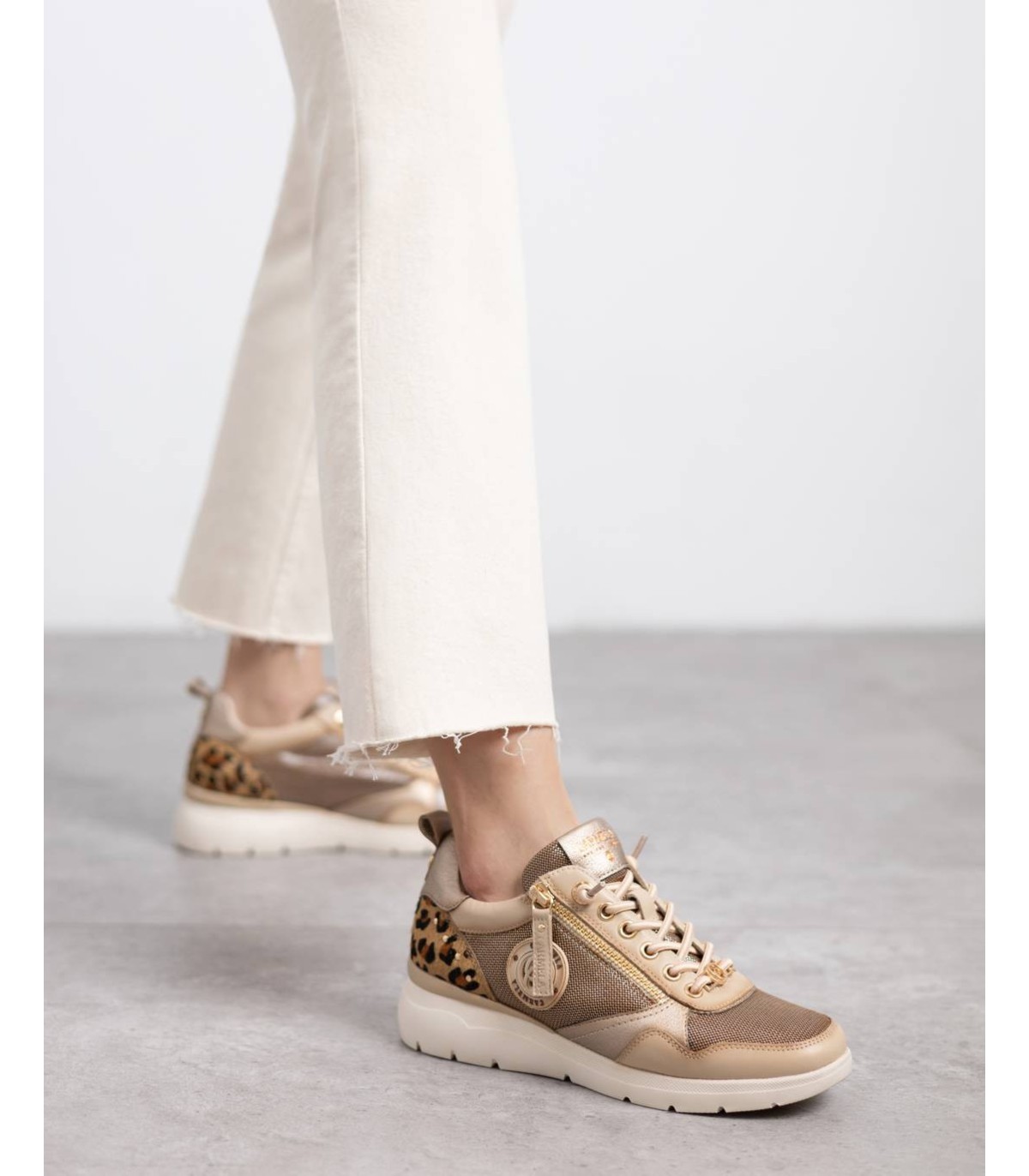 Zapatilla de mujer, de la marca Carmela. Fabricada en piel de alta calidad. Con cierre mediante cremallera lateral y cordones ajustables. Detalles de piezas metalizadas y con estampado. Tirador trasero para facilitar la puesta. Suela goma antideslizante. Plantilla extraíble.