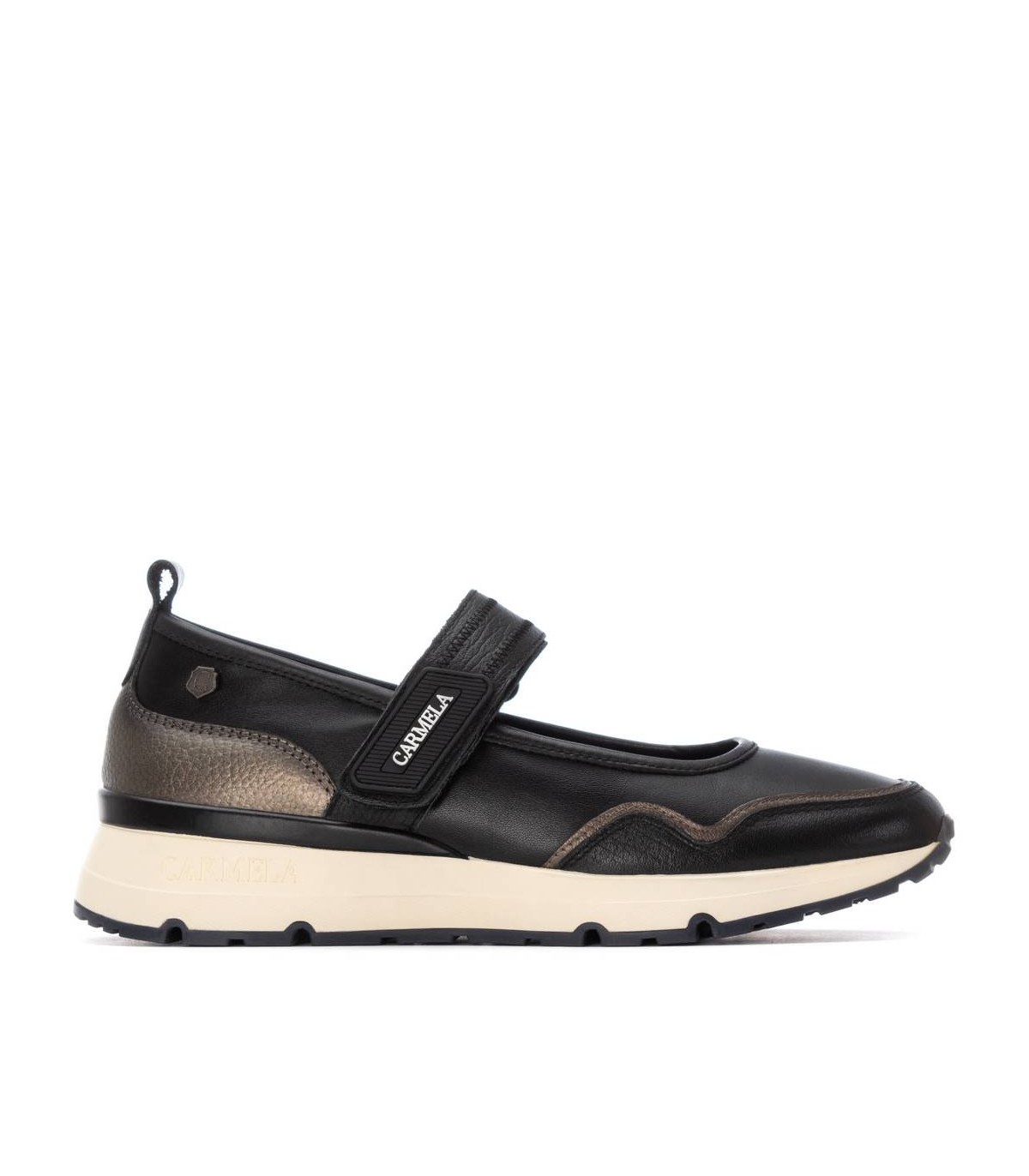 Zapato de mujer, de la marca Carmela. Fabricada en piel de alta calidad combinada con efecto metalizado. Estilo bailarina con sujeción mediante tira adhesiva para una mayor sujeción. Con tirador trasero para facilitar la puesta, suela estilo deportivo, antideslizante. Plantilla extraíble.