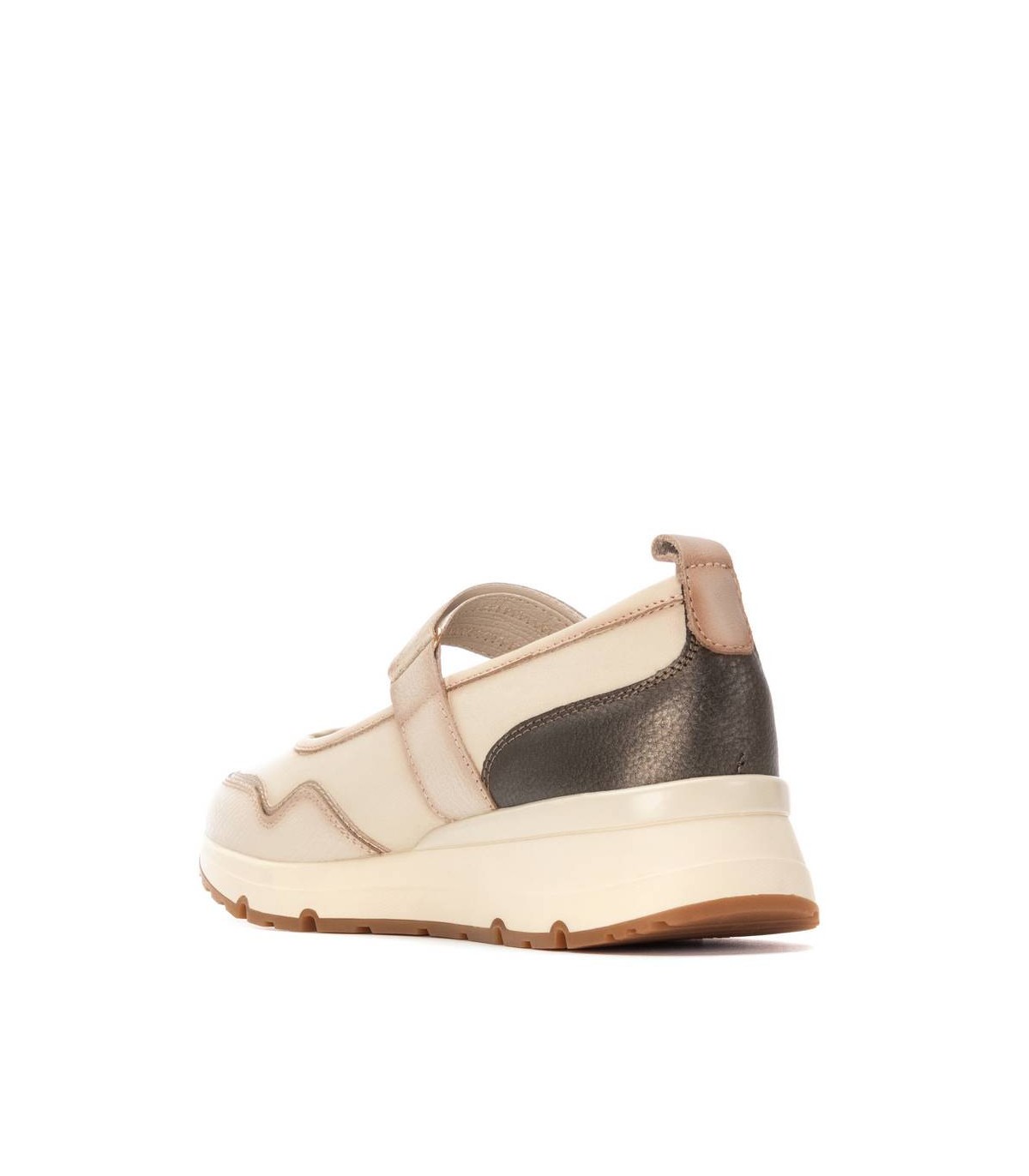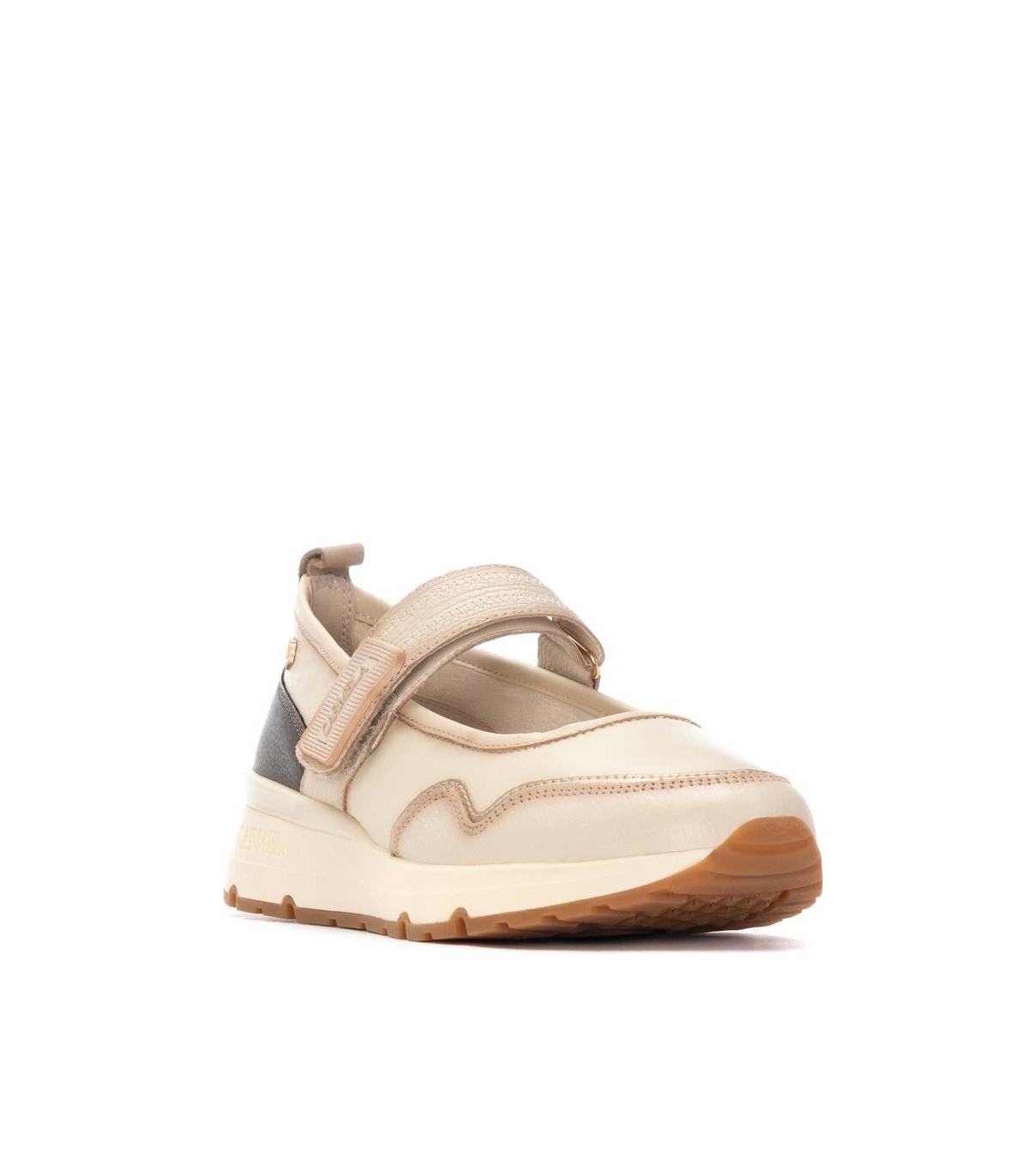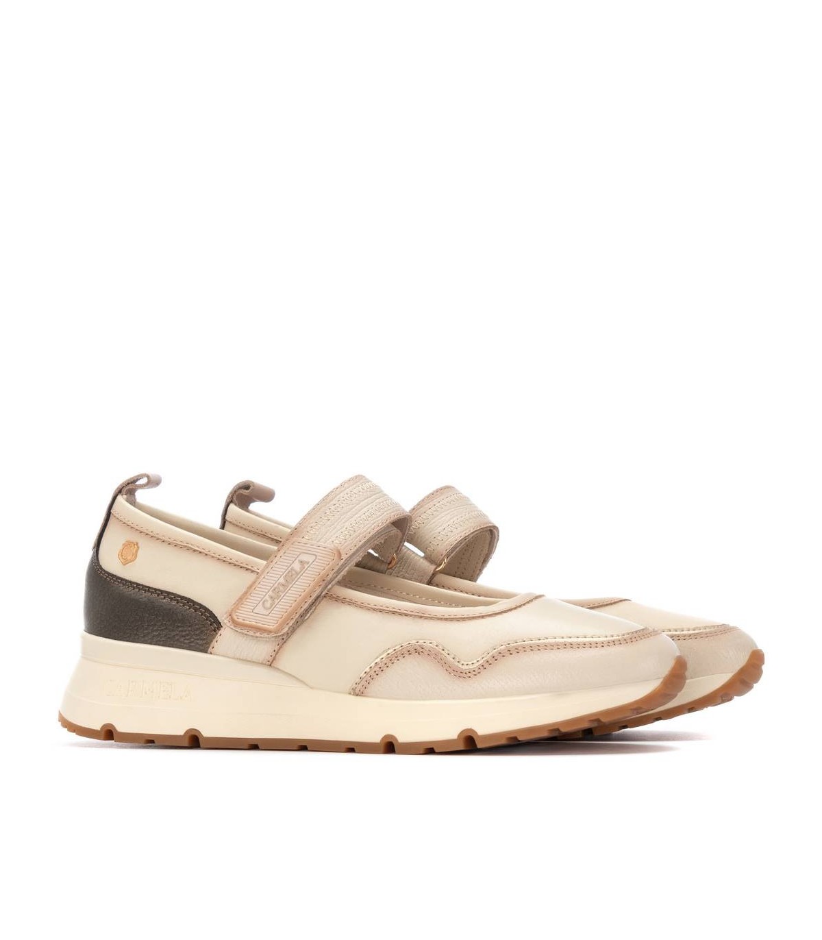 Zapato de mujer, de la marca Carmela. Fabricada en piel de alta calidad combinada con efecto metalizado. Estilo bailarina con sujeción mediante tira adhesiva para una mayor sujeción. Con tirador trasero para facilitar la puesta, suela estilo deportivo, antideslizante. Plantilla extraíble.