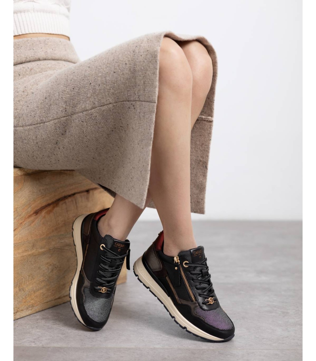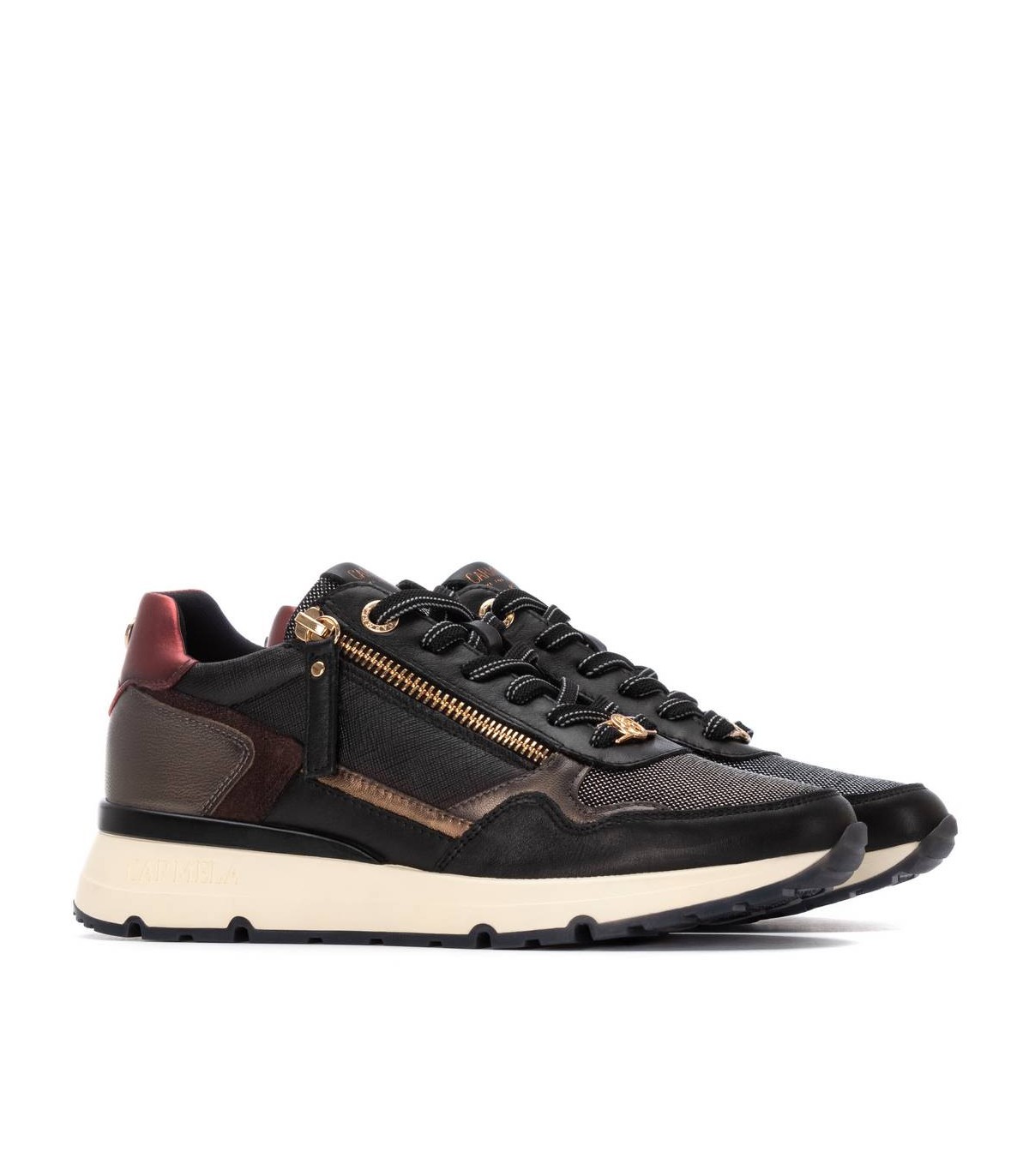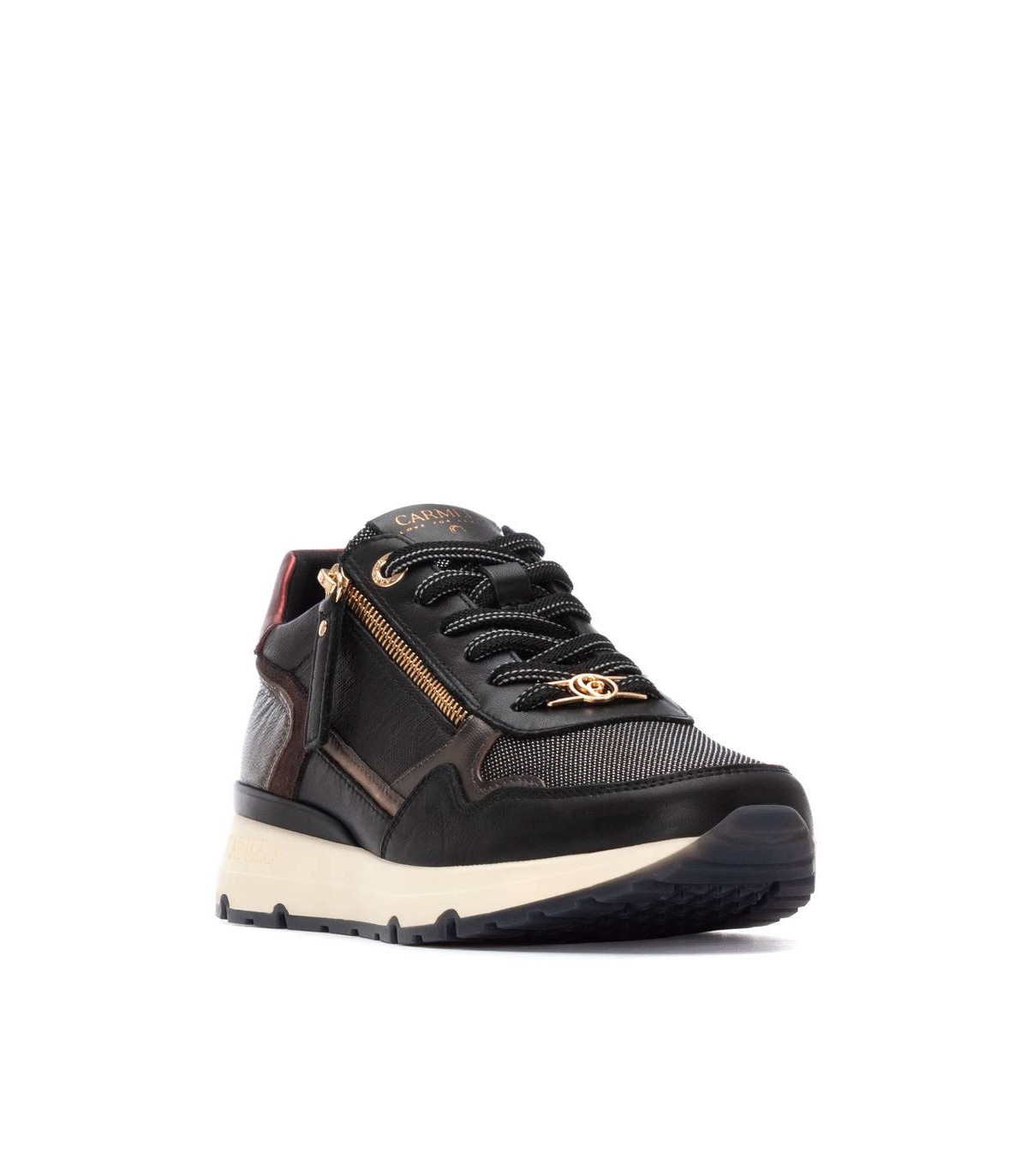 Zapatilla de mujer, de la marca Carmela. Fabricada en piel de alta calidad. Cierre mediante cremallera lateral y cordones ajustables. Detalles con efecto metalizado. Sencilla y elegante, un básico para tu armario. Suela de goma, antideslizante. Con plantilla extraíble.