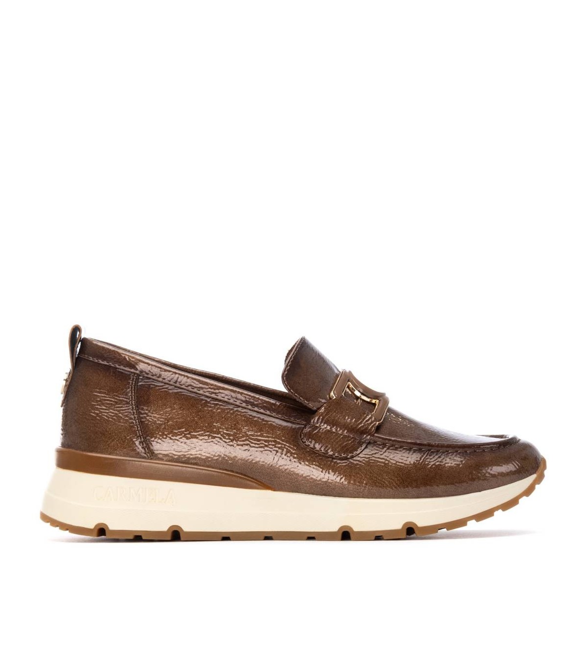 Zapato de mujer, de la marca Carmela. Fabricado en charol. Estilo bailarina con cierre delantero en el antifaz. Tirador trasero para facilitar su puesta. Suela de goma antideslizante . Con plantilla extraíble.