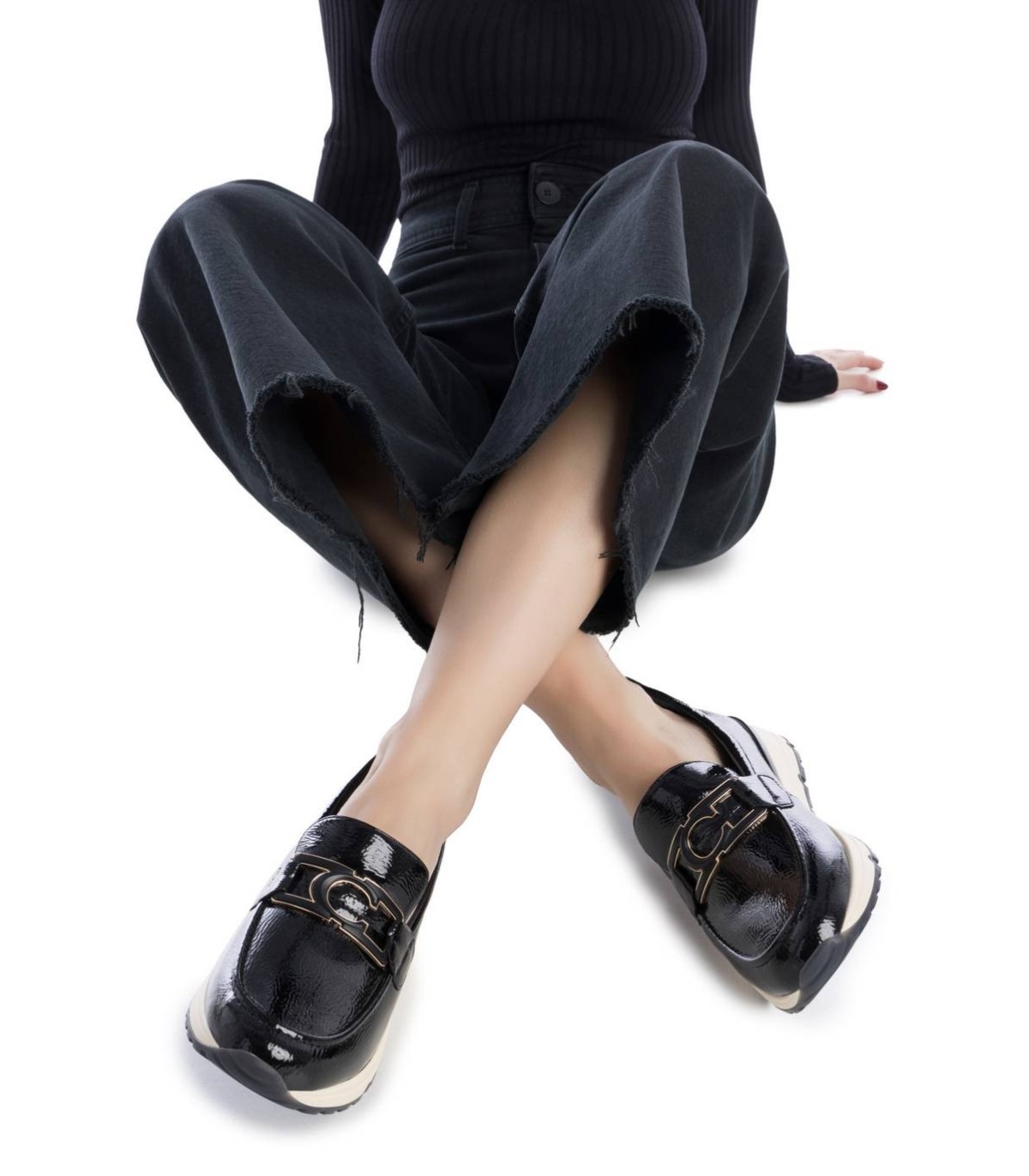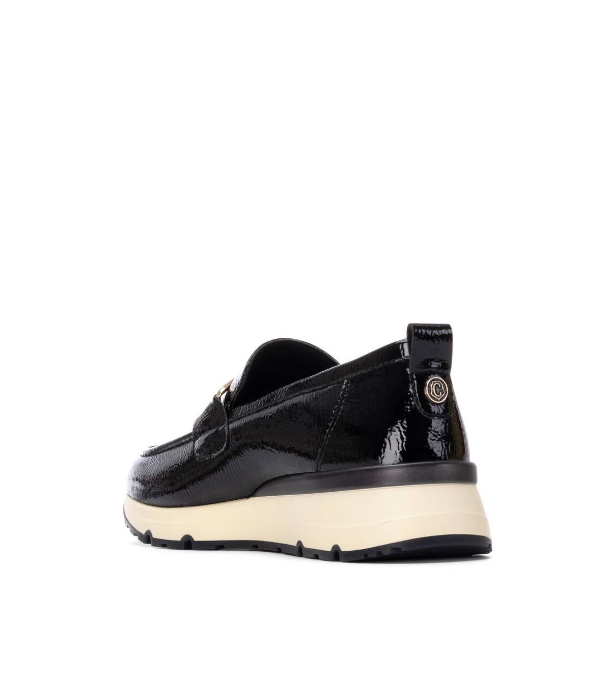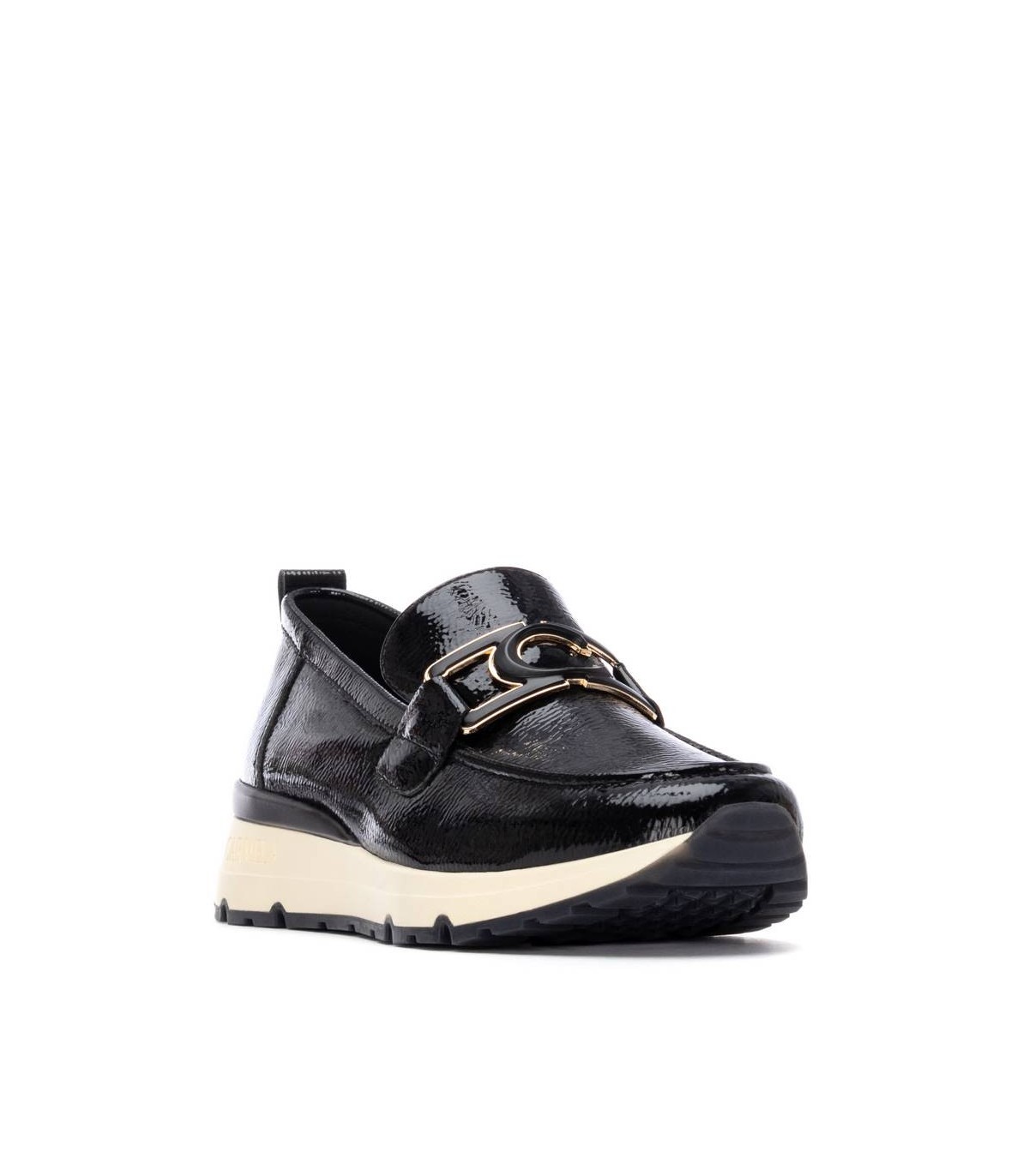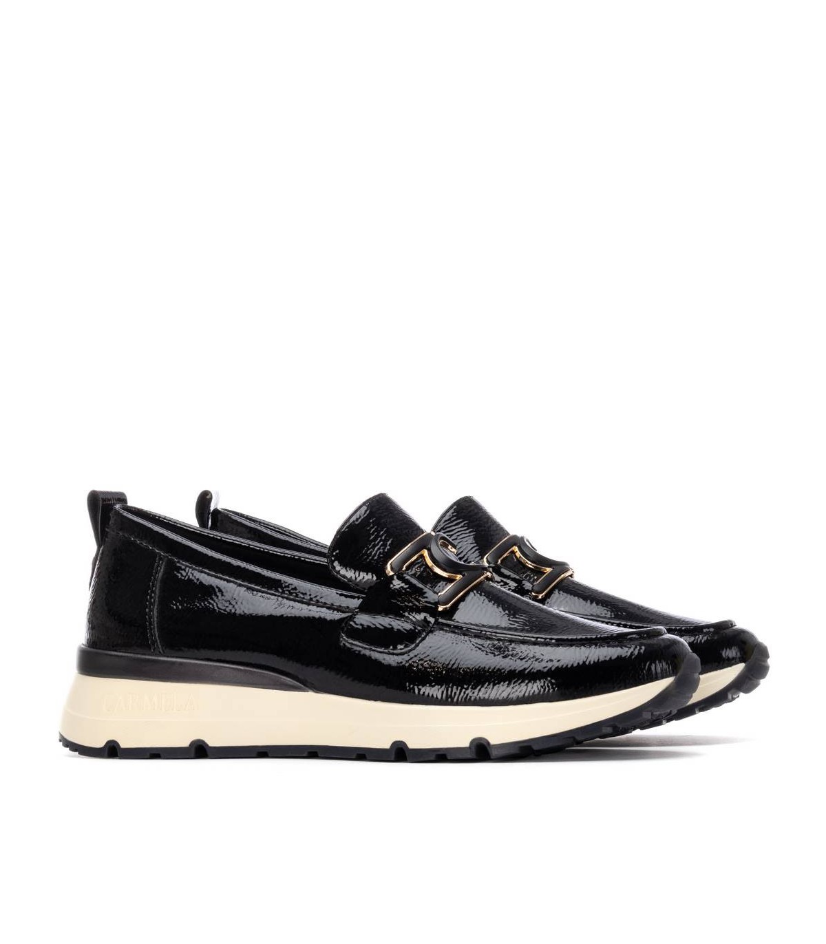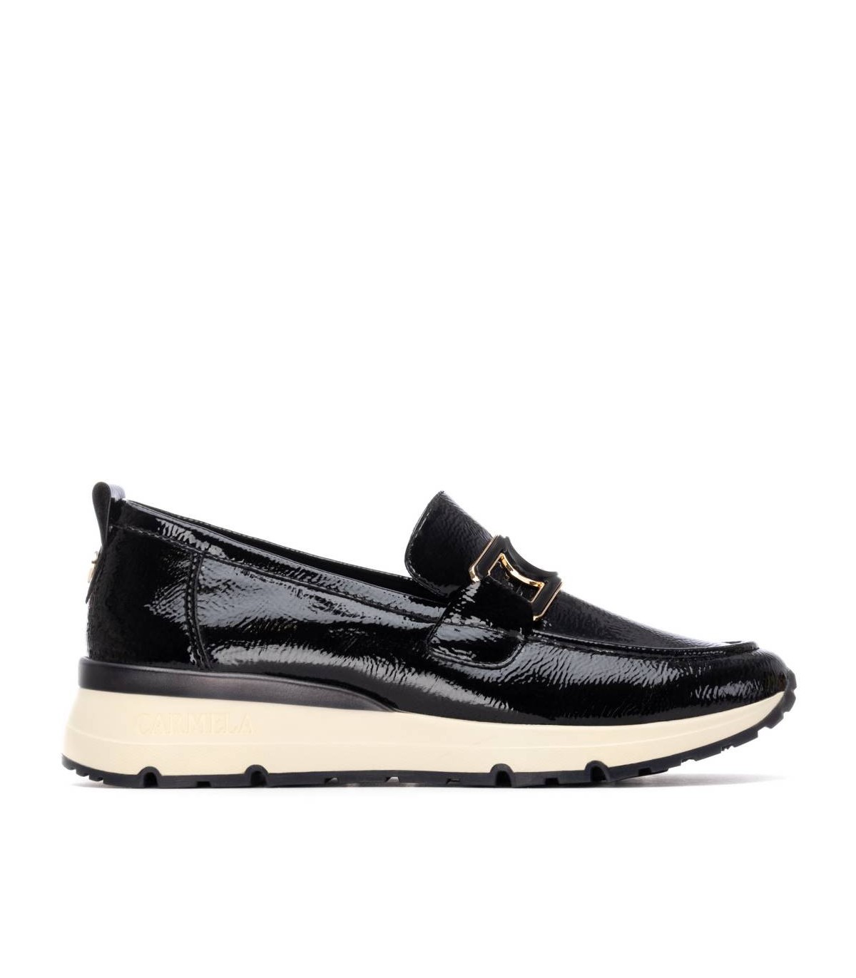 Zapato de mujer, de la marca Carmela. Fabricado en charol. Estilo bailarina con cierre delantero en el antifaz. Tirador trasero para facilitar su puesta. Suela de goma antideslizante . Con plantilla extraíble.