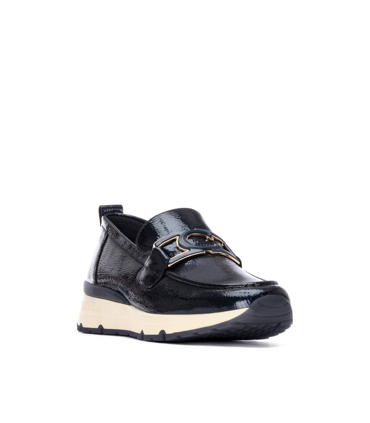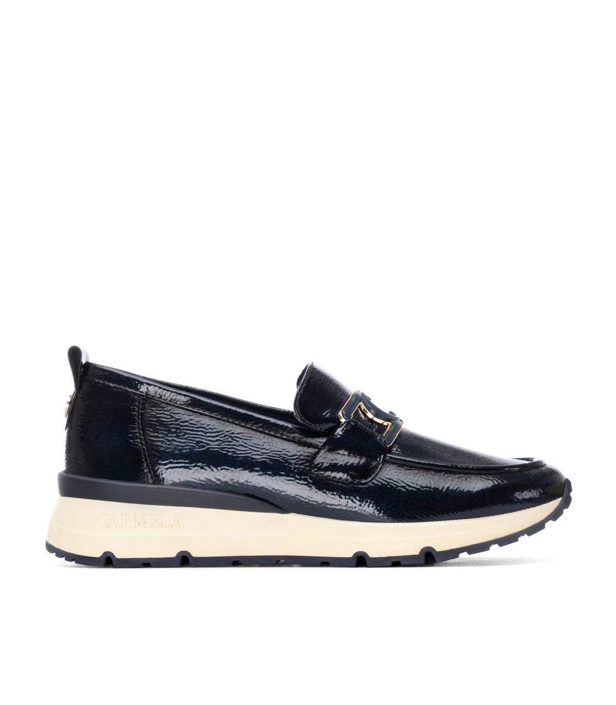 Zapato de mujer, de la marca Carmela. Fabricado en charol. Estilo bailarina con cierre delantero en el antifaz. Tirador trasero para facilitar su puesta. Suela de goma antideslizante . Con plantilla extraíble.