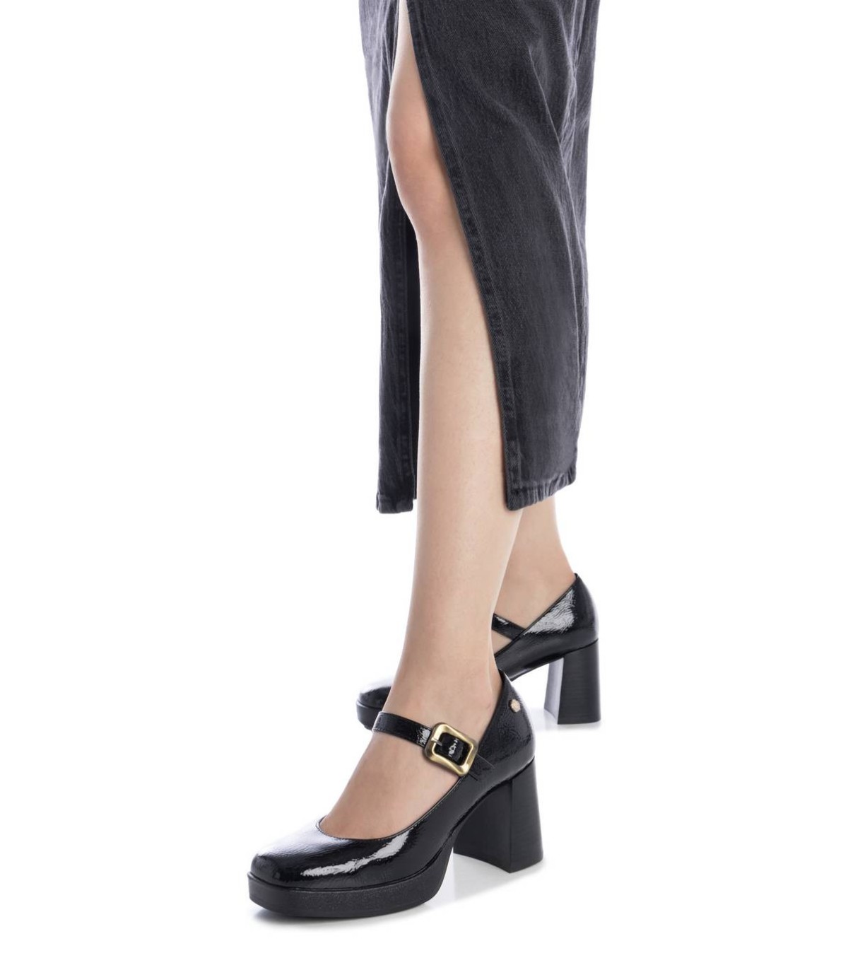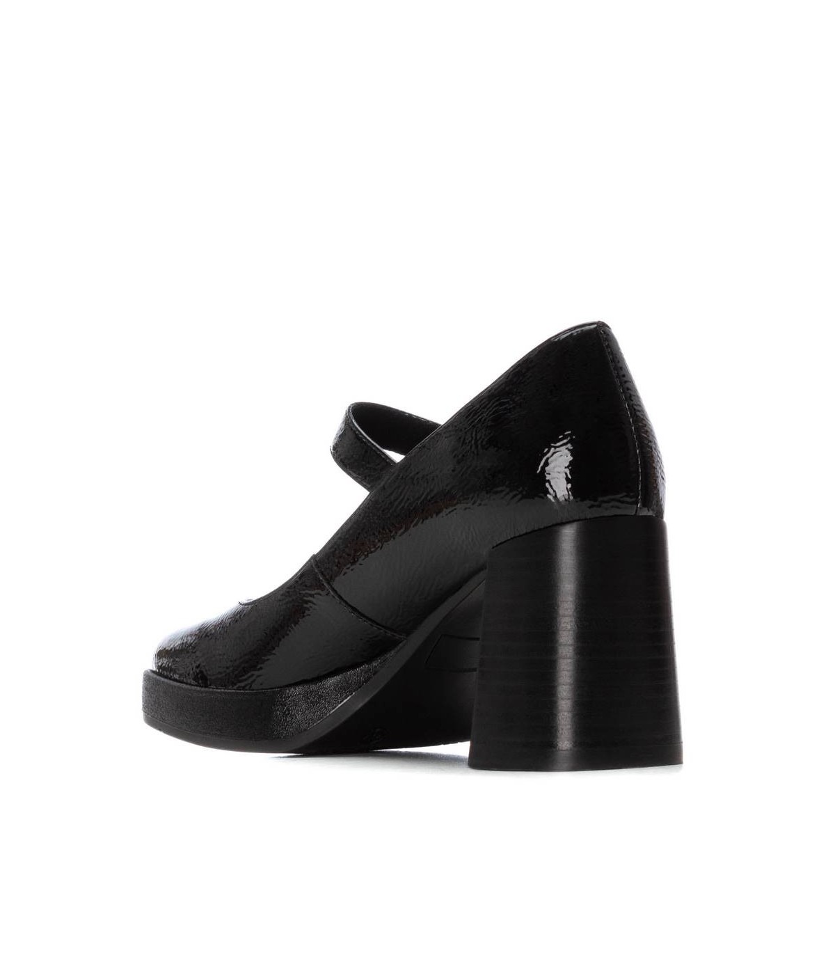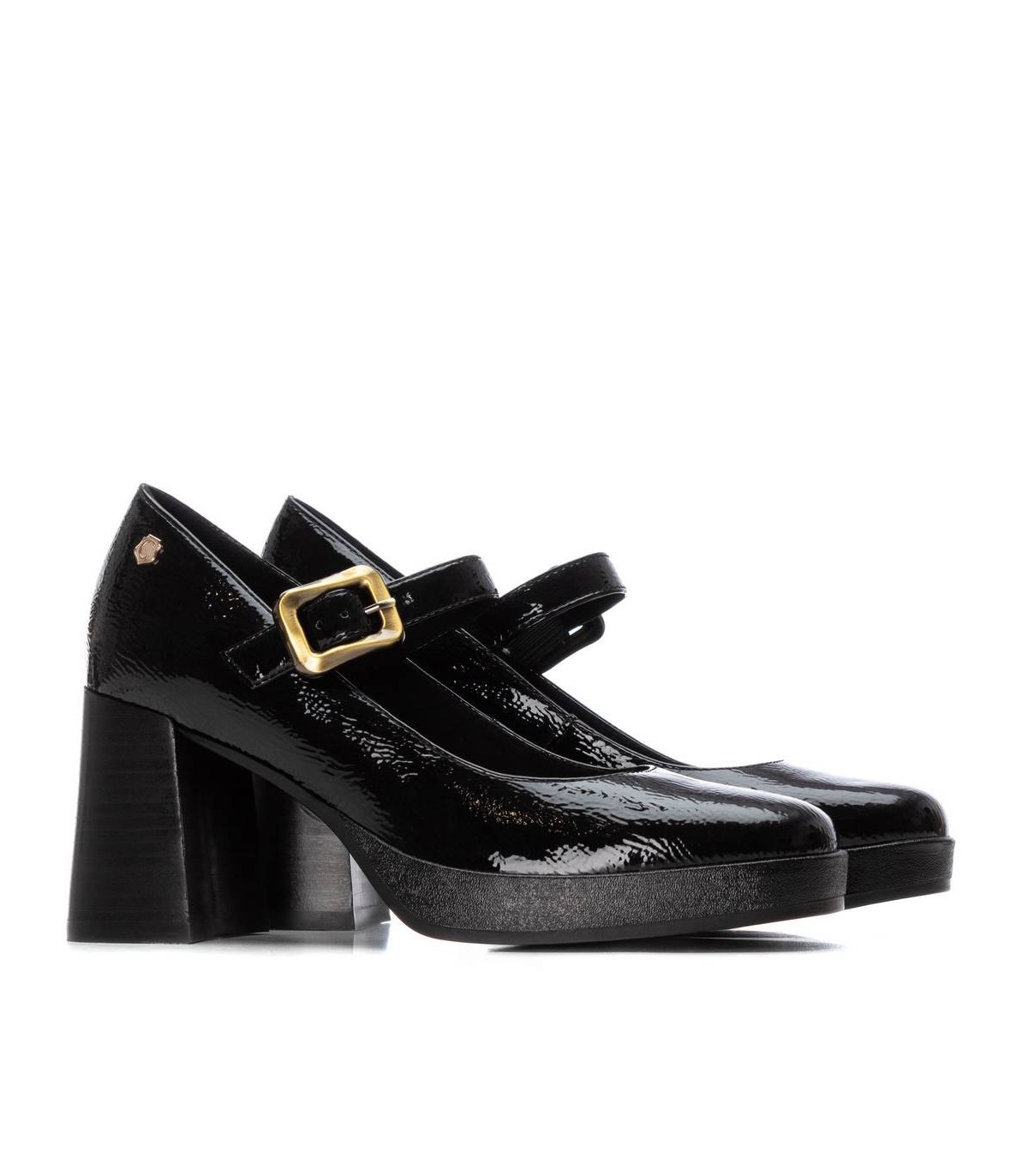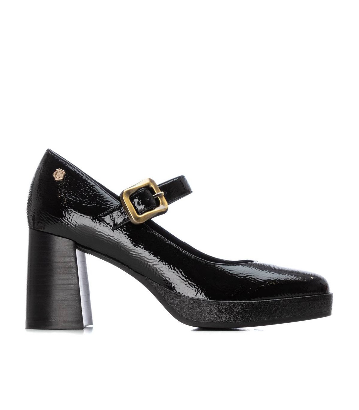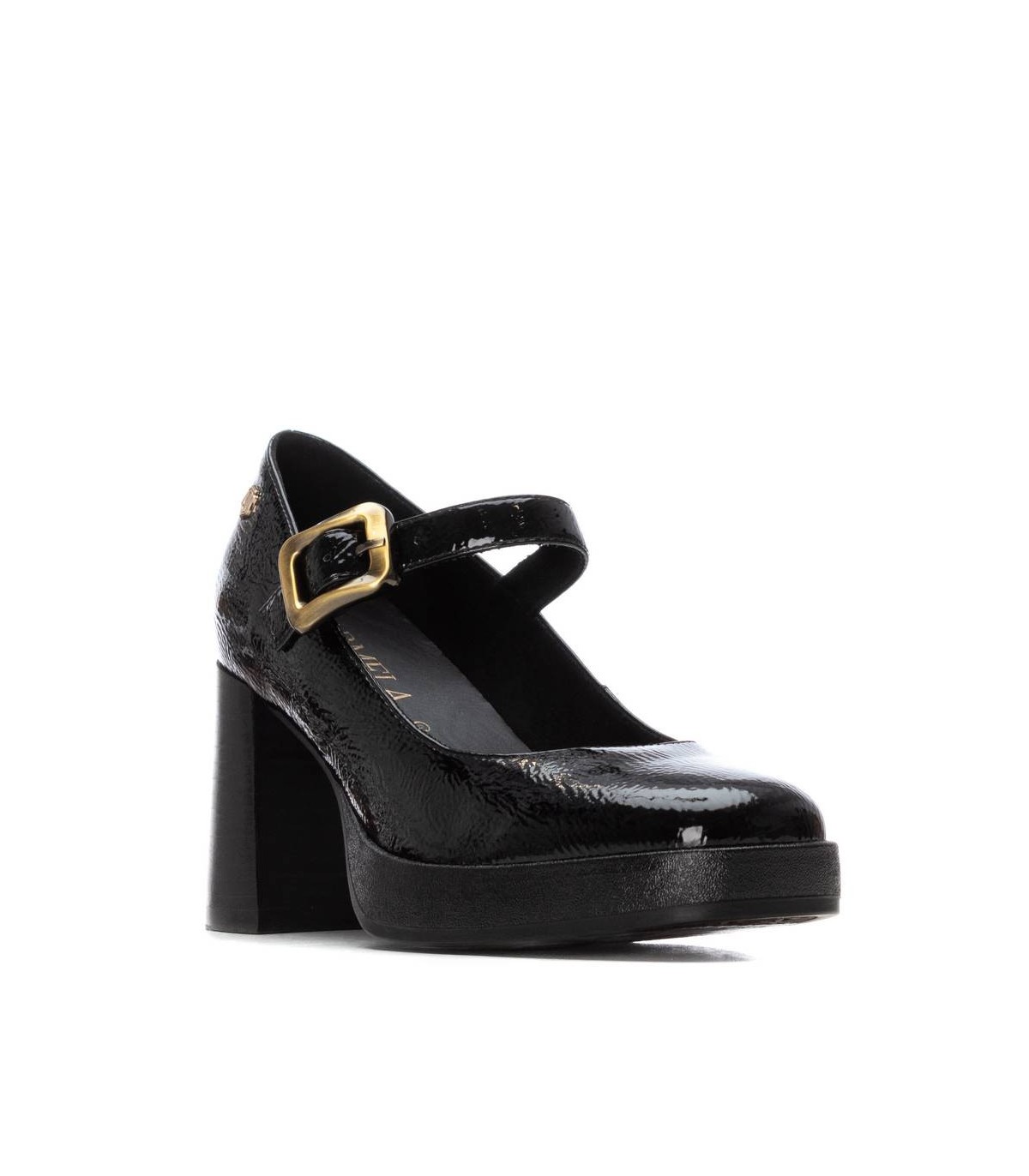 Zapato de mujer, de la marca Carmela. Fabricado en charol con cierre mediante hebilla. Suela antideslizante con tacón ancho. Plantilla extraíble.